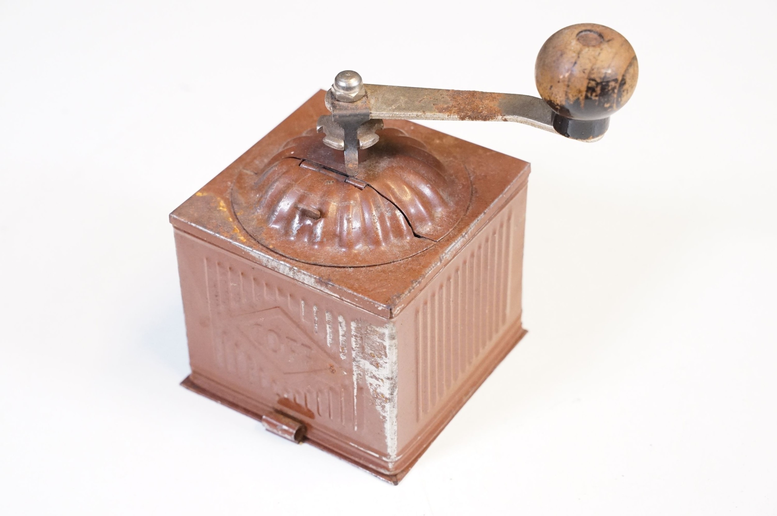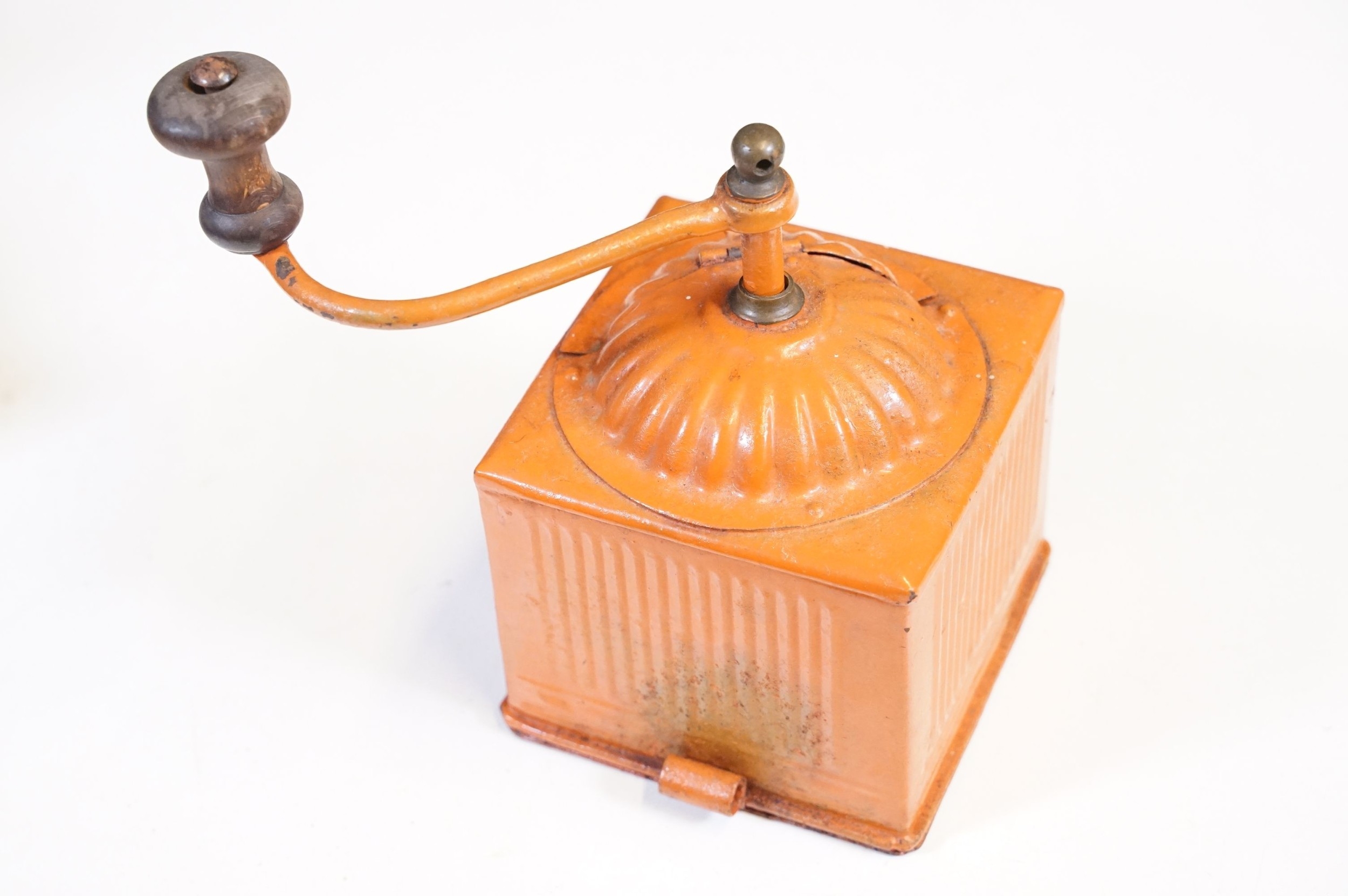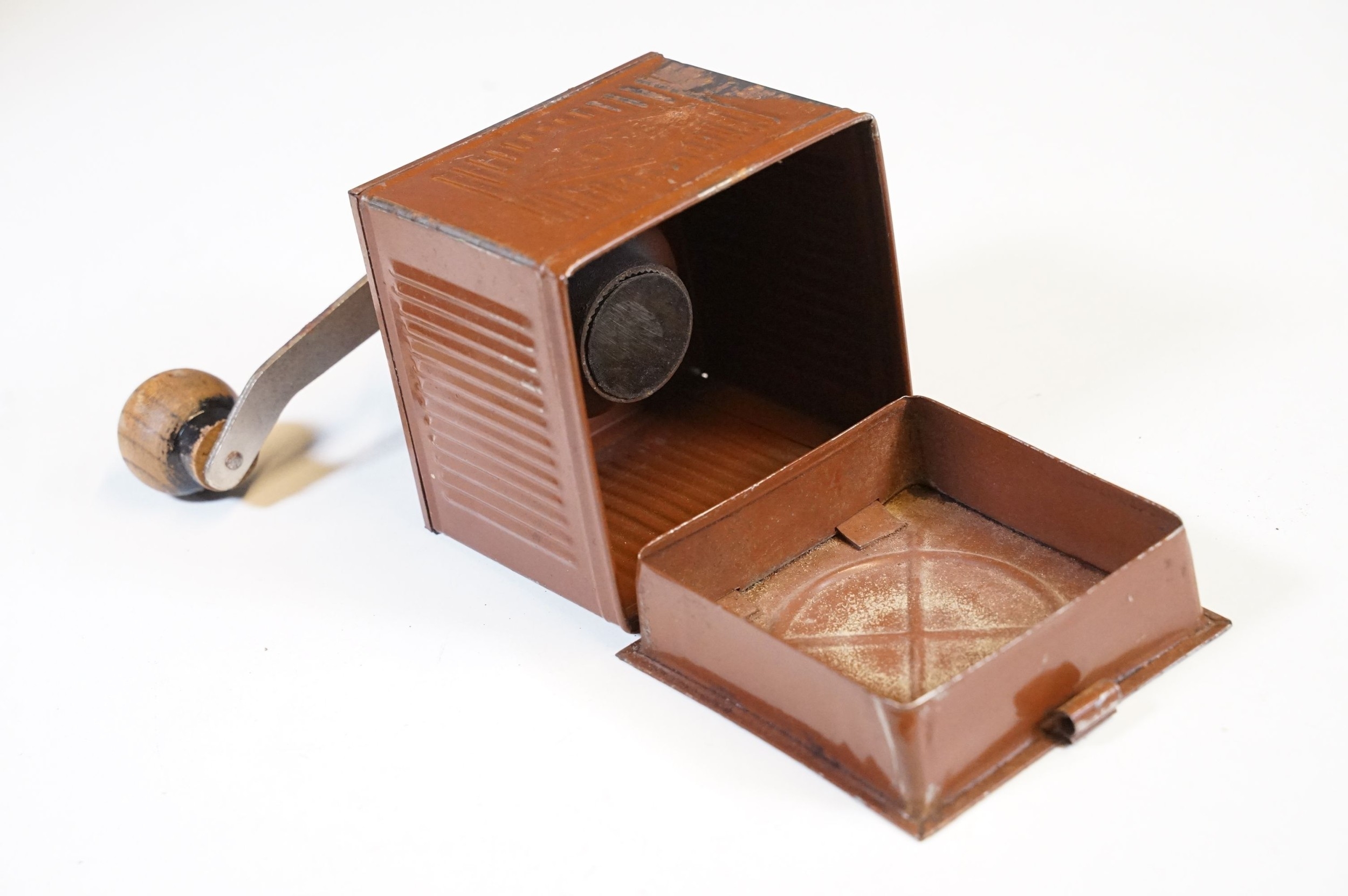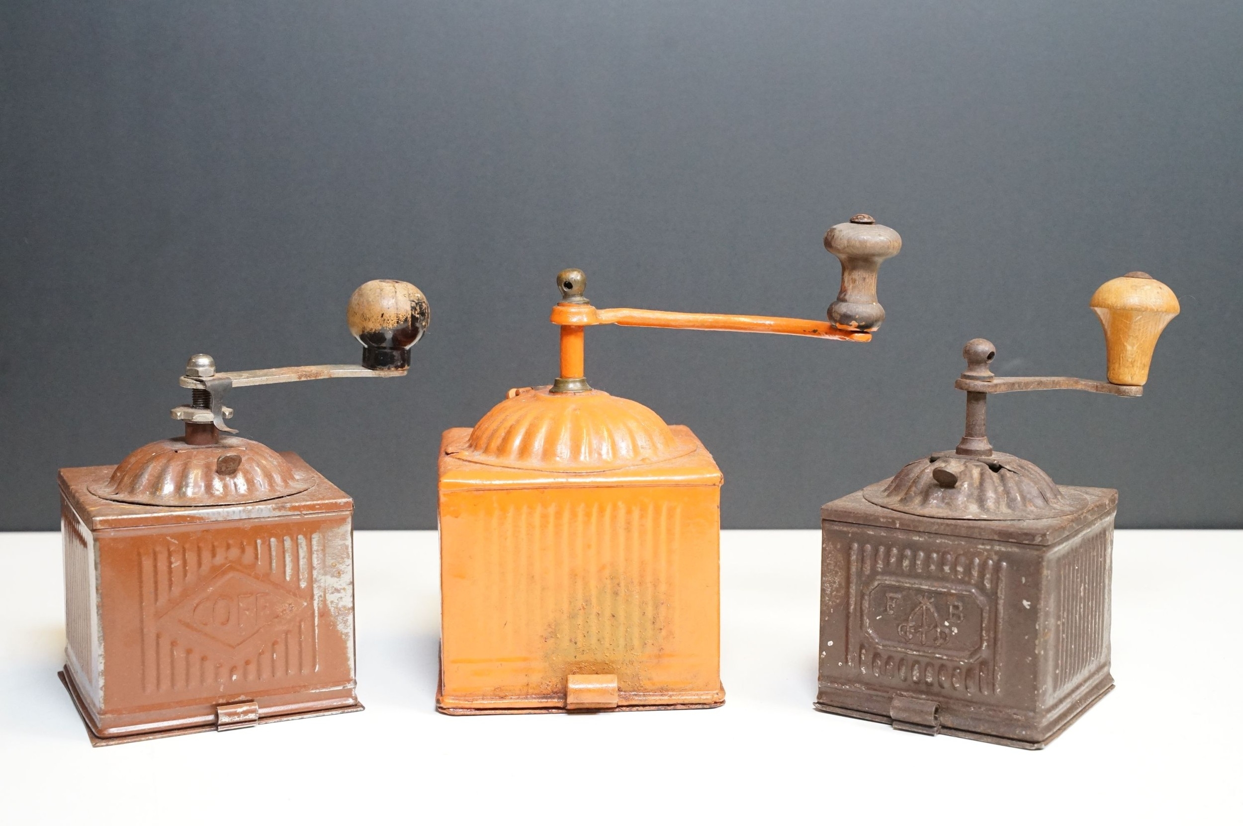 Three vintage toleware coffee grinders of graduating size, one marked F B and another Coff, the largest 18cm high