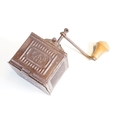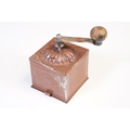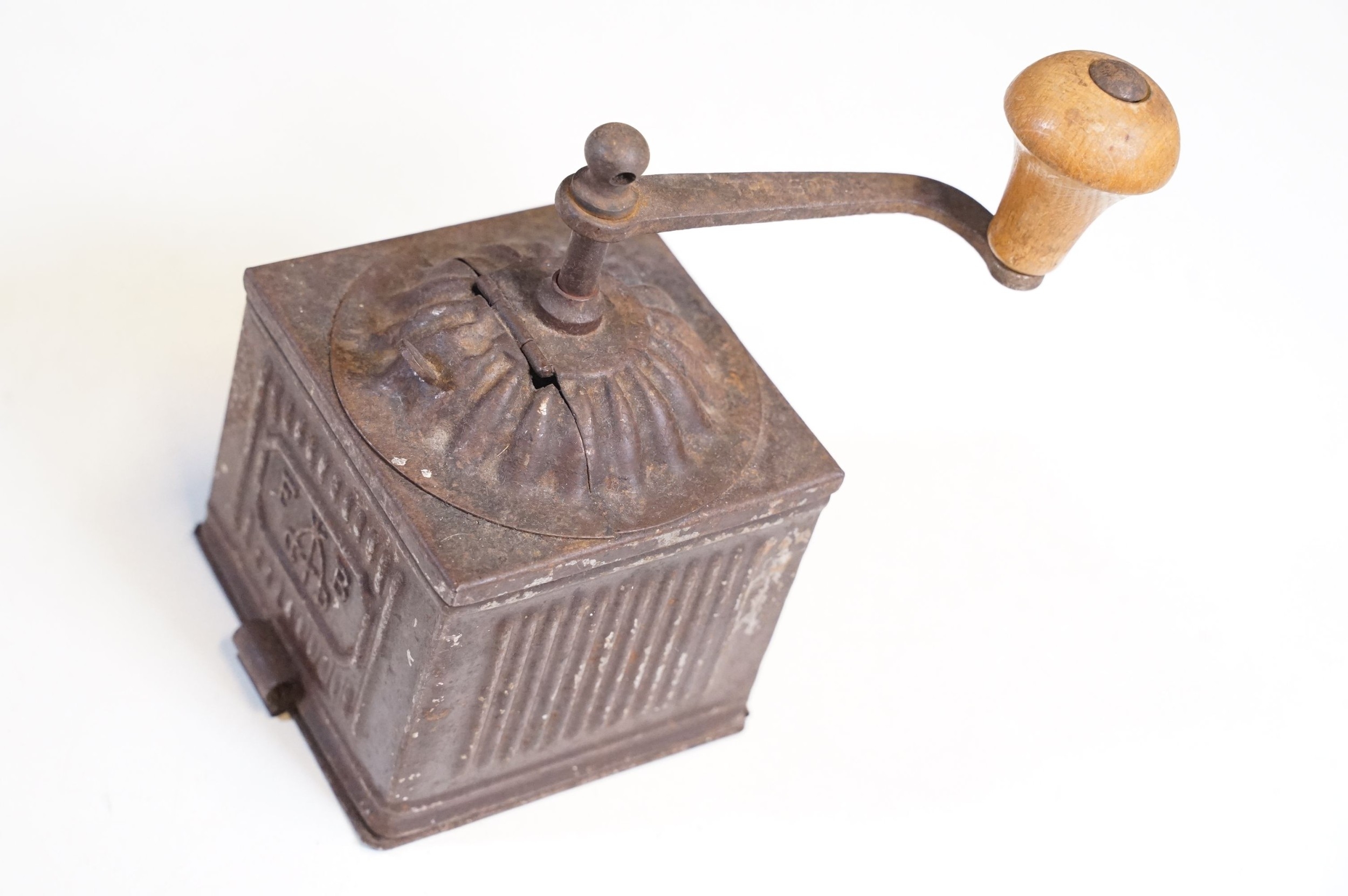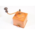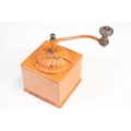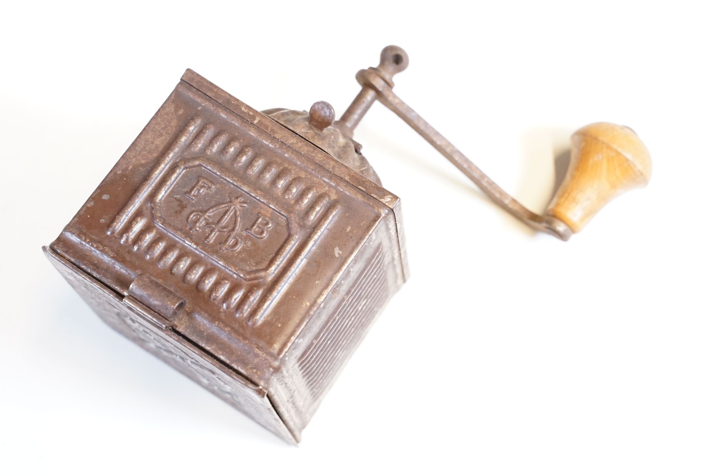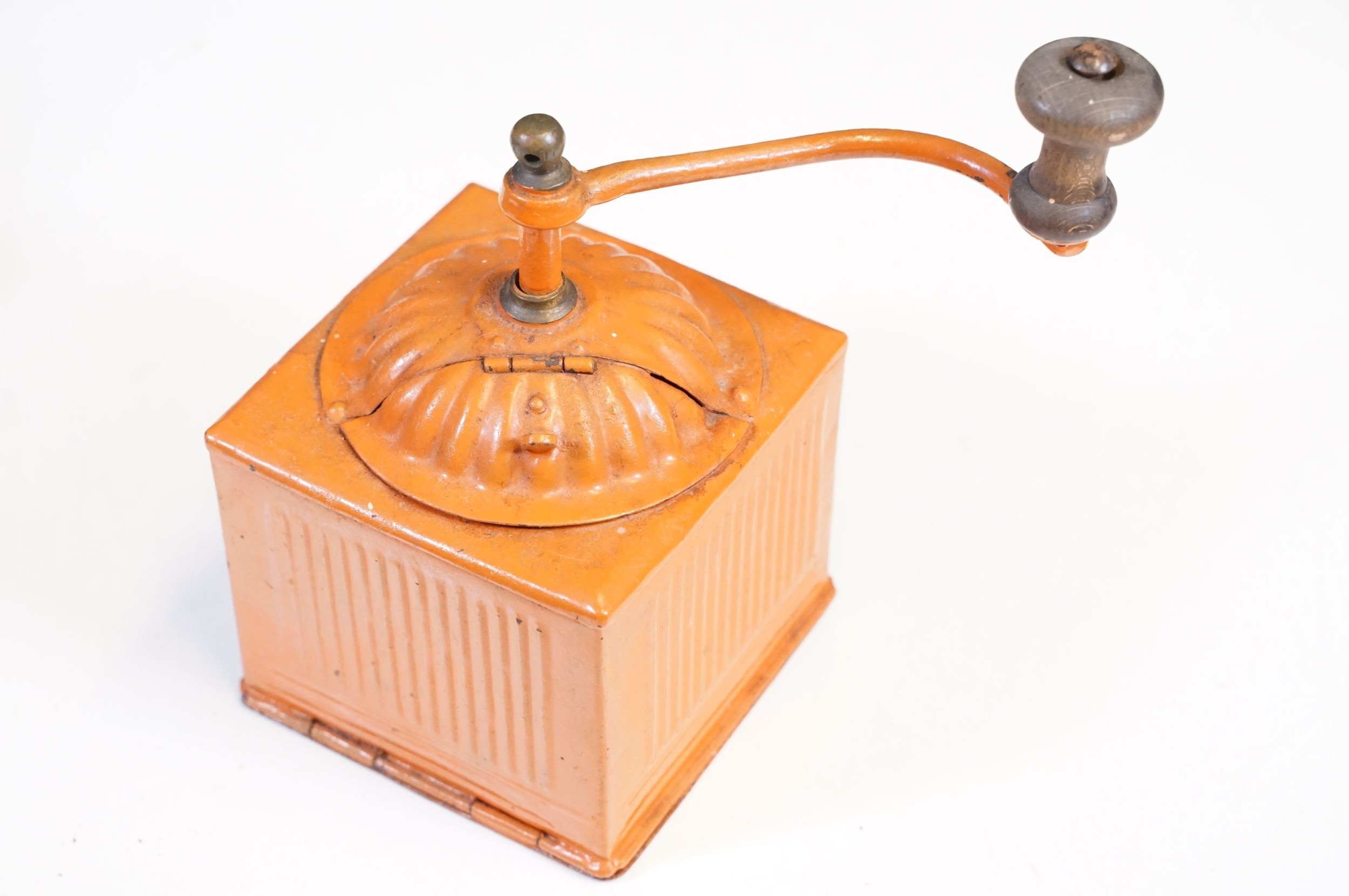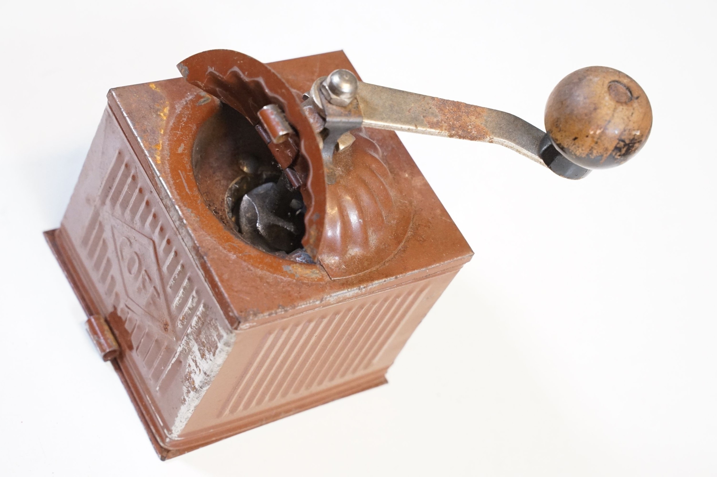 Three vintage toleware coffee grinders of graduating size, one marked F B and another Coff, the largest 18cm high