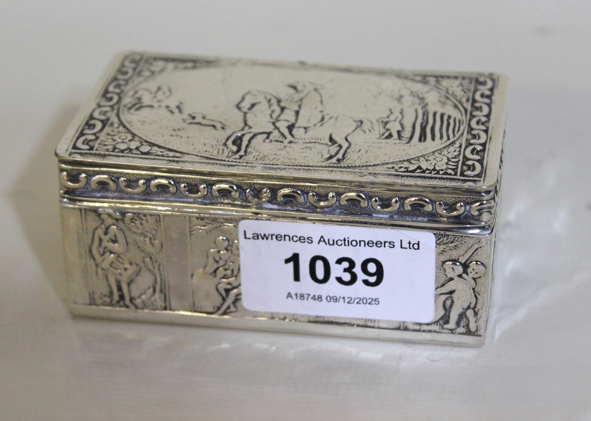 19th Century Dutch silver rectangular snuff box with hinged cover and embossed figural decoration, 8.5cm wide, 3.5oz t