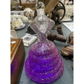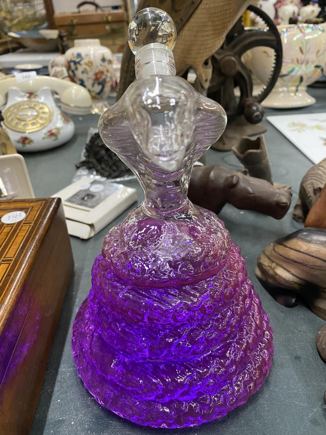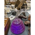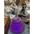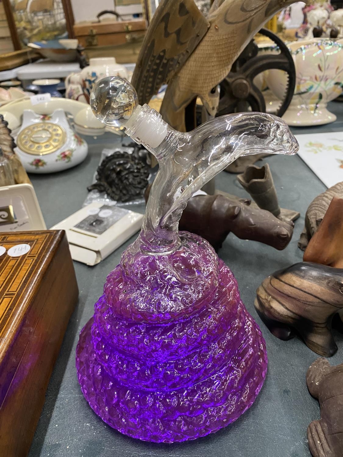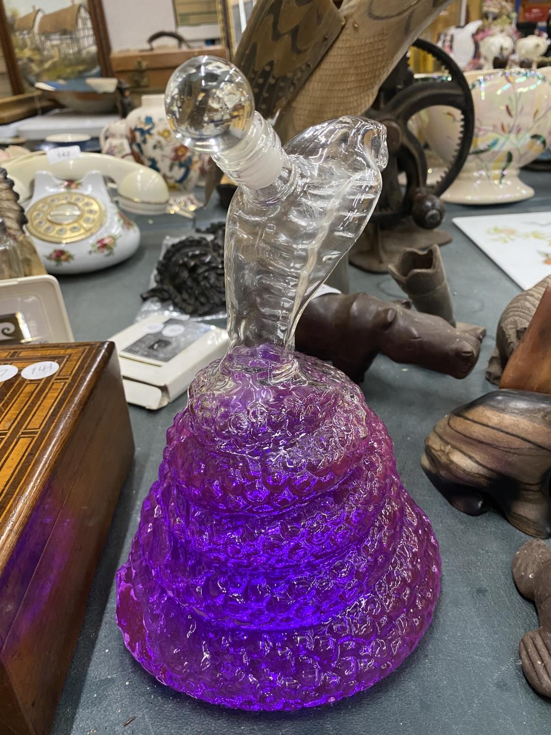 A GLASS DECANTER IN THE SHAPE OF A COBRA FILLED WITH PURPLE WATER (NOT FOR DRINKING)