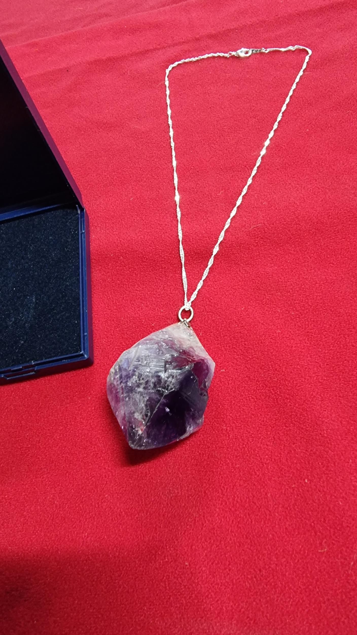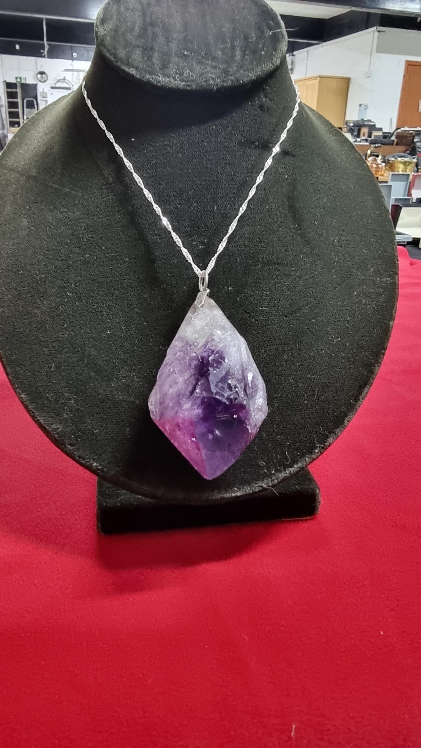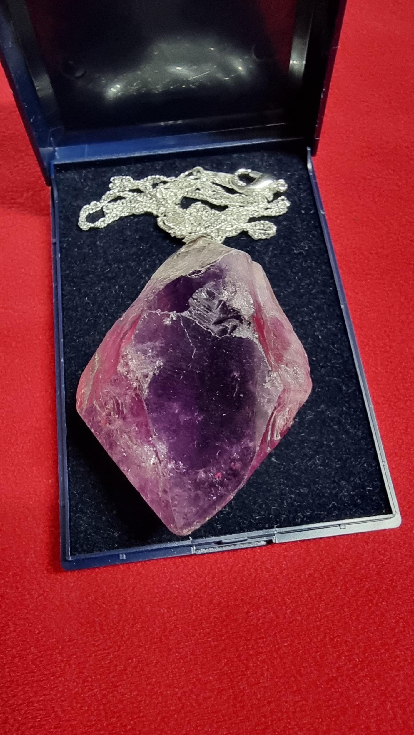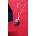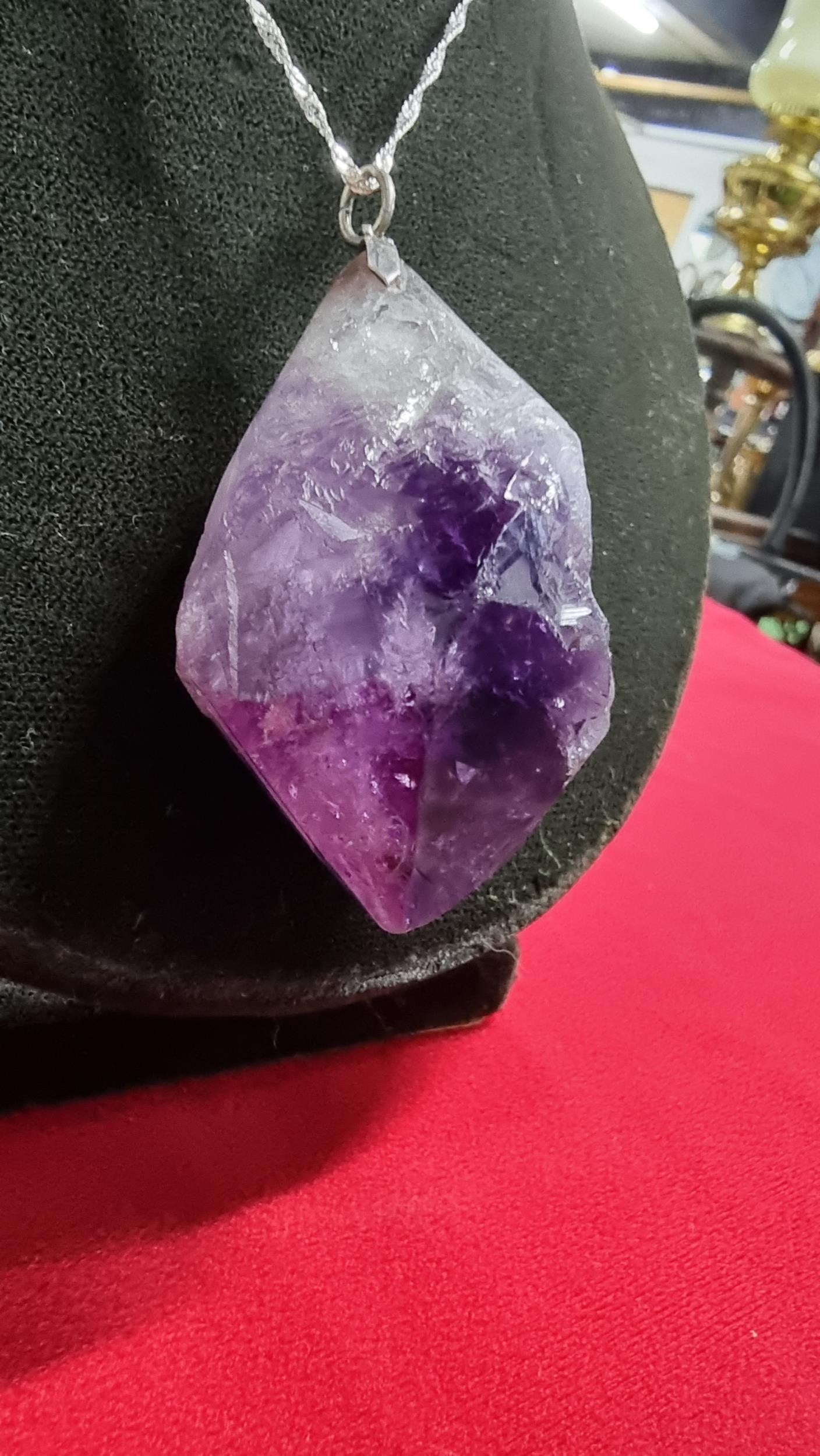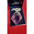 Very large and chunky pointed Amethyst pendant presenting very good deep purple to white colours set on a 18 inch 925 silver chain. Total length of the pendant is 6.5cm x width 4cm