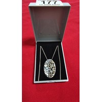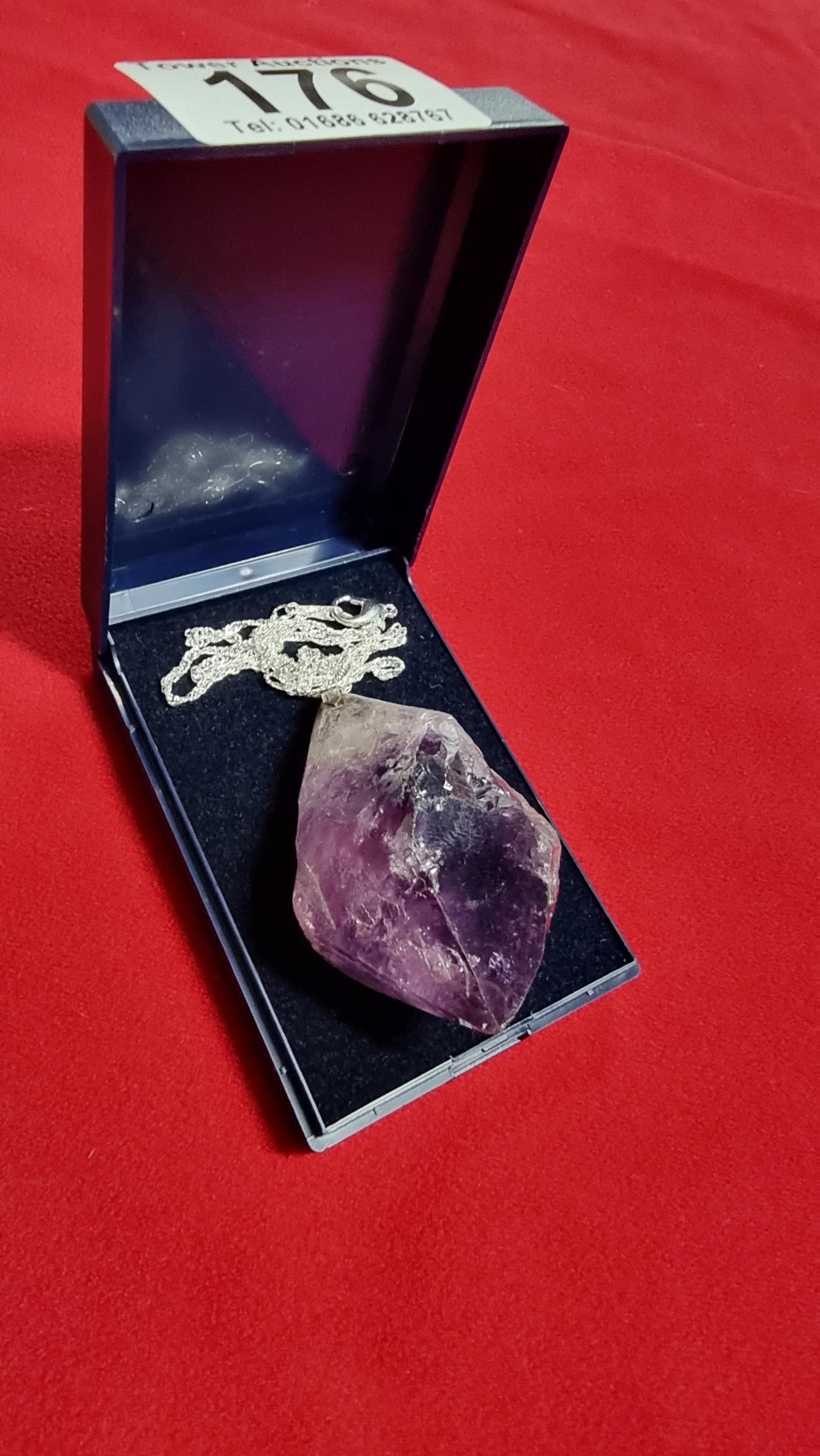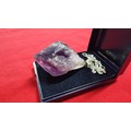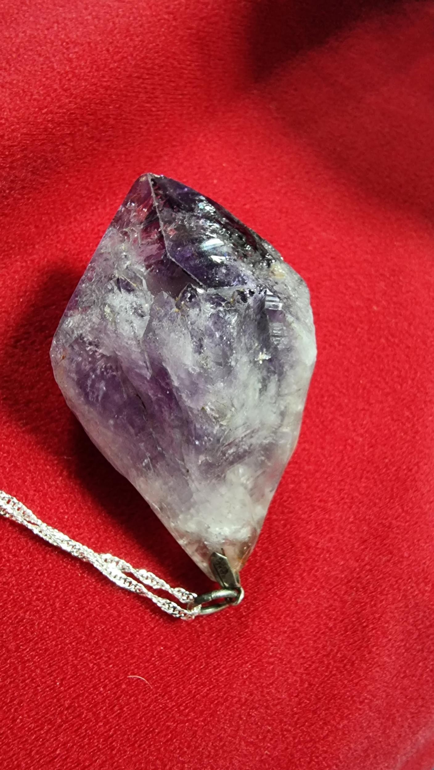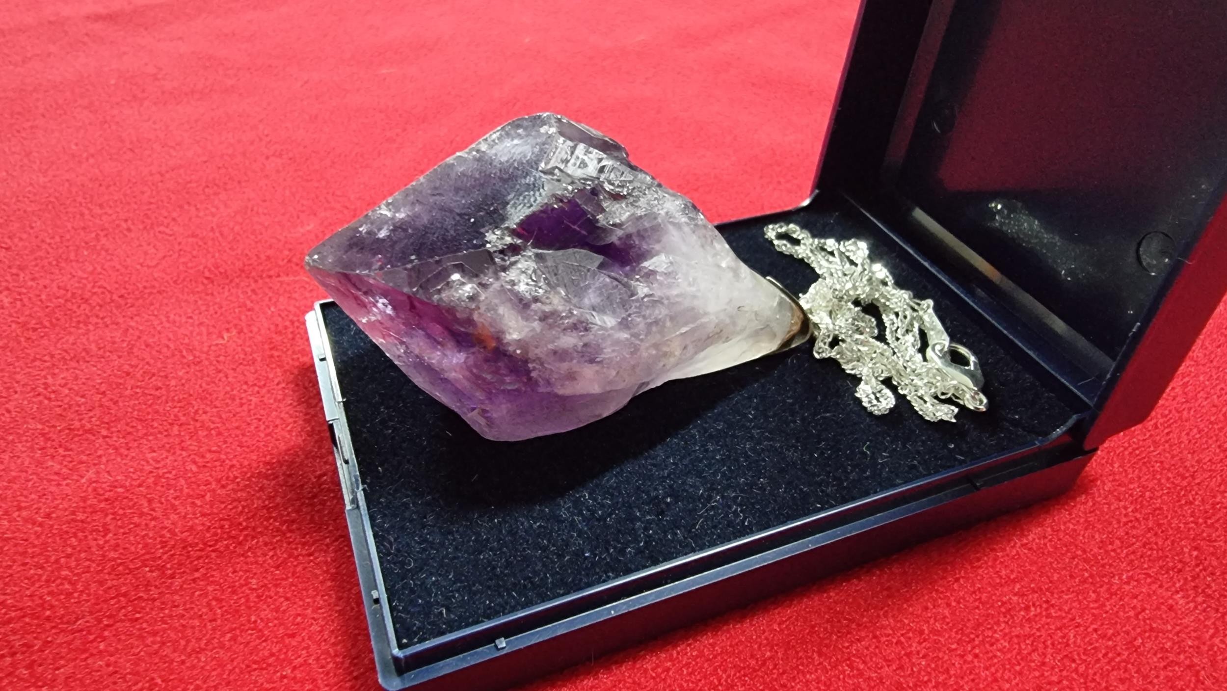 Very large and chunky pointed Amethyst pendant presenting very good deep purple to white colours set on a 18 inch 925 silver chain. Total length of the pendant is 6.5cm x width 4cm
