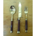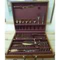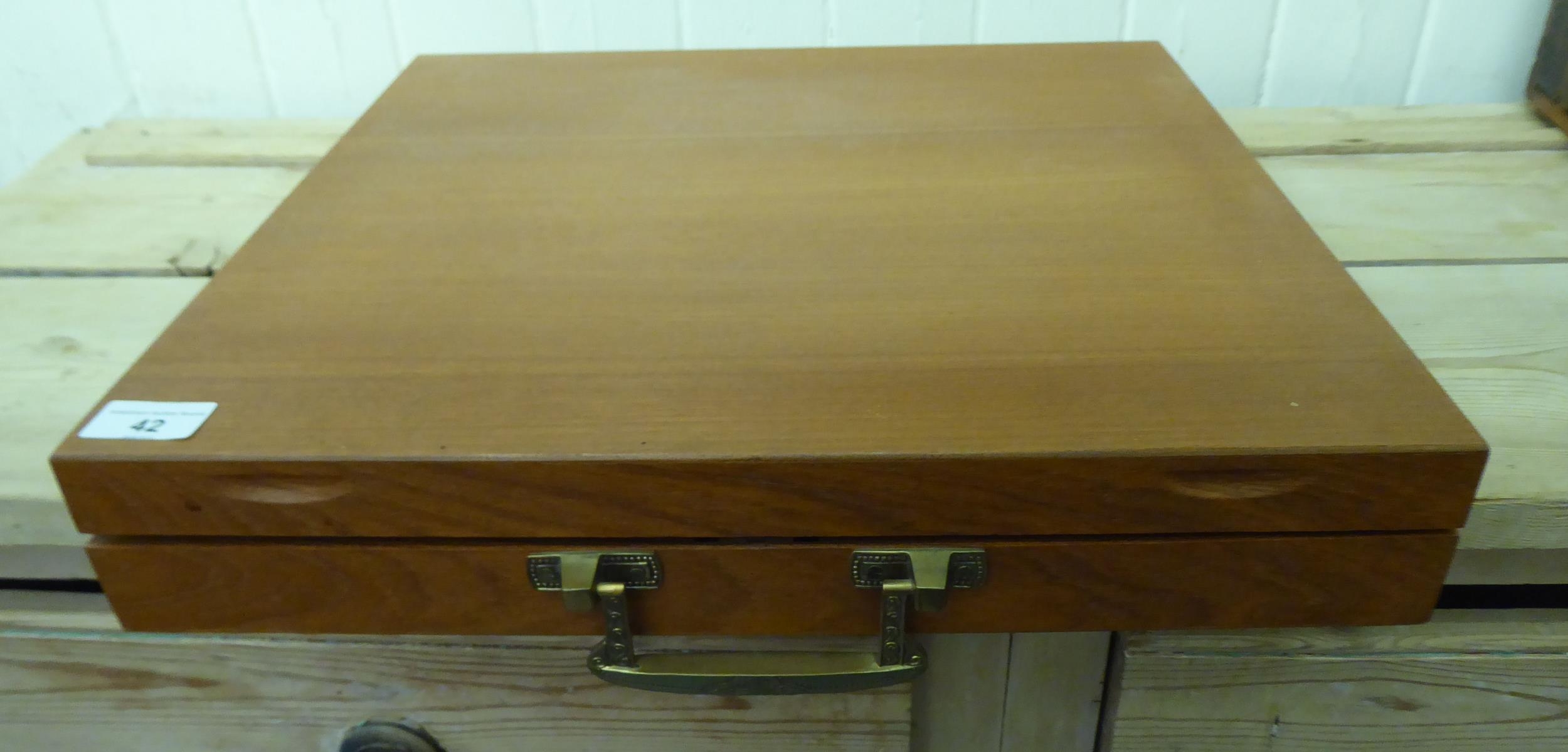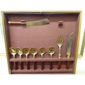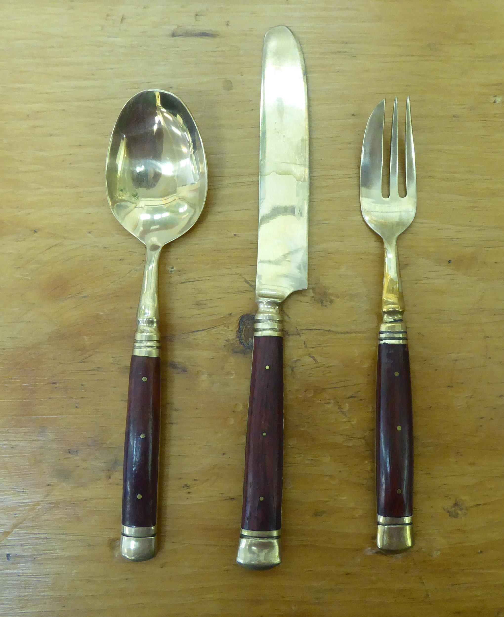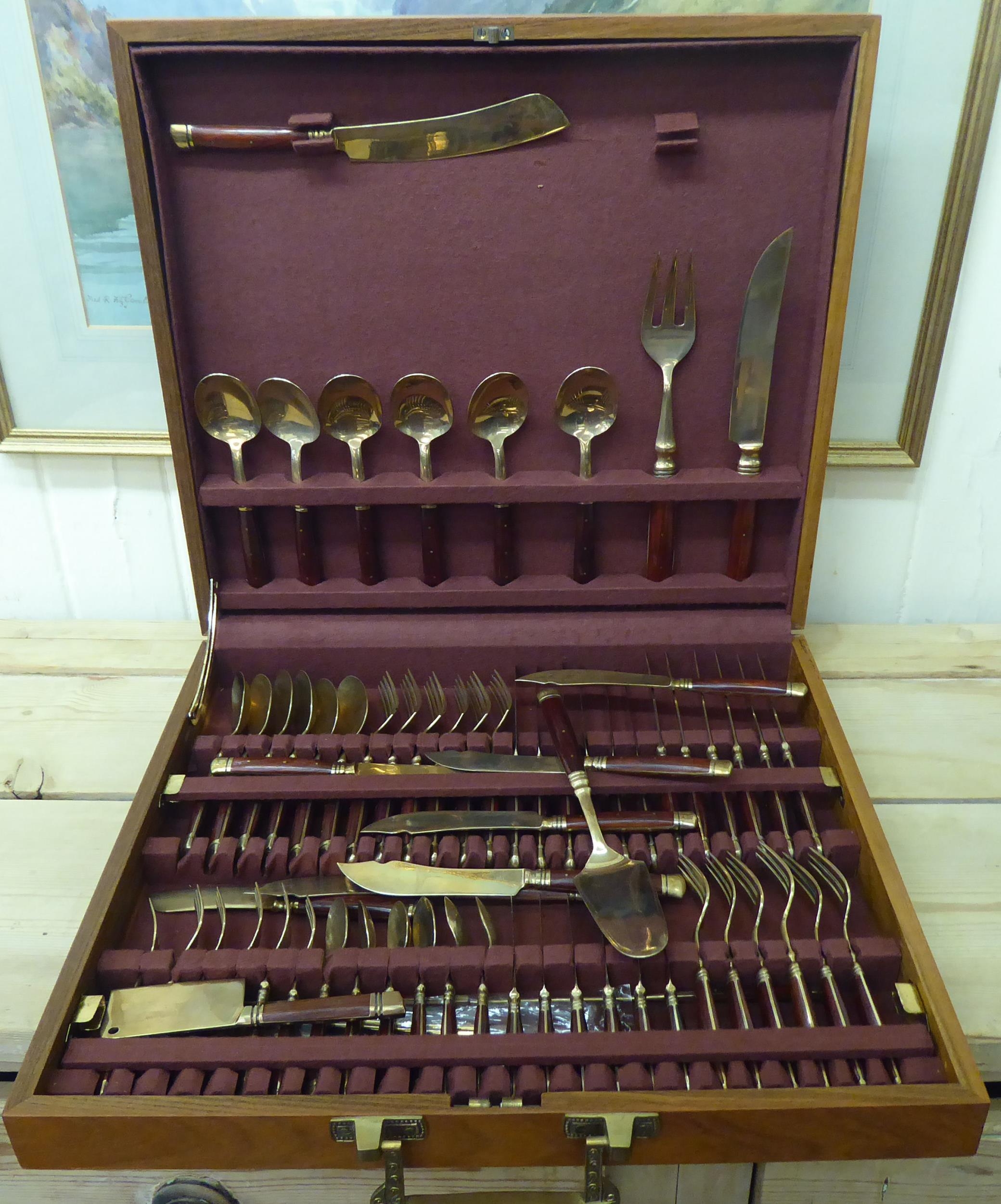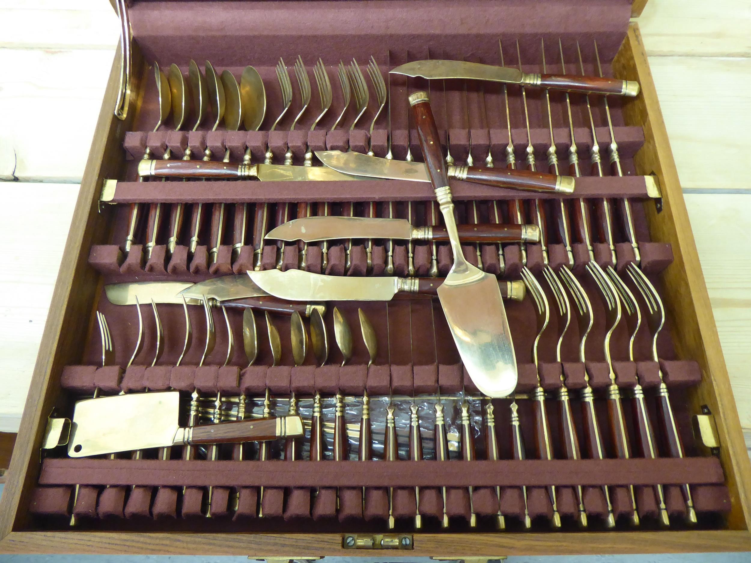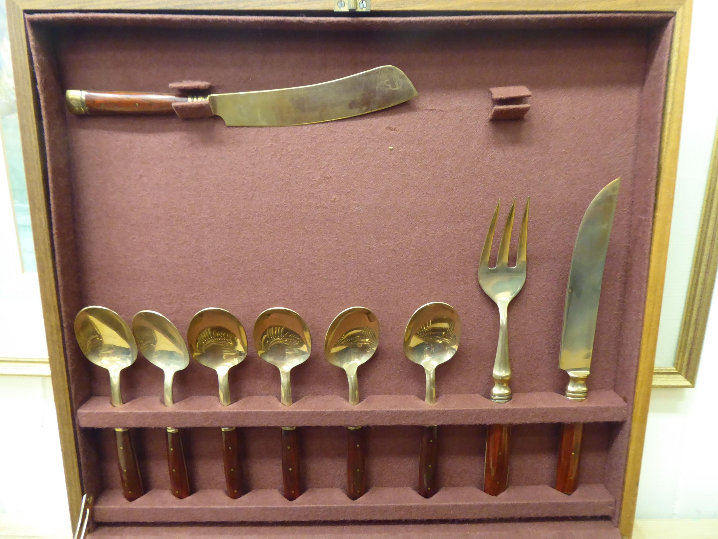 An Indonesian gilt brass canteen with rivetted hardwood handles, in a fitted case