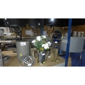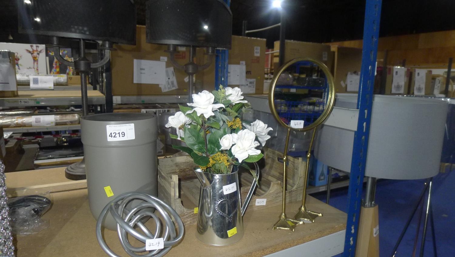 1 metal jug containing artificial white roses, 1 small round mirror with metal bird legs frame, a wooden 4 bottle tray, 1 small plastic bin and 1 metal sculpture / paper weight