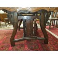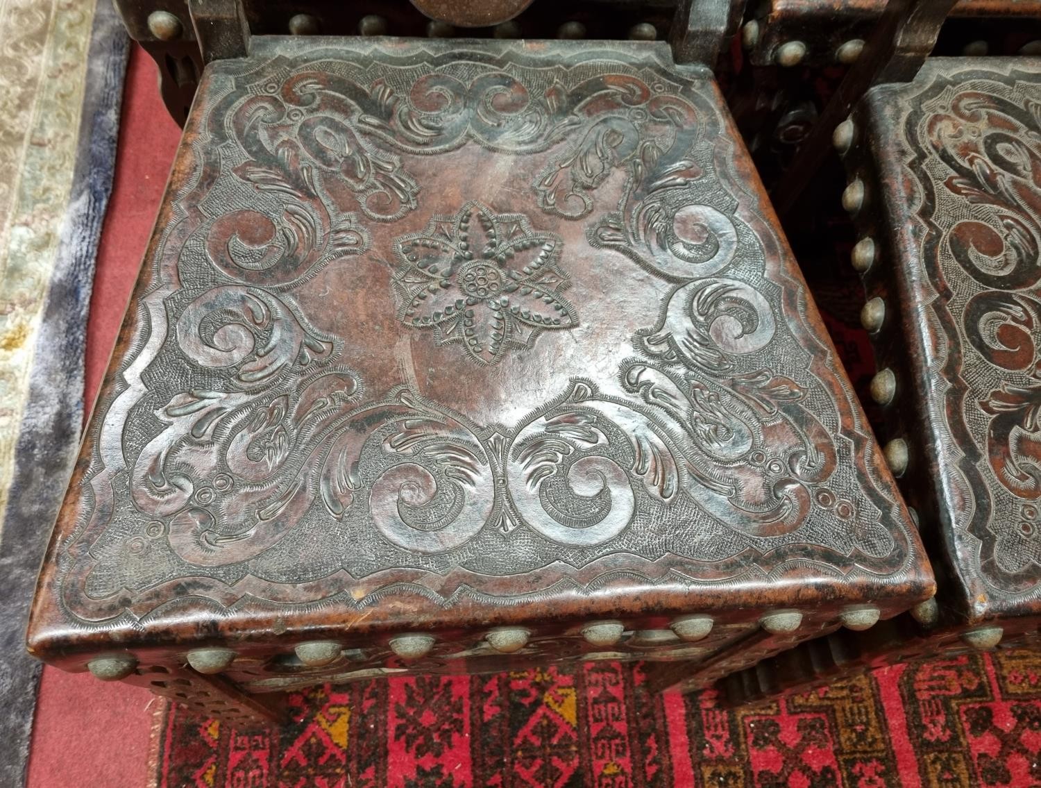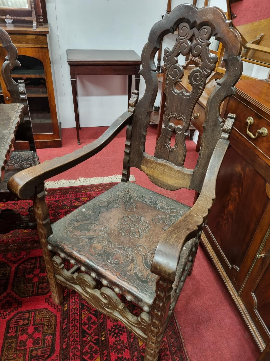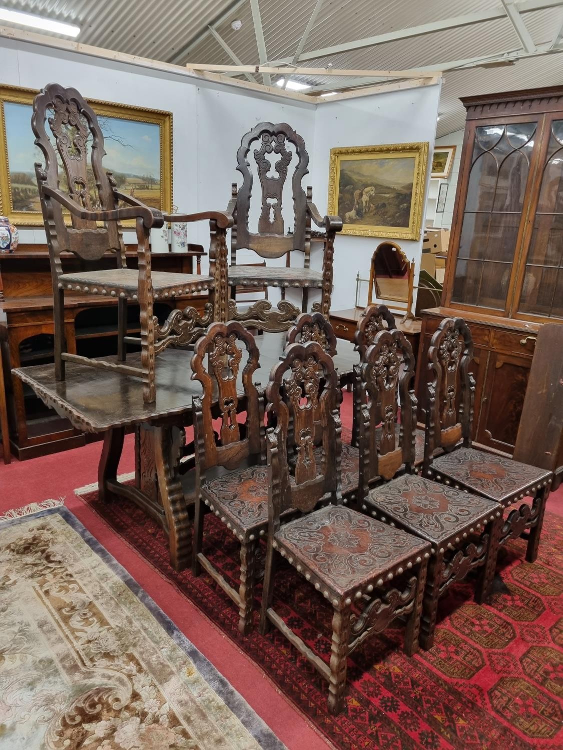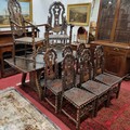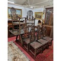 A 20th Century Hardwood Dining room suite consisting of a pull out Table with two leaves H 77 x D 92 x W 184 cm approx., a set of eight chairs H 45 x D 40 x W 46 cm approx. to include two carvers H45 x D 53 x W 55 cm approx. with highly embossed leather seats.