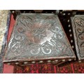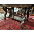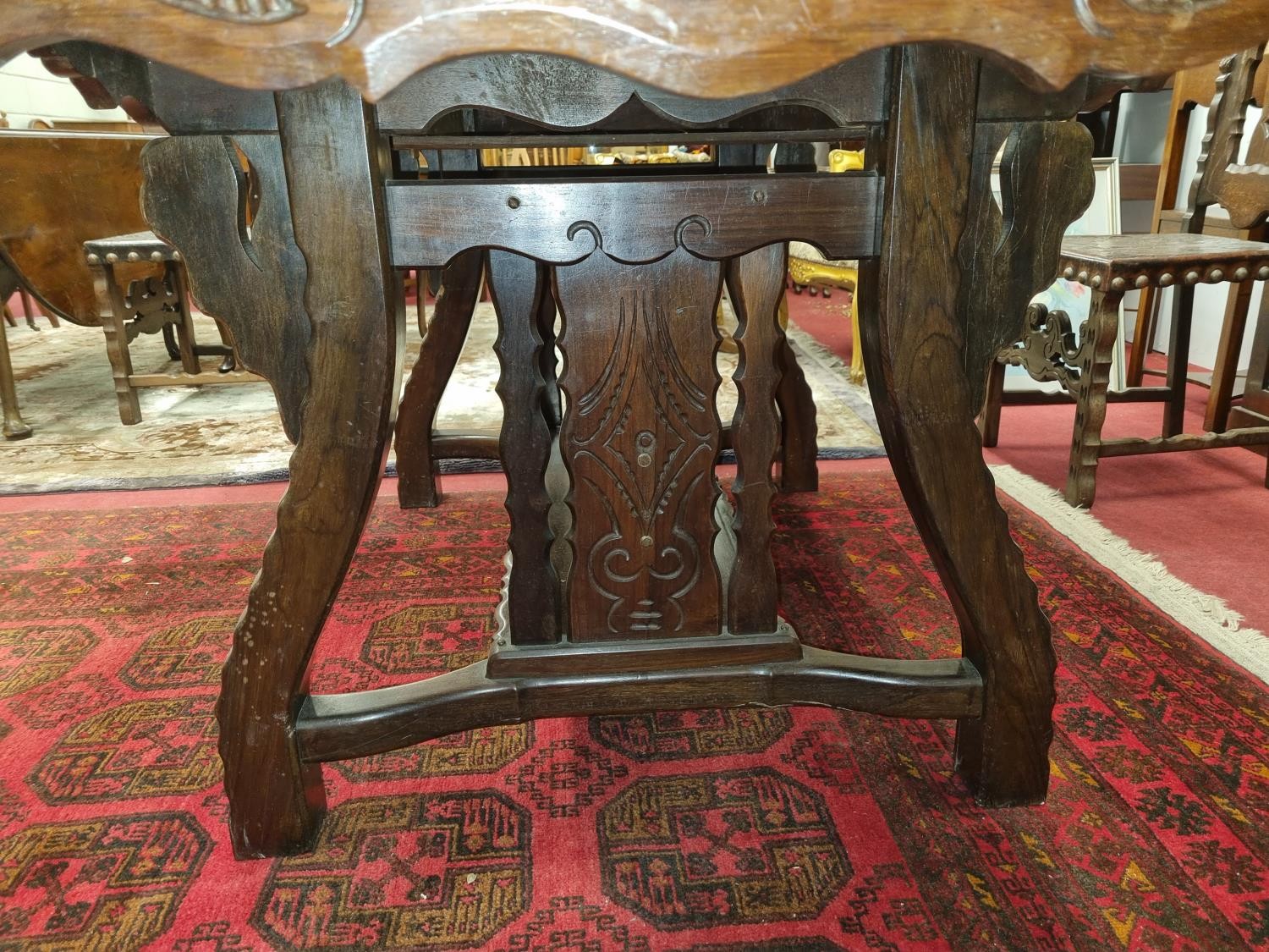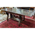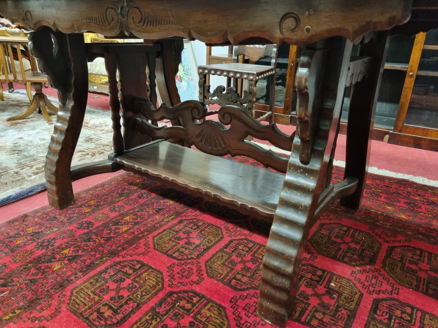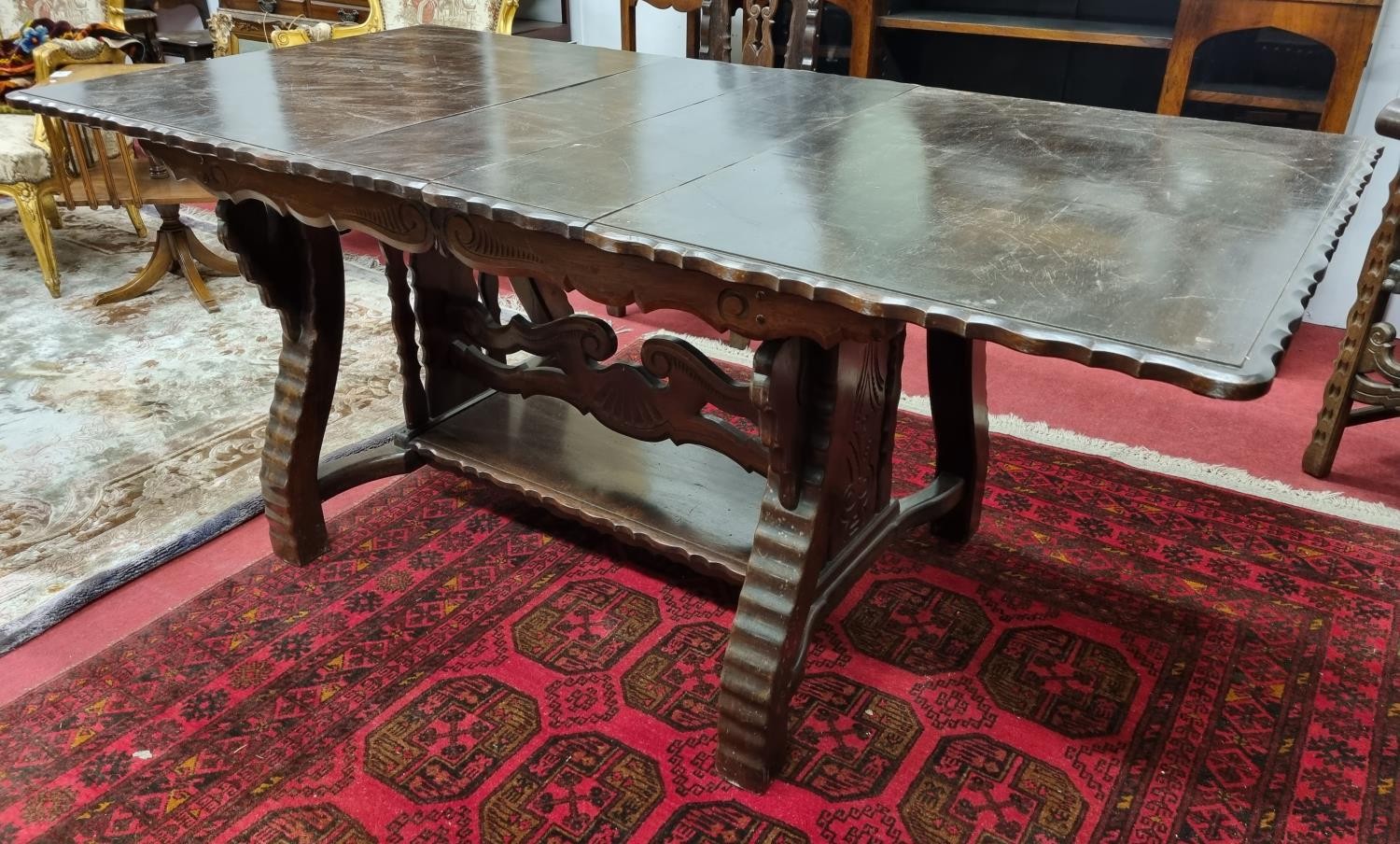 A 20th Century Hardwood Dining room suite consisting of a pull out Table with two leaves H 77 x D 92 x W 184 cm approx., a set of eight chairs H 45 x D 40 x W 46 cm approx. to include two carvers H45 x D 53 x W 55 cm approx. with highly embossed leather seats.