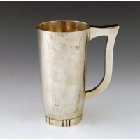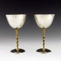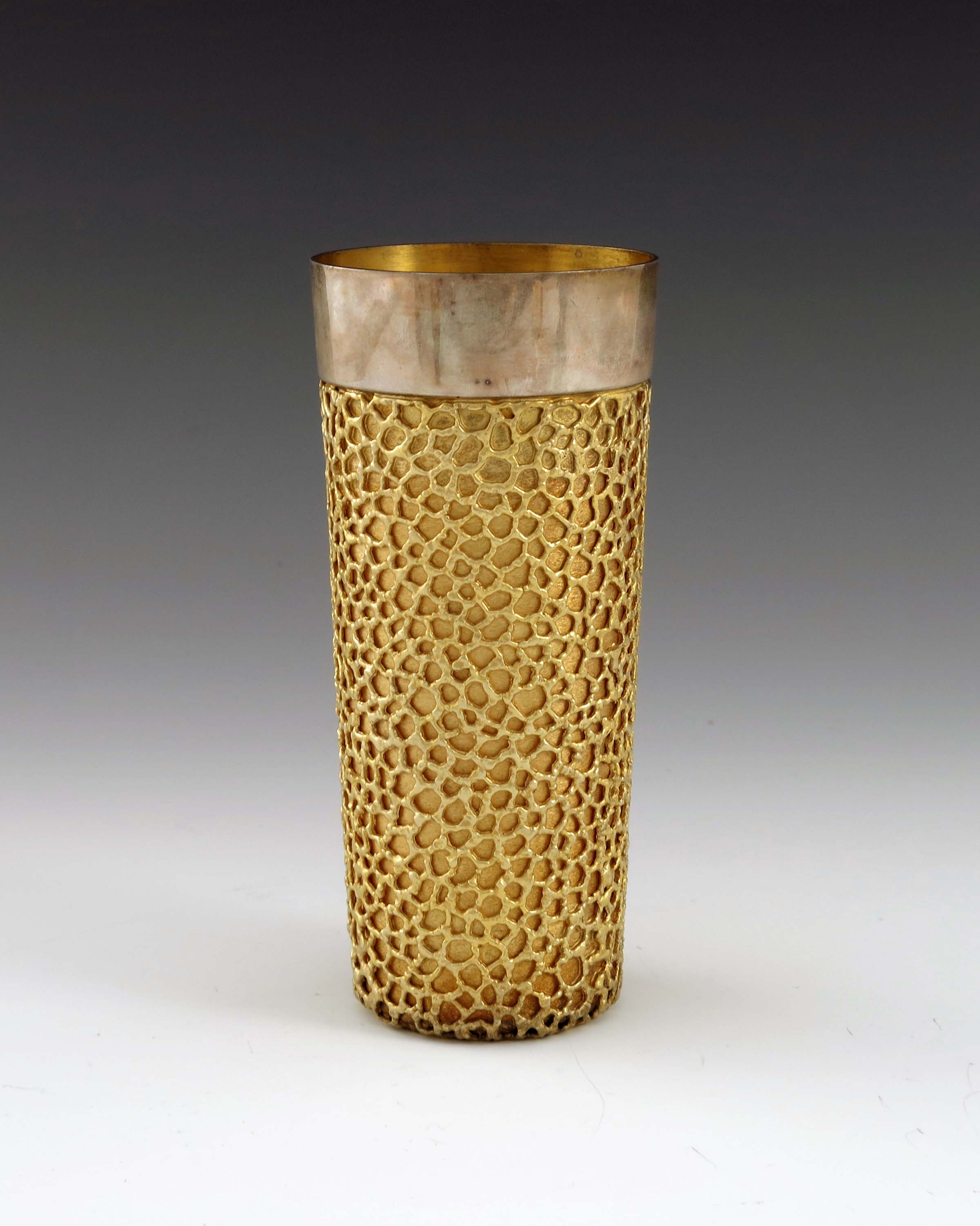 Stuart Devlin, a Modernist silver and parcel gilt beaker, London1973, tall cylindrical form, overlaid with a cast rusticated trellis design, below a plain rim, 14cm high, 10.45ozt