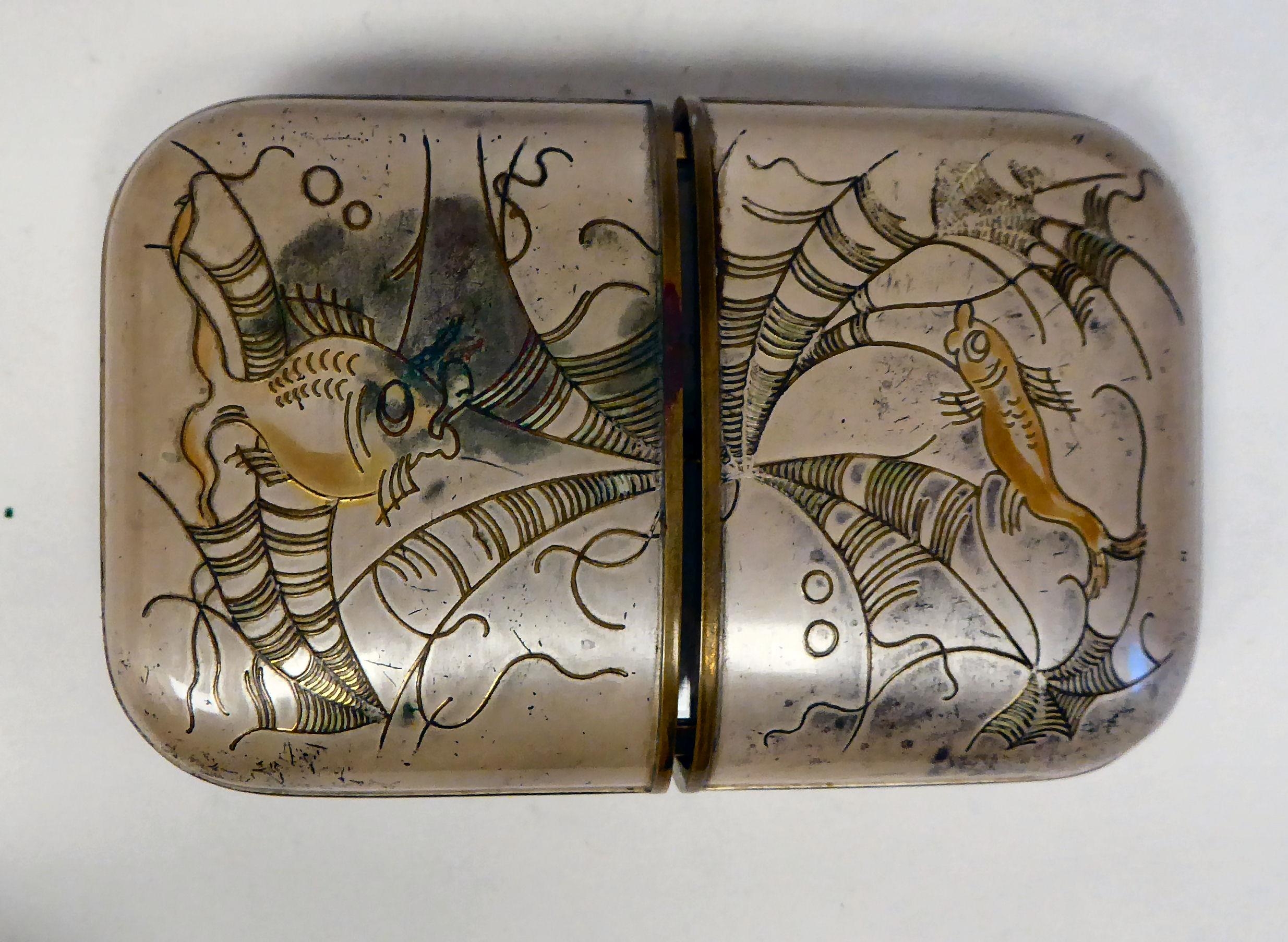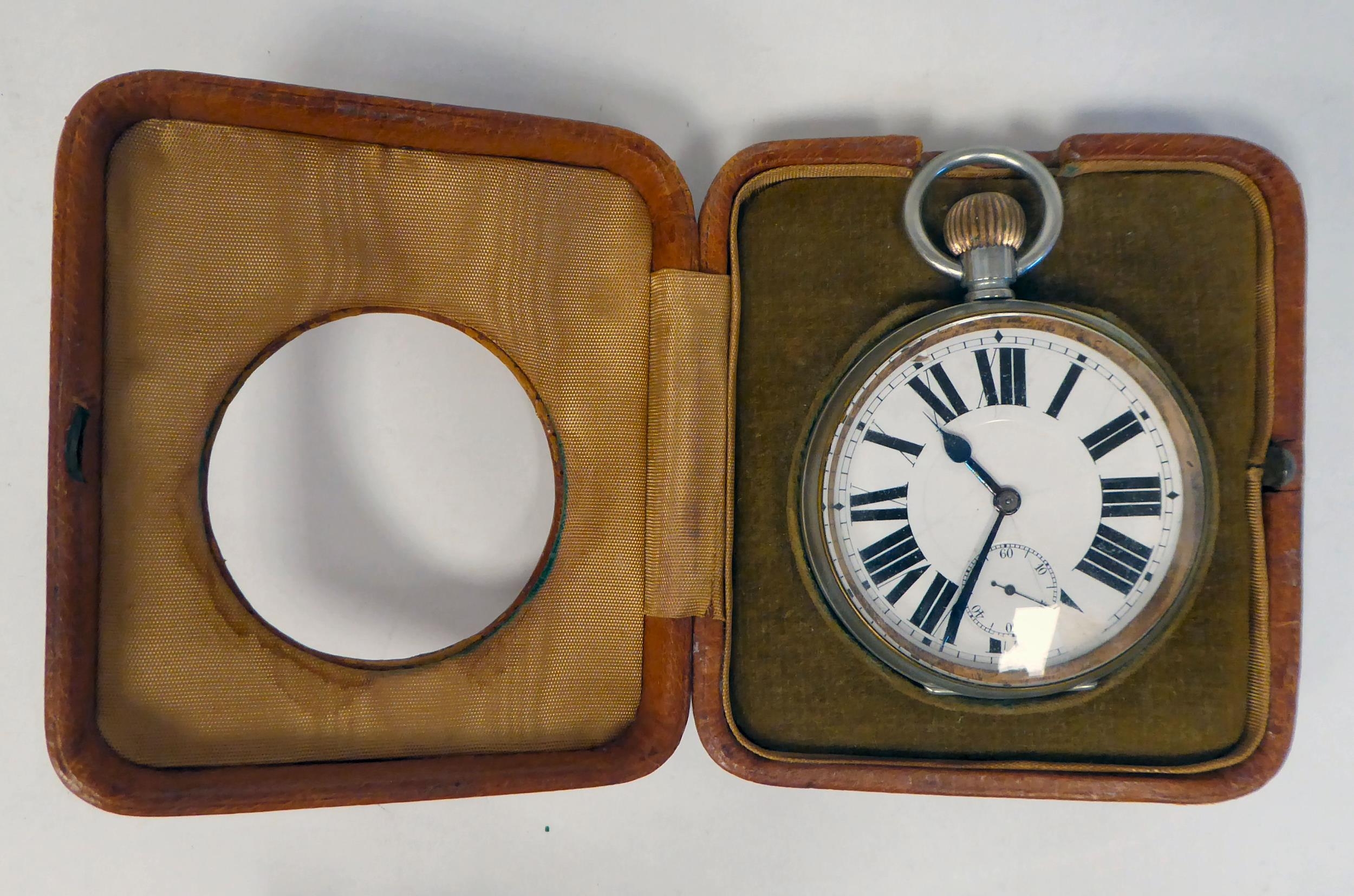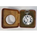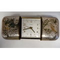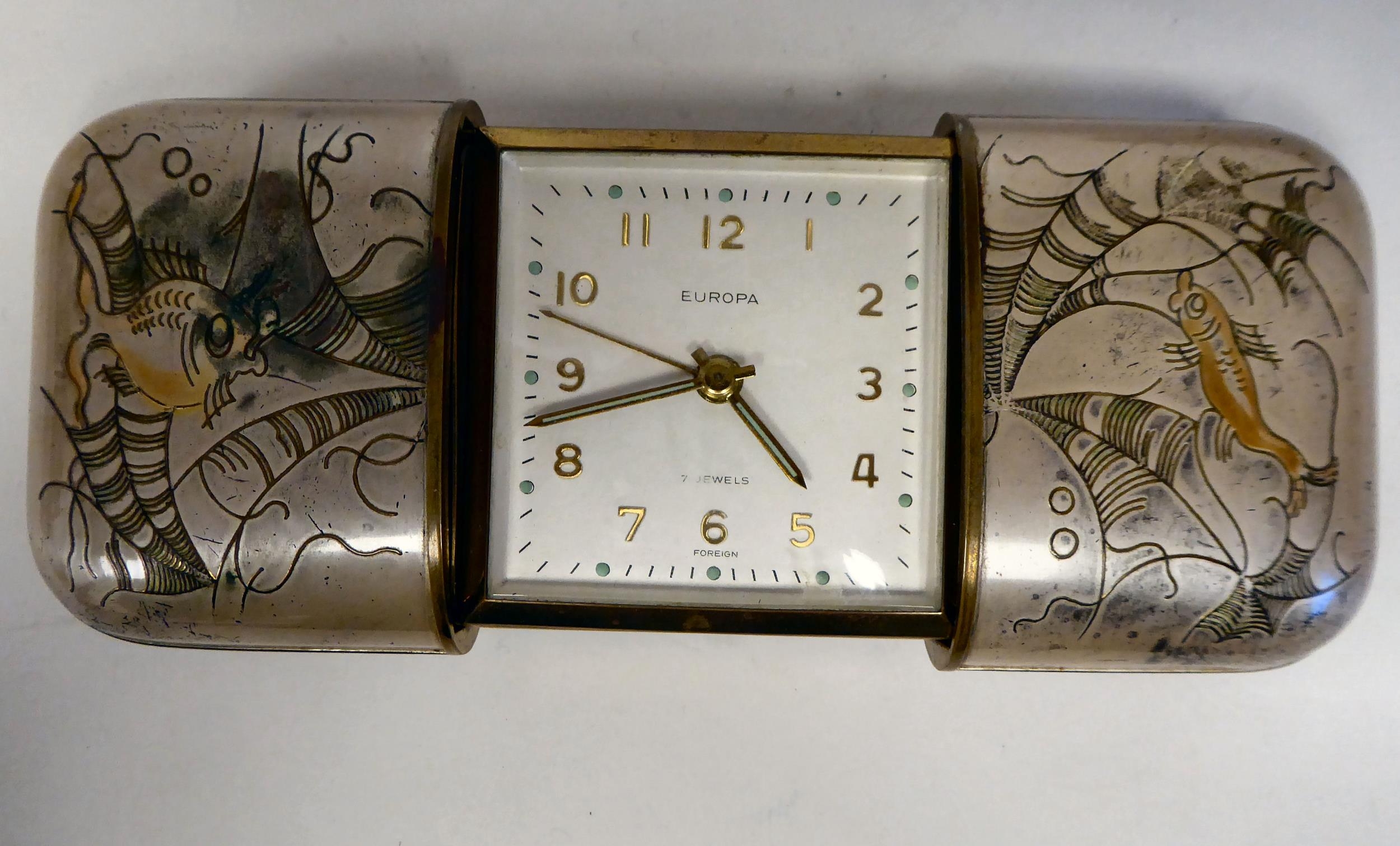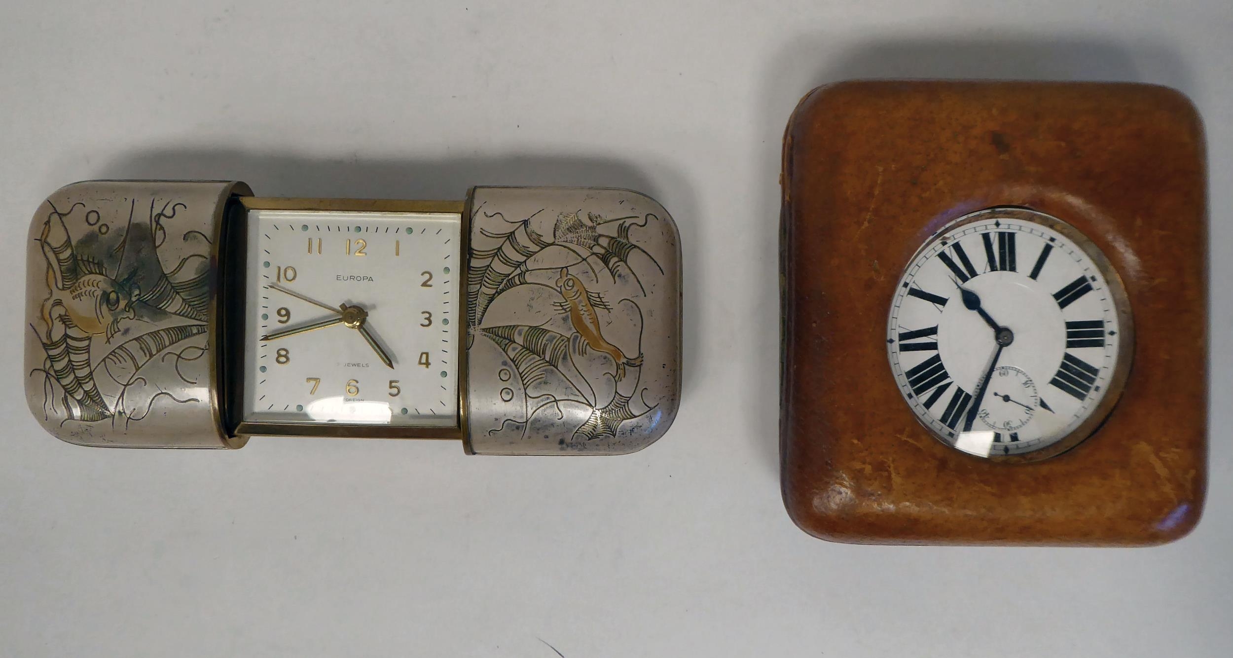 A Europa traveller's timepiece, having an integral sliding, two-part lacquered brass and coloured enamelled case, ornamented with stylised fish, the 7 jewel movement faced by an Arabic dial and an alarm; and a Goliath vintage traveller's timepiece, in a stainless steel case, faced by an enamelled Roman dial and subsidiary, in a moulded pigskin outer case
