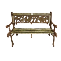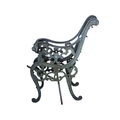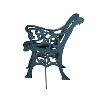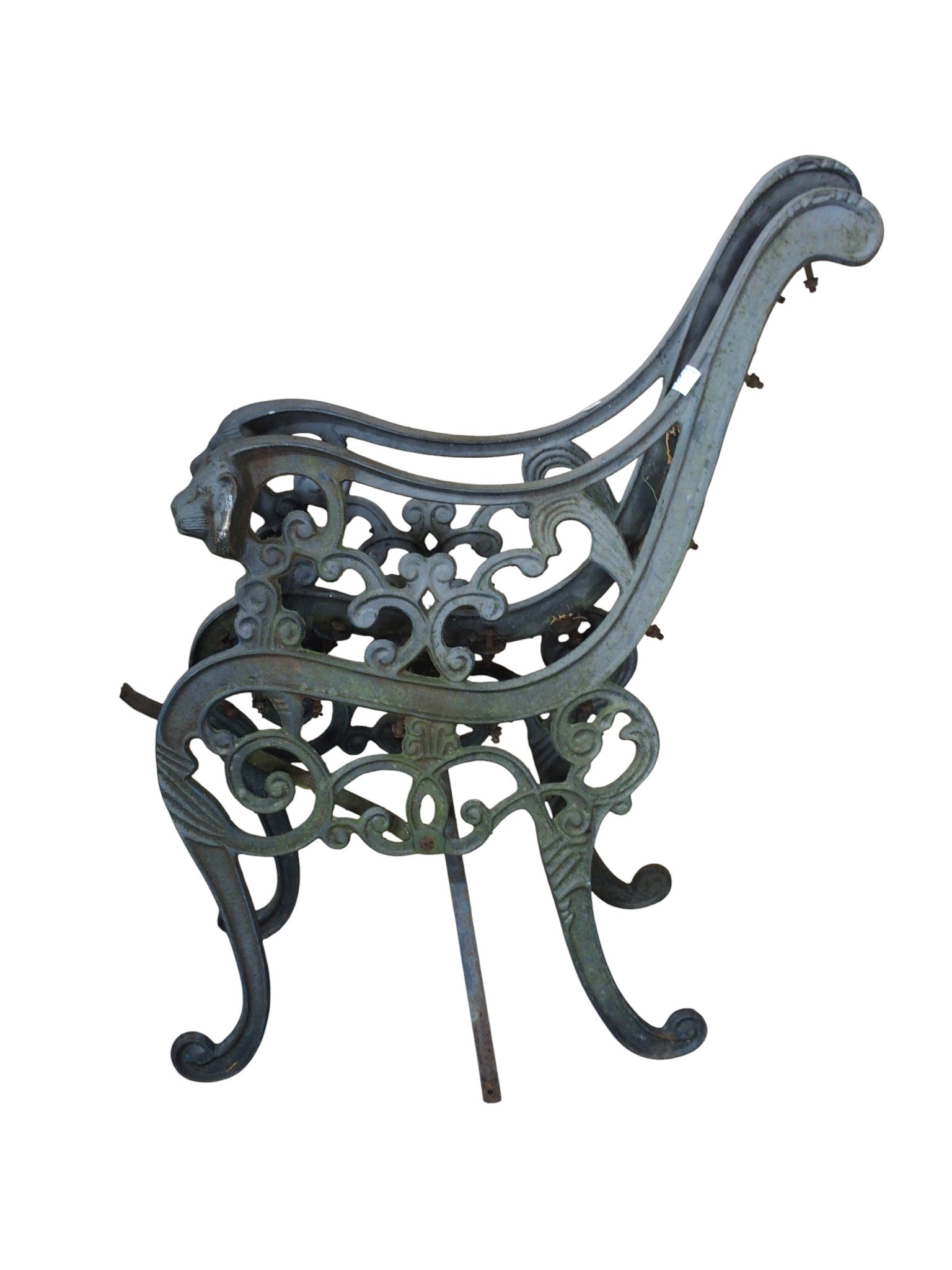 A pair of gray painted cast metal bench ends with scrolled design with lion masque armrests, 76cm high x 62cm deep