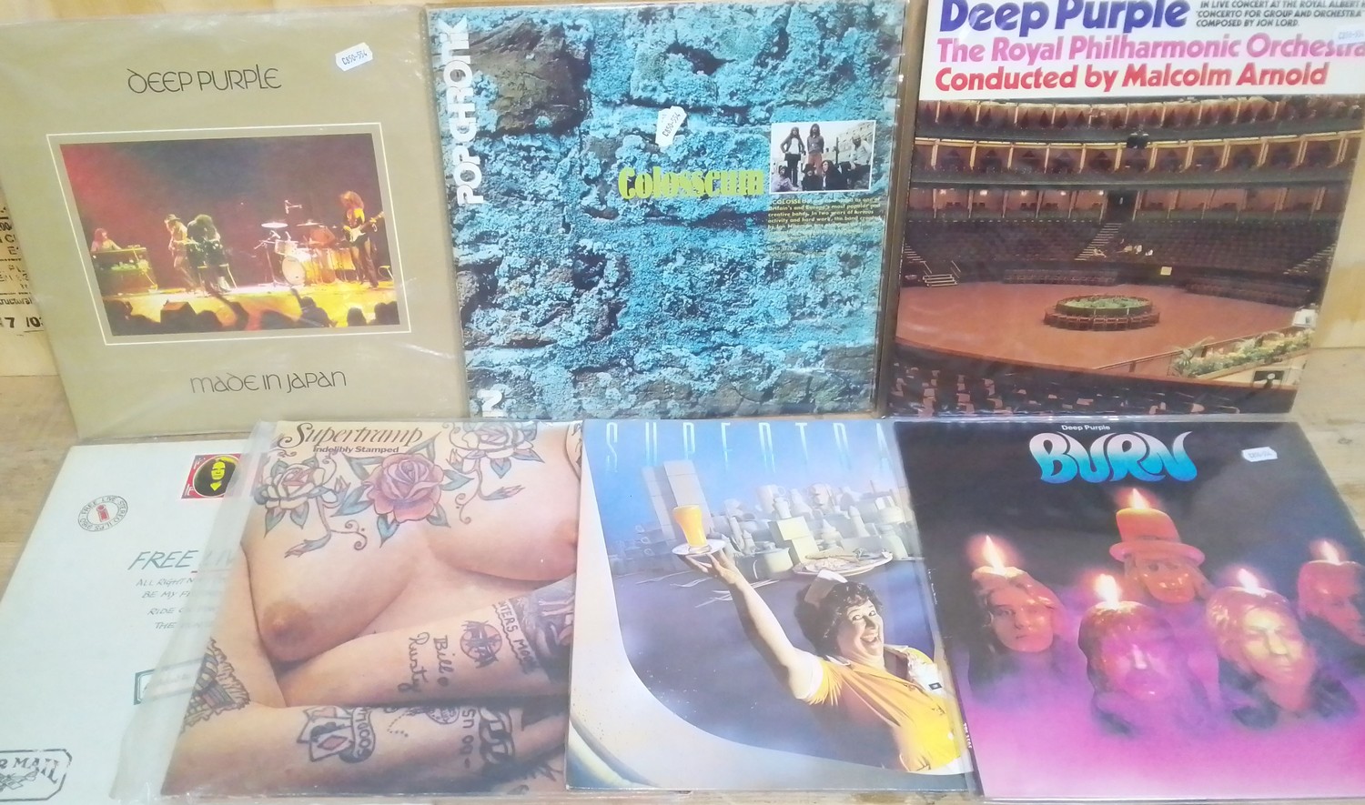 Seven 1970s rock vinyl LP records, Deep Purple, Supertramp, Free & Colloseum.