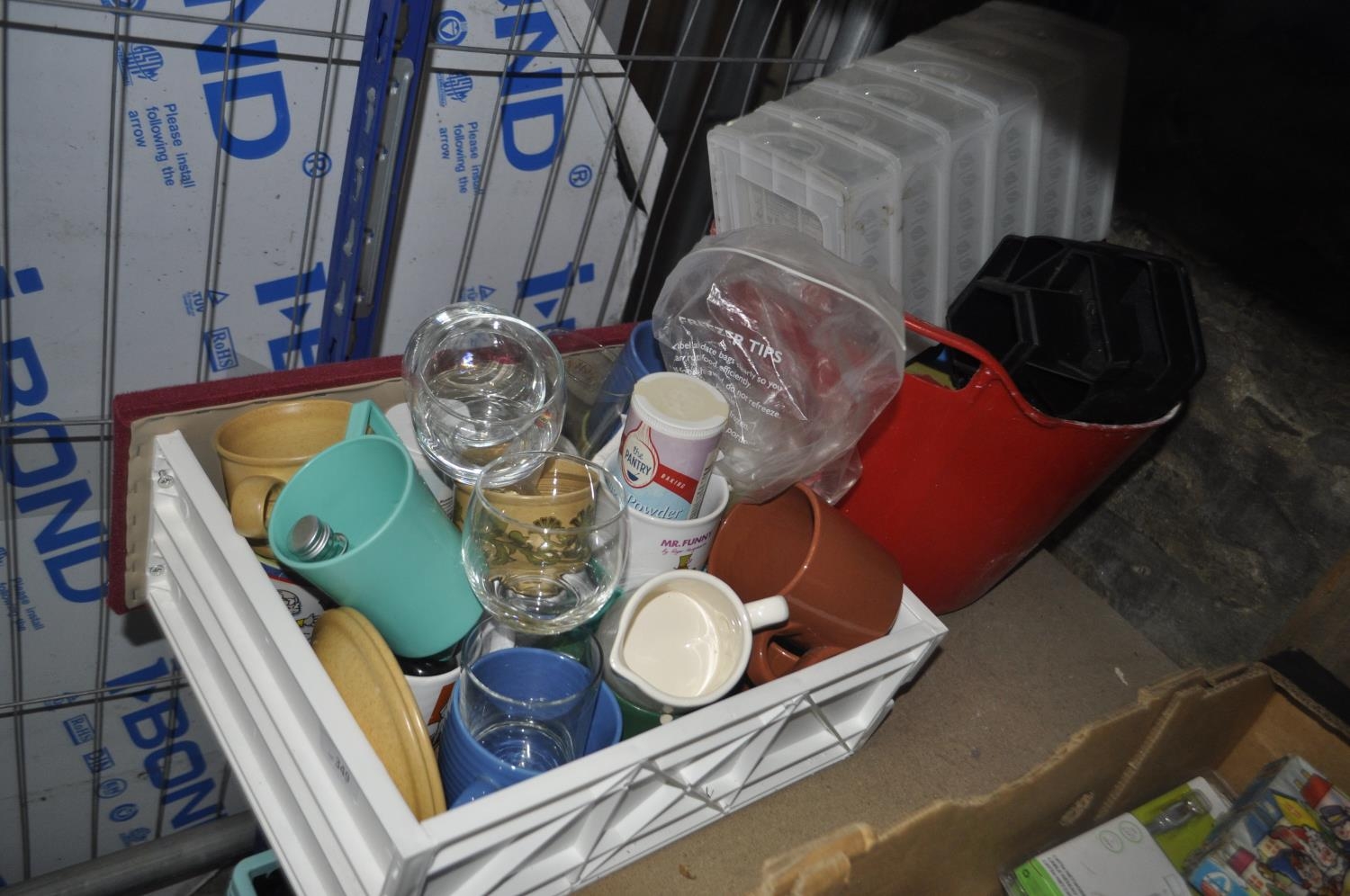 DRAWER FULL OF GLASS AND MUGS AND PLASTIC CUPS