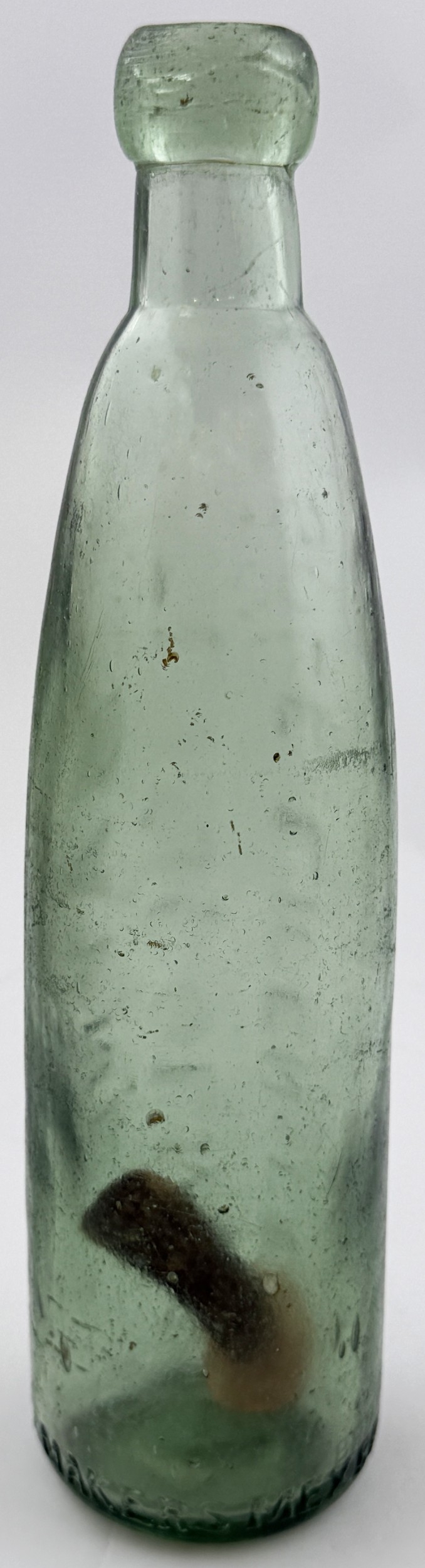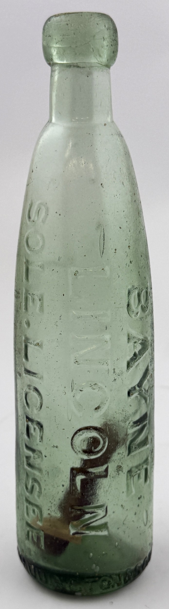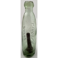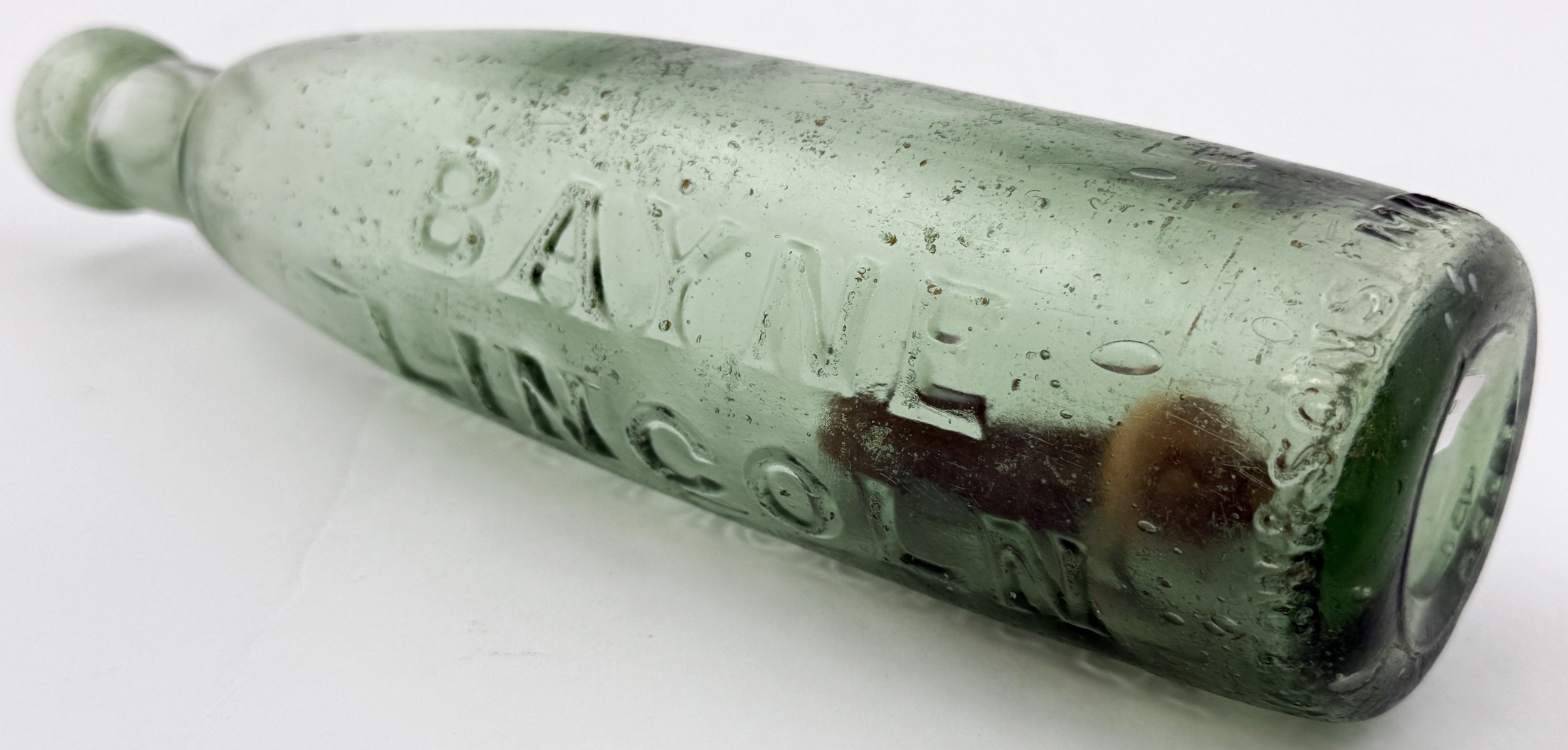 LINCOLN STICK STOPPER MINERAL WATER BOTTLE. 9.4ins. 10oz stick stopper mineral heavily embossed BAYNE/ LINCOLN/ SOLE LICENSEE vertically to one side. WADDINGTON & SONS MAKERS MEXBOROUGH embossed around base edge