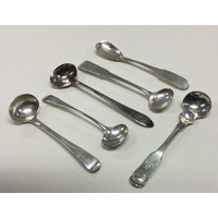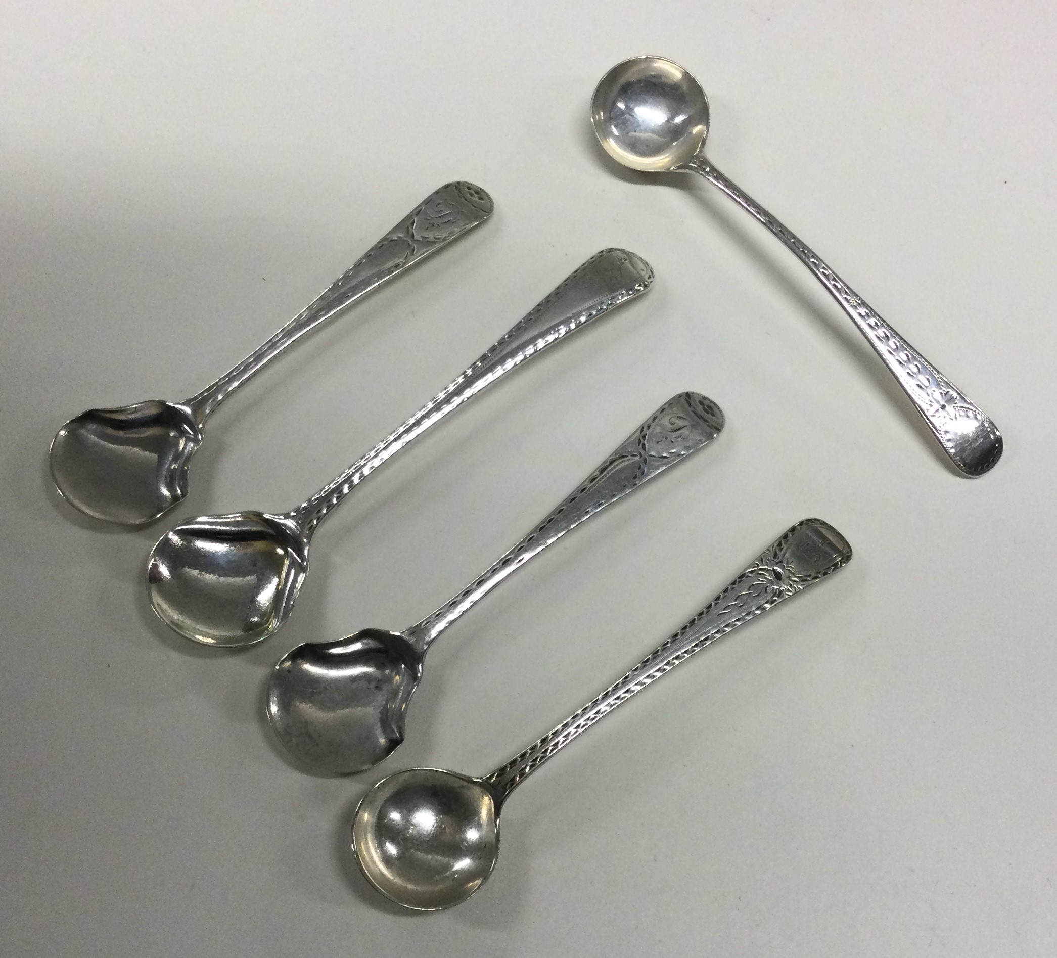 Five various bright cut engraved Georgian silver salt spoons to include two from Newcastle. Approx. 47 grams. Est. £30 - £50.