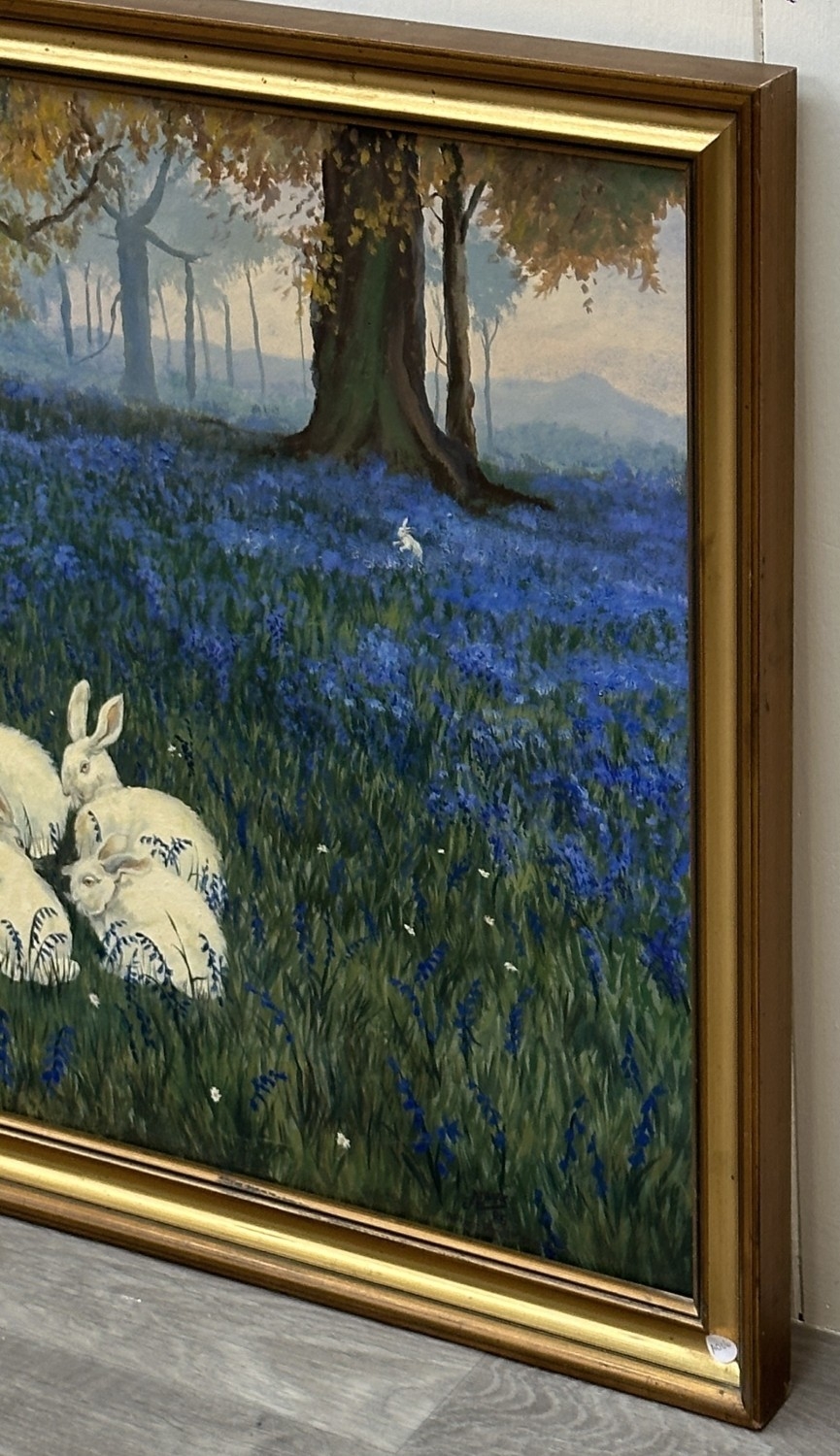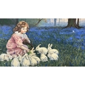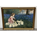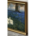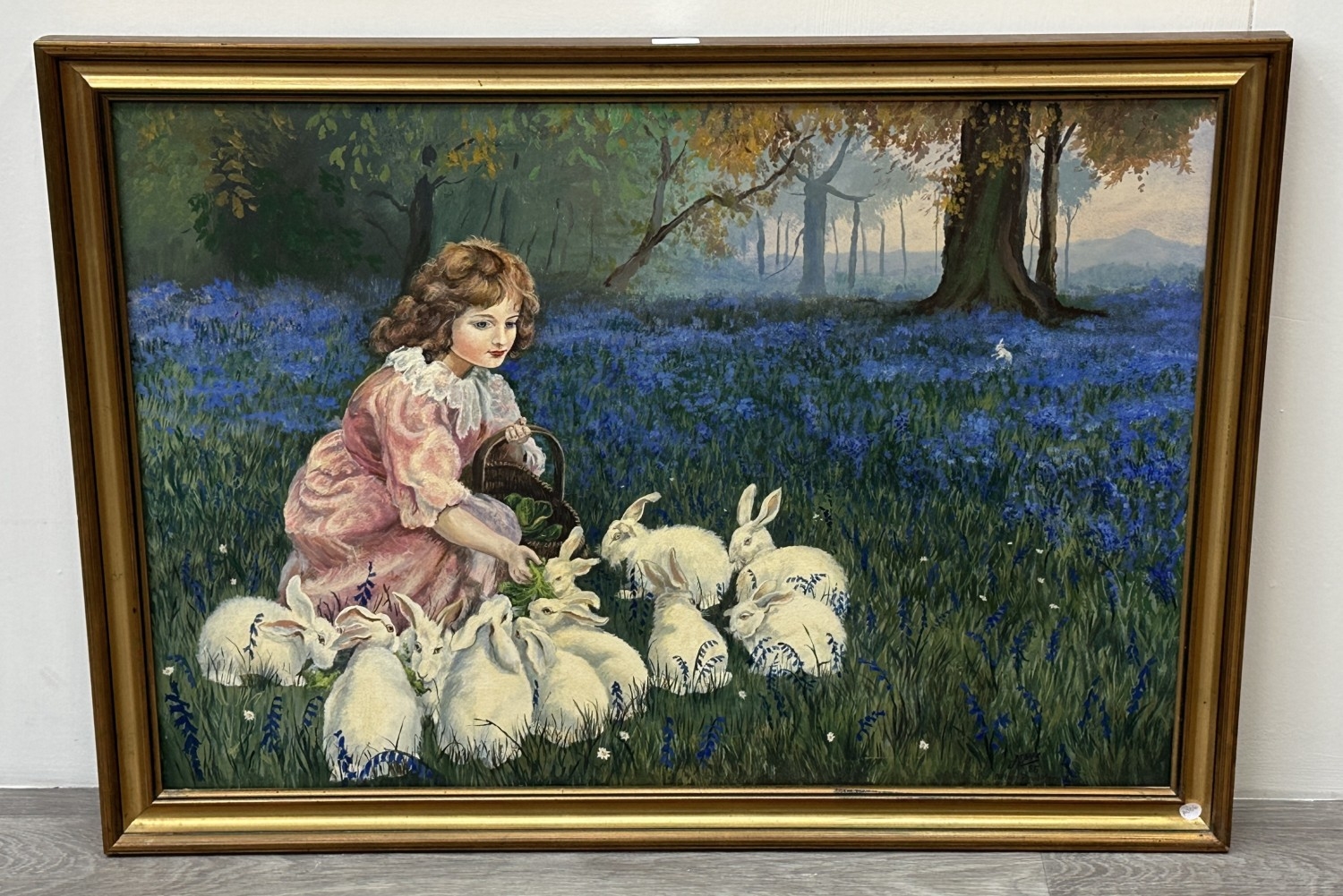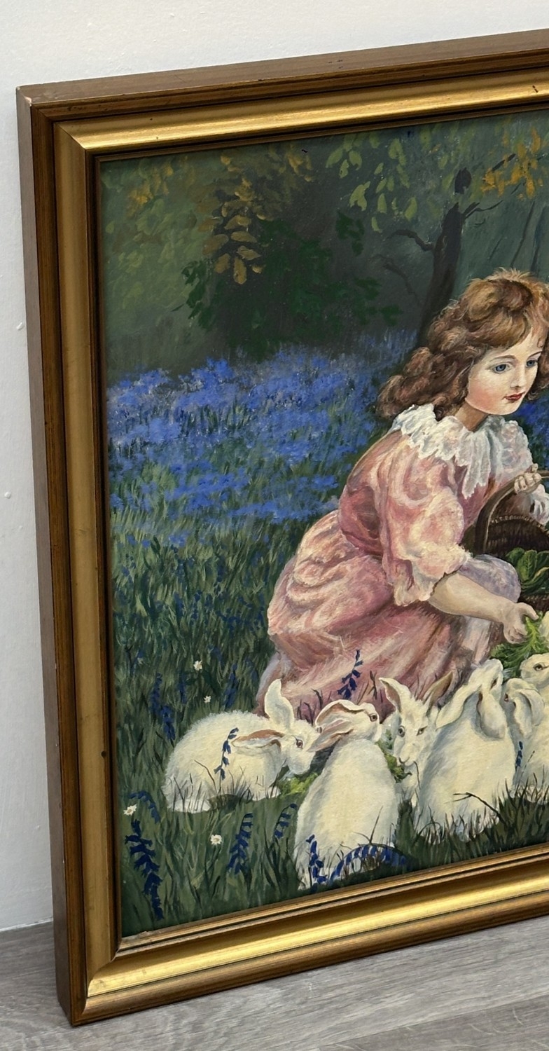 A late 20th century gilt framed oil on canvas titled 'Alice in Wonderland, Feeding the Rabbits' after Frederick Morgan, signed lower right and dated 1985 - approx. 73cm high x 101cm wide