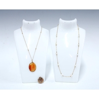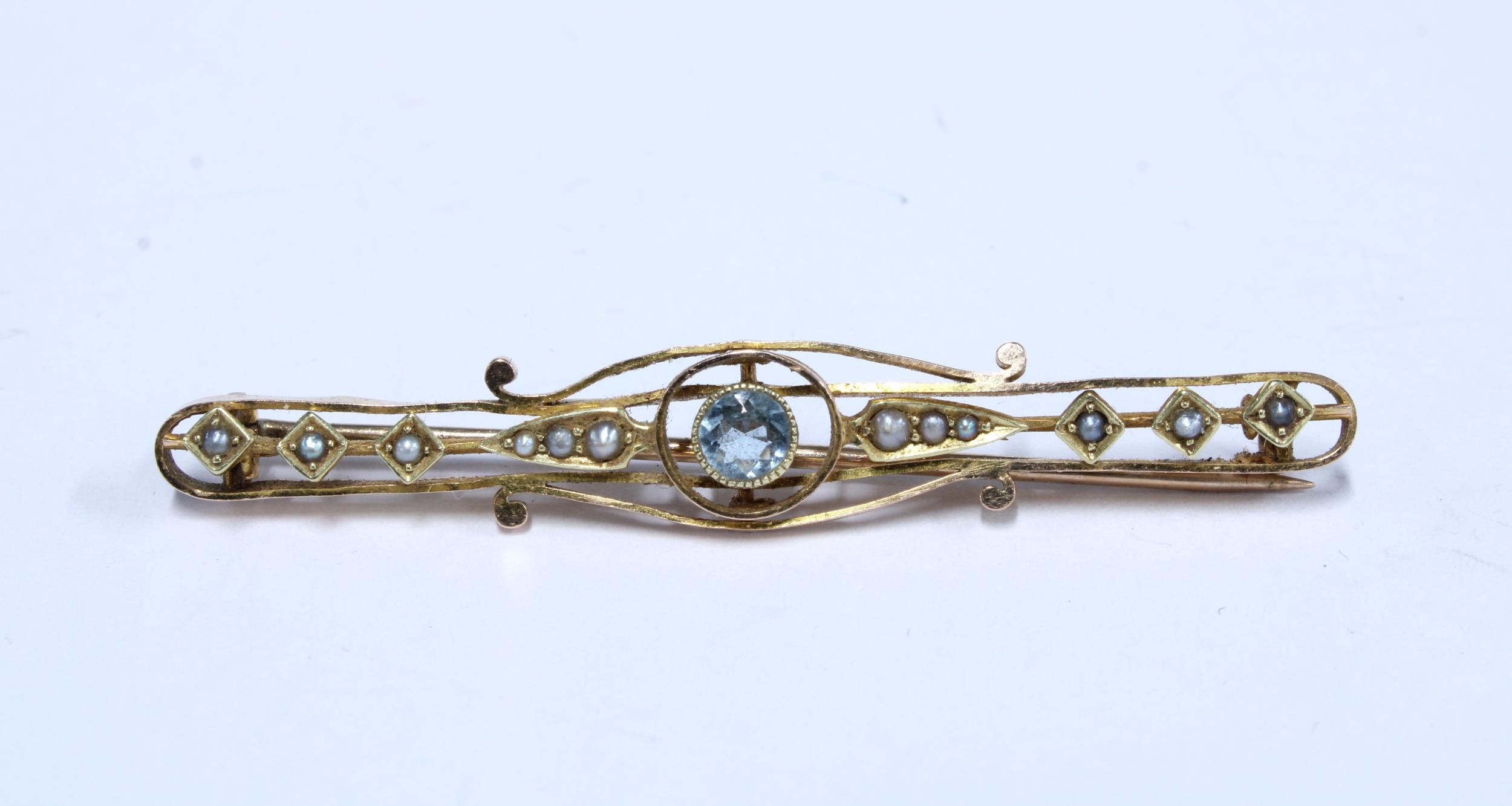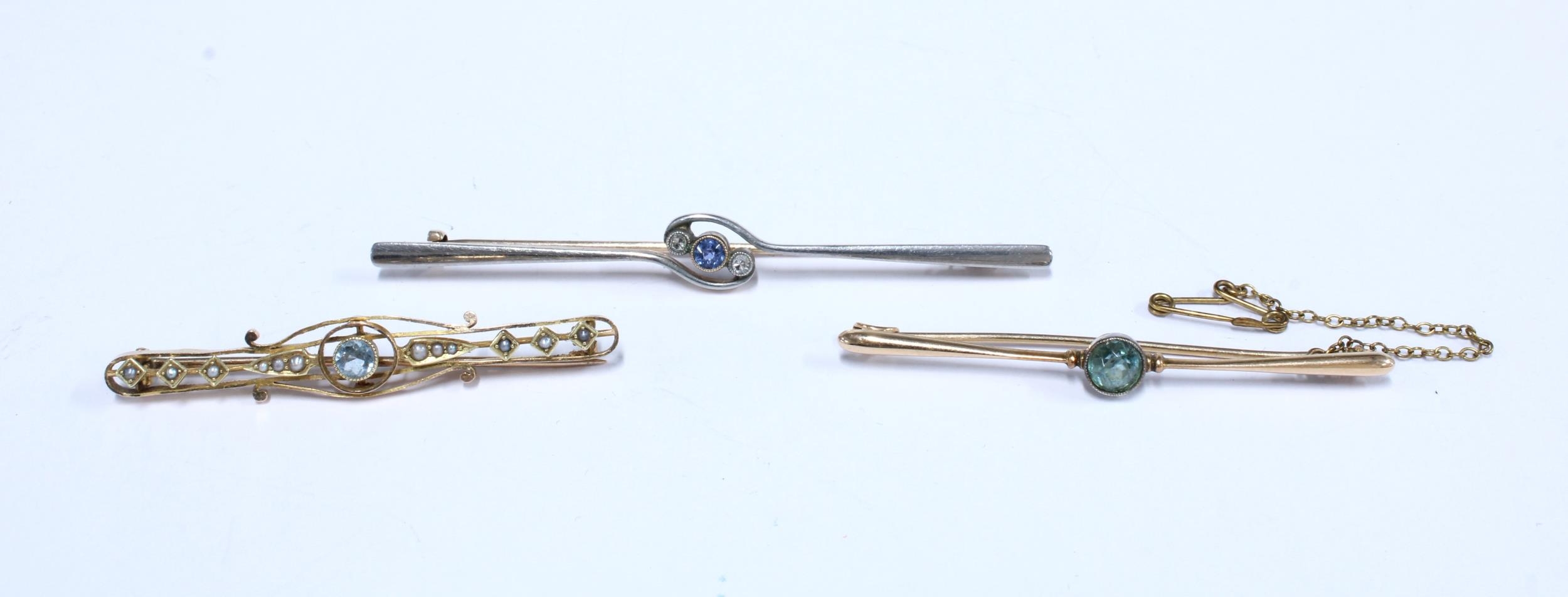 15ct gold sapphire and diamond bar brooch , a 15ct gold seed pearl brooch and a gemset bar brooch, each stamped 15ct (3)