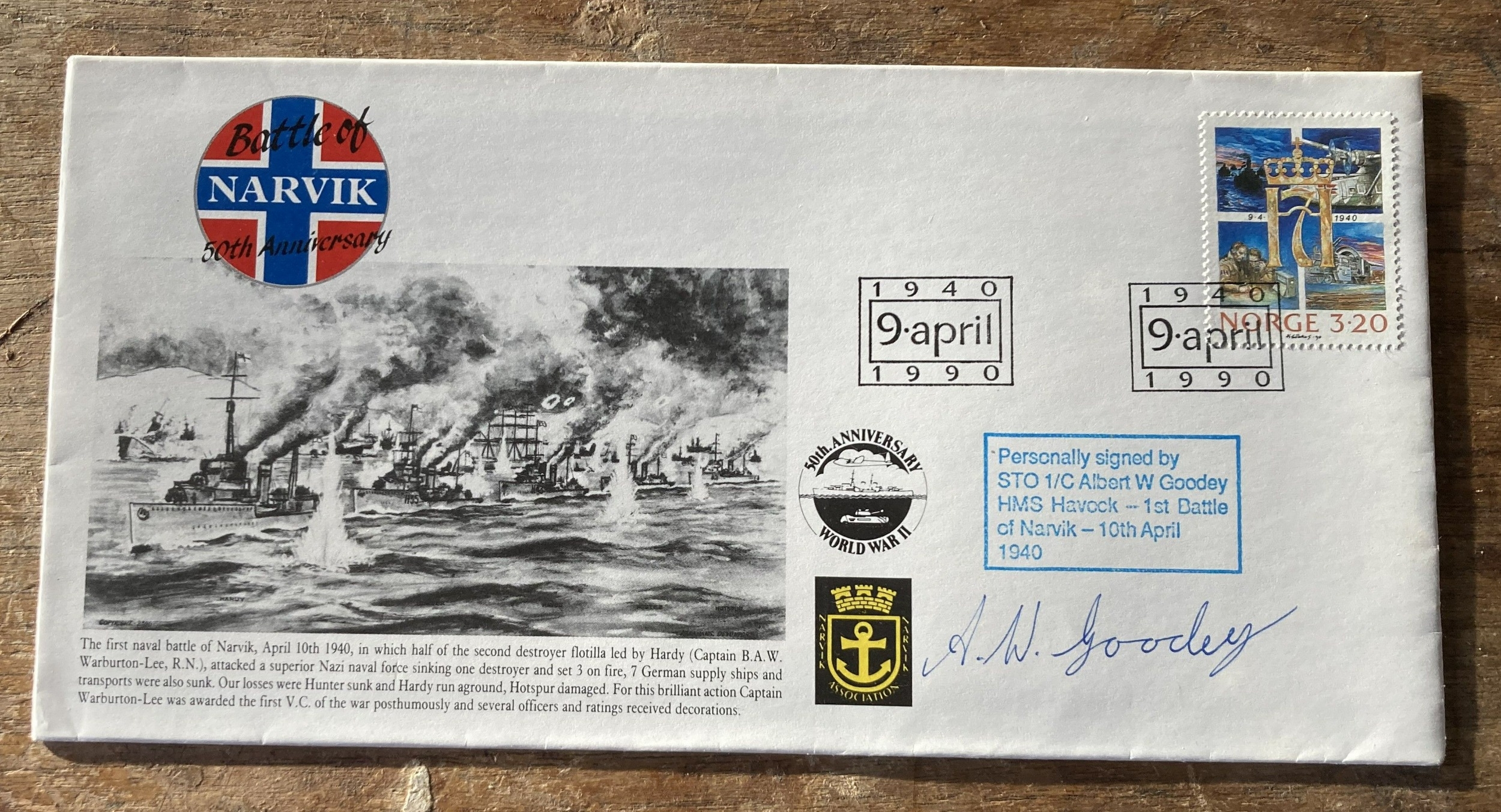 Navy 50th anniv Battle of Narvik cover signed STO 1/C Albert W Goodey HMS Havock 1st Battle of Narvik April 1940 WW2 Naval FDC. Single Vendor collection. Good condition. We combine postage on multiple winning lots and can ship worldwide. UK postage from £5.99, EU from £7.99, Rest of World from £9.99.