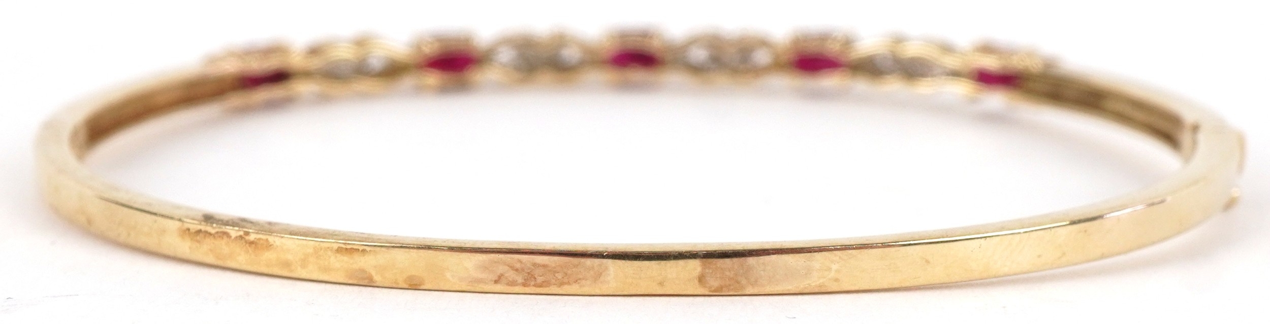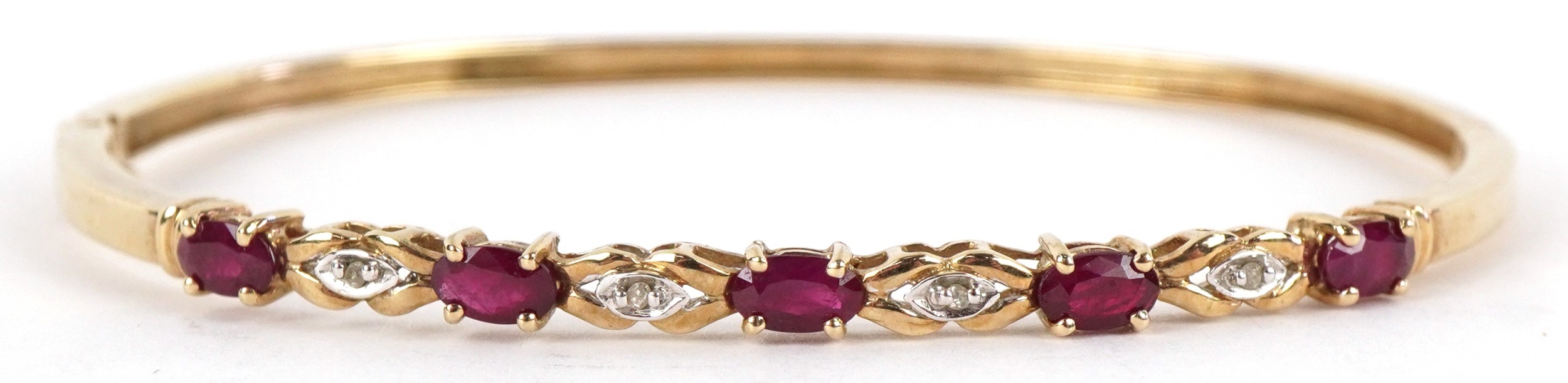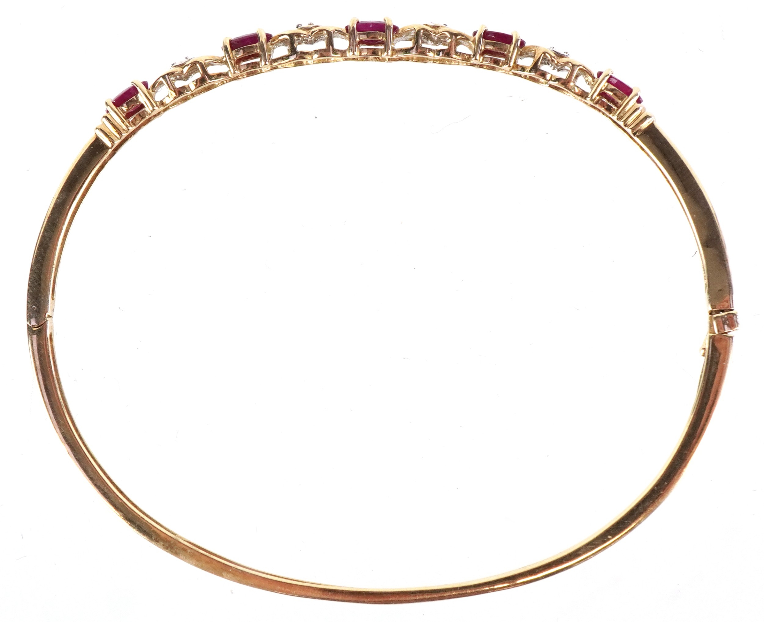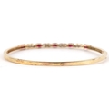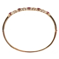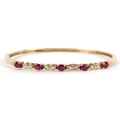 A 9ct gold ruby and diamond bangle, 6.5cm wide, 7.3g.