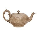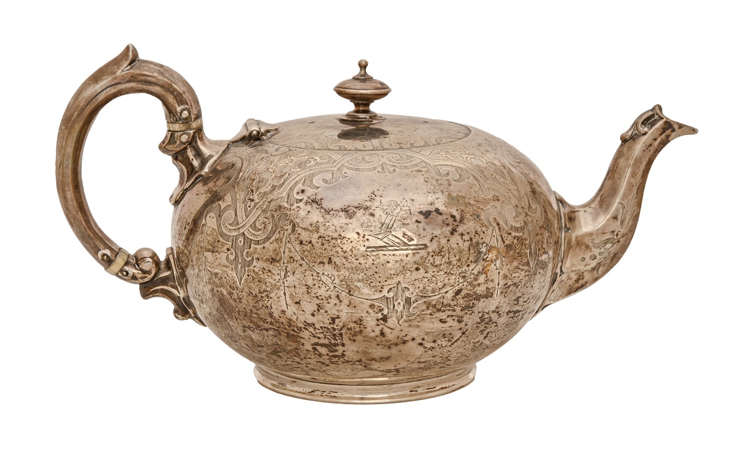 A Victorian silver teapot, engraved with strapwork, ivory insulators, crested, 14cm h, by Robert Harper, London 1865, 19oz 10dwt