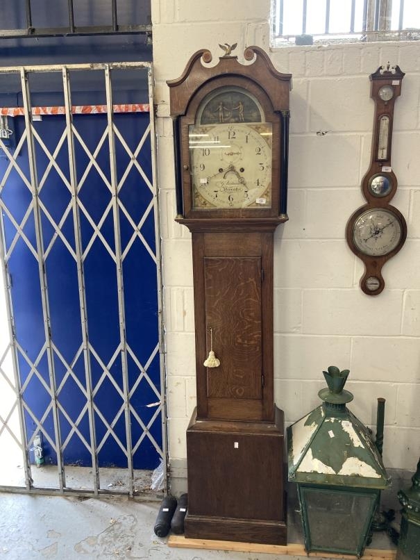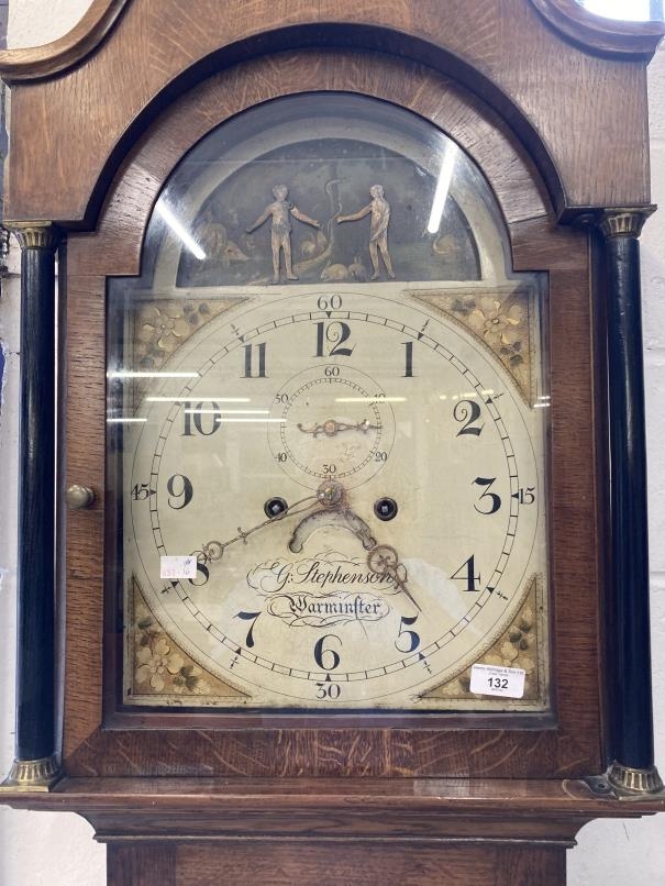 Clocks: 19th cent. Oak Wiltshire 8 day longcase clock, the 17½ins. arch dial with Adam and Eve automata painted with various animals, tree and serpent. George Stephenson Warminster.