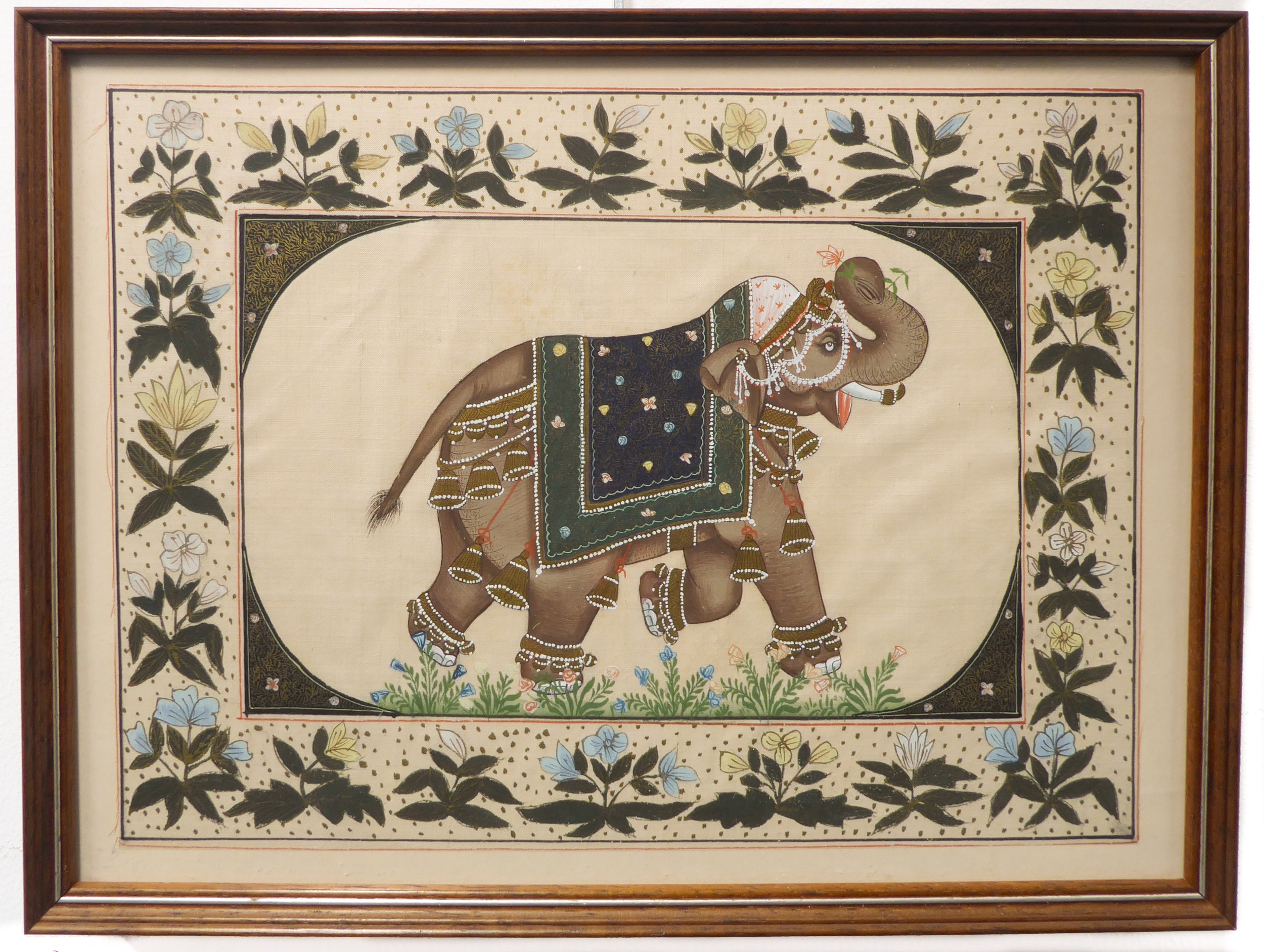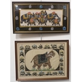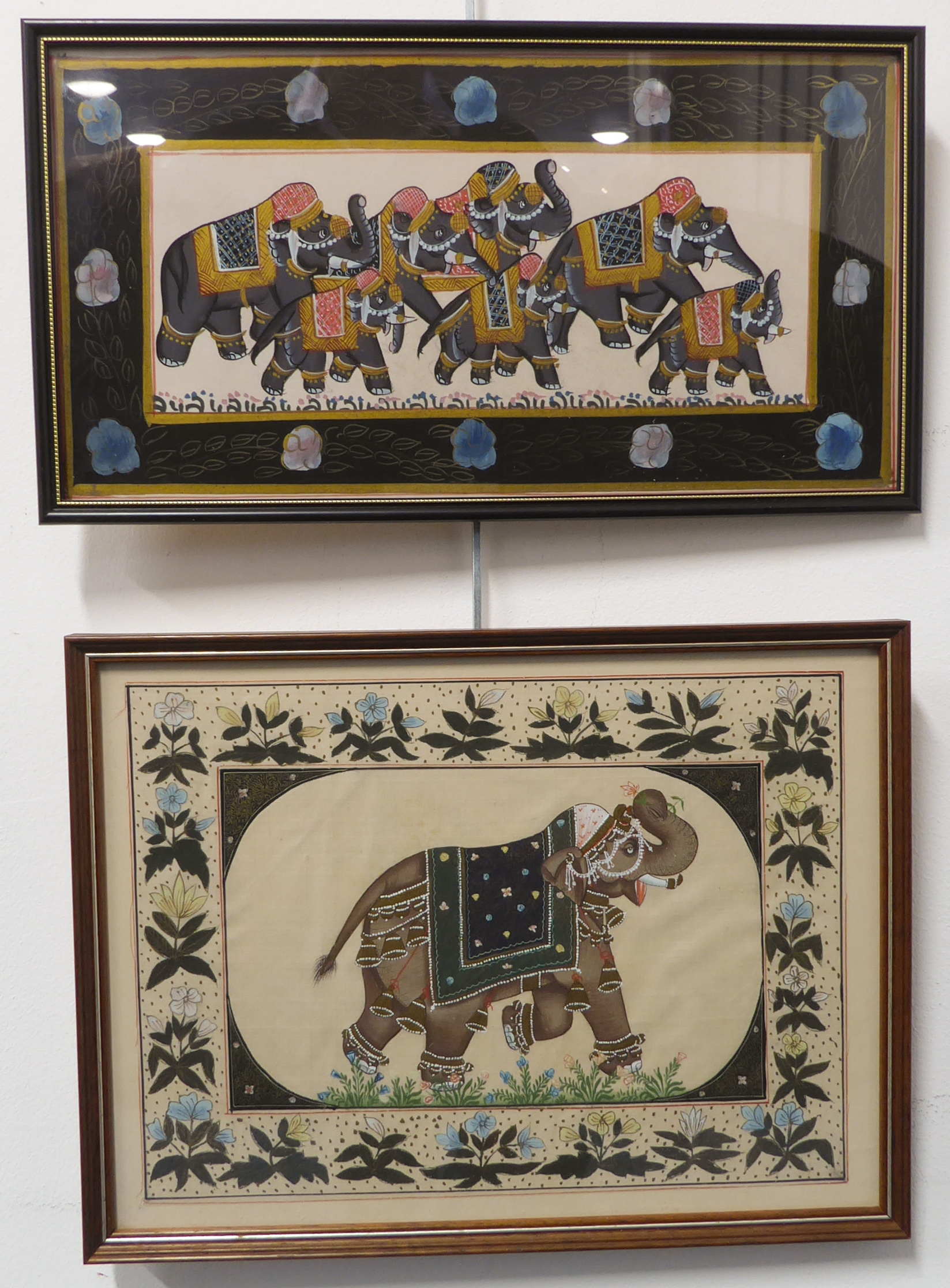 20th century Indian School - two framed and glazed gouache on silk studies, one of four elephants with three calves (frame size 22.5cm x 40cm), the other of a single elephant (frame sizes 27.5cm x 36.5cm)