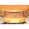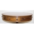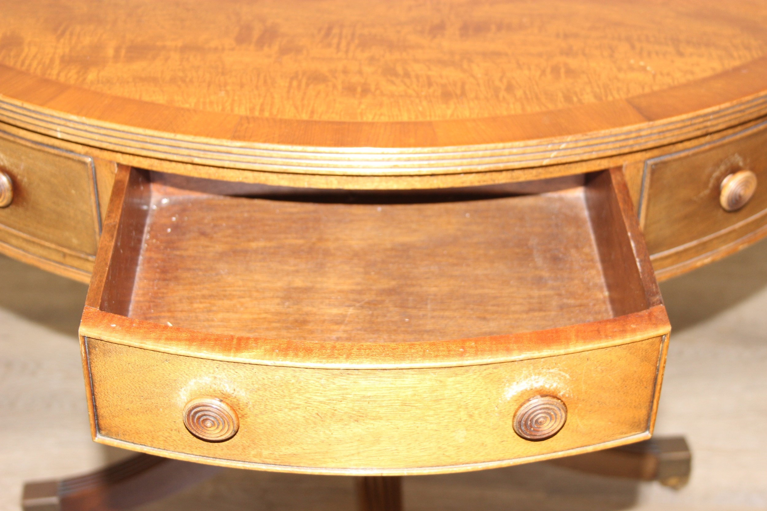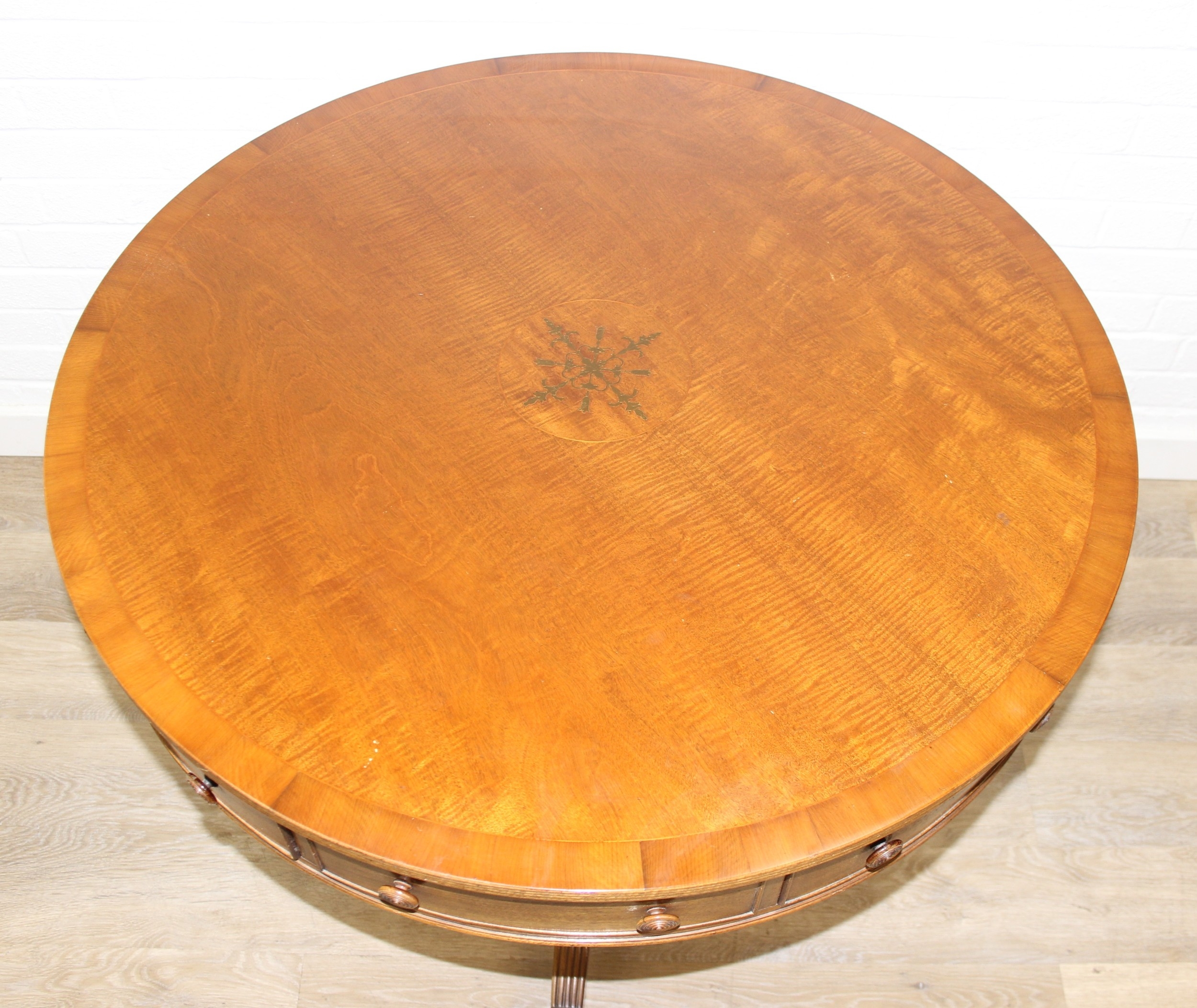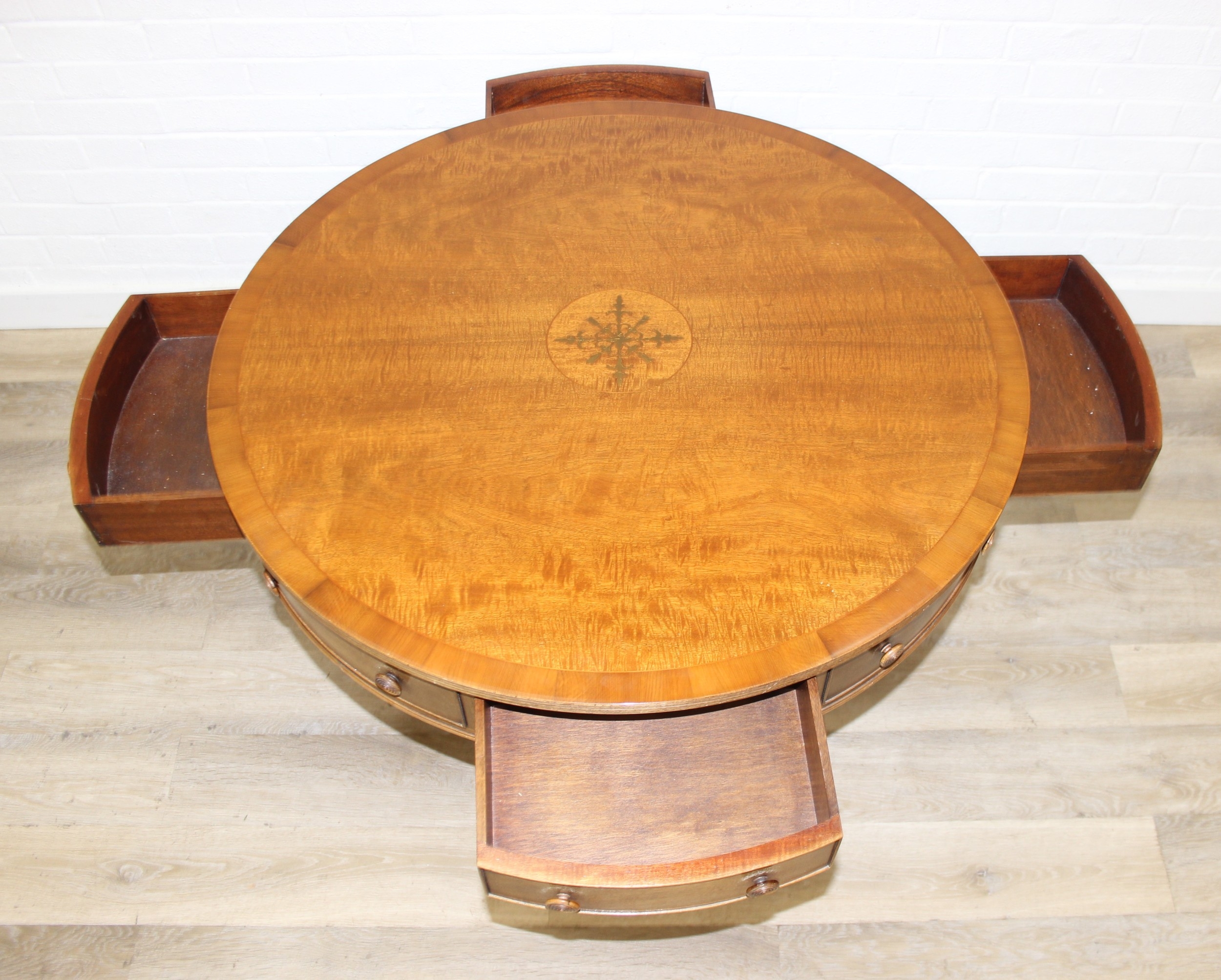 An antique style drum or library table with inlay, four real drawers and four faux drawers, 91cm in diameter x 77cm tall