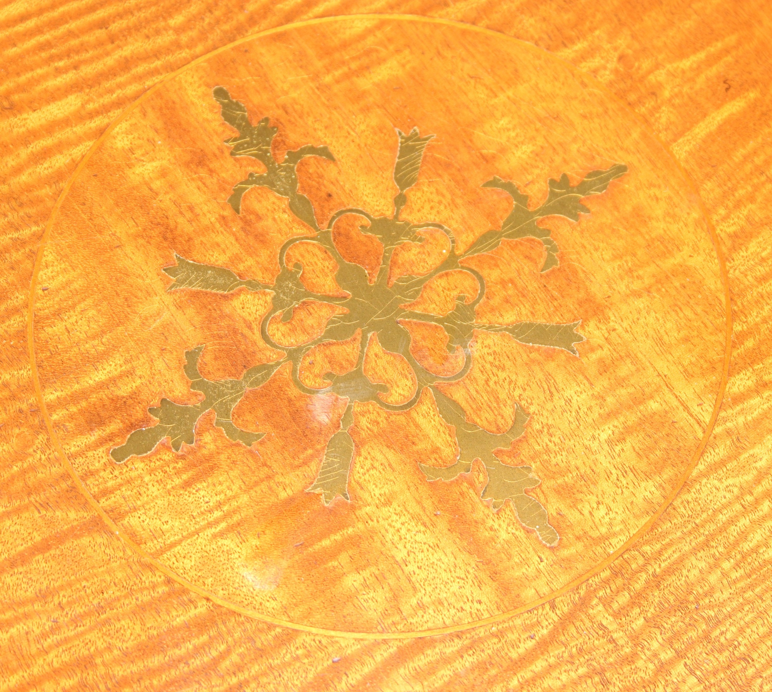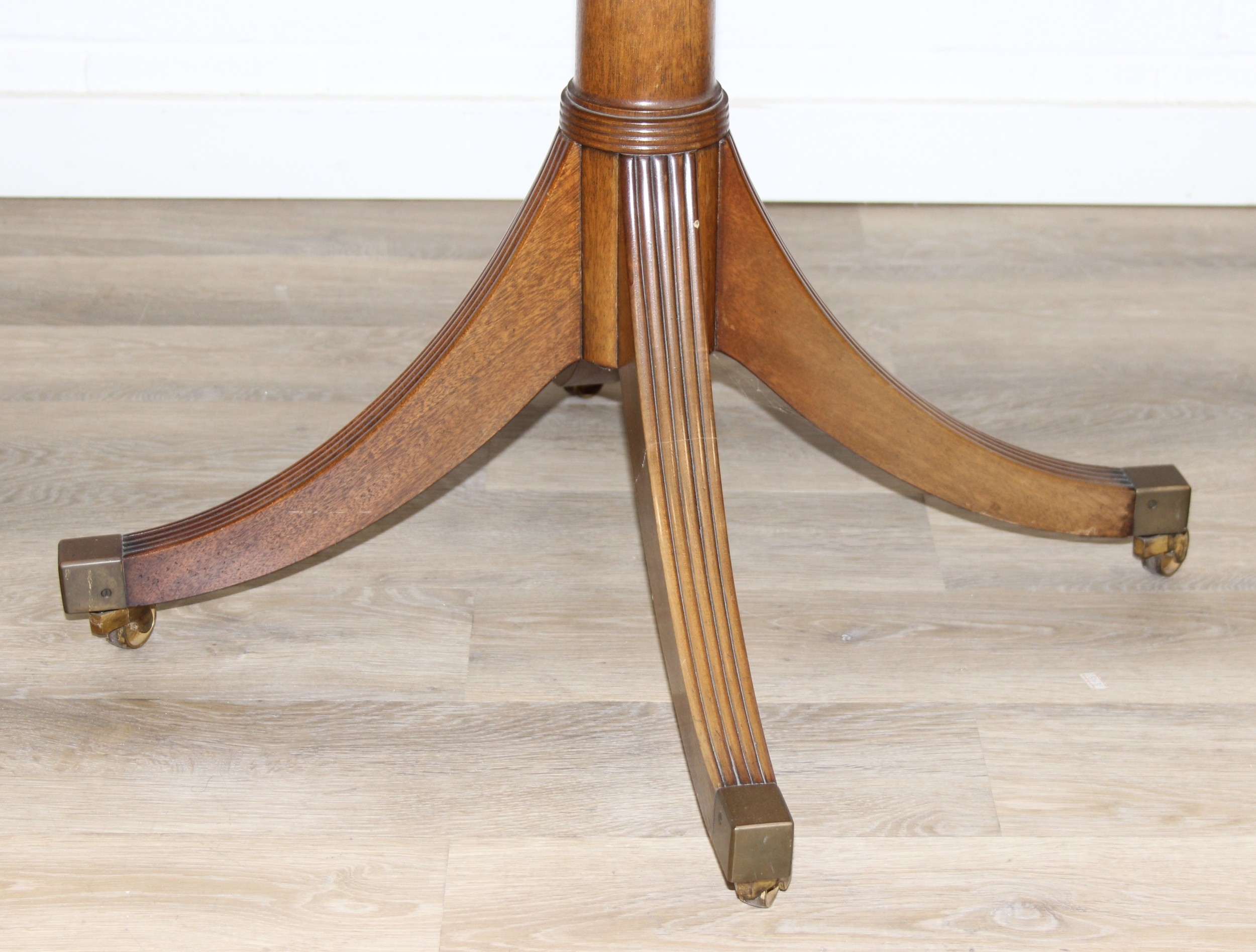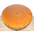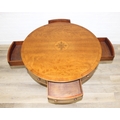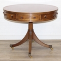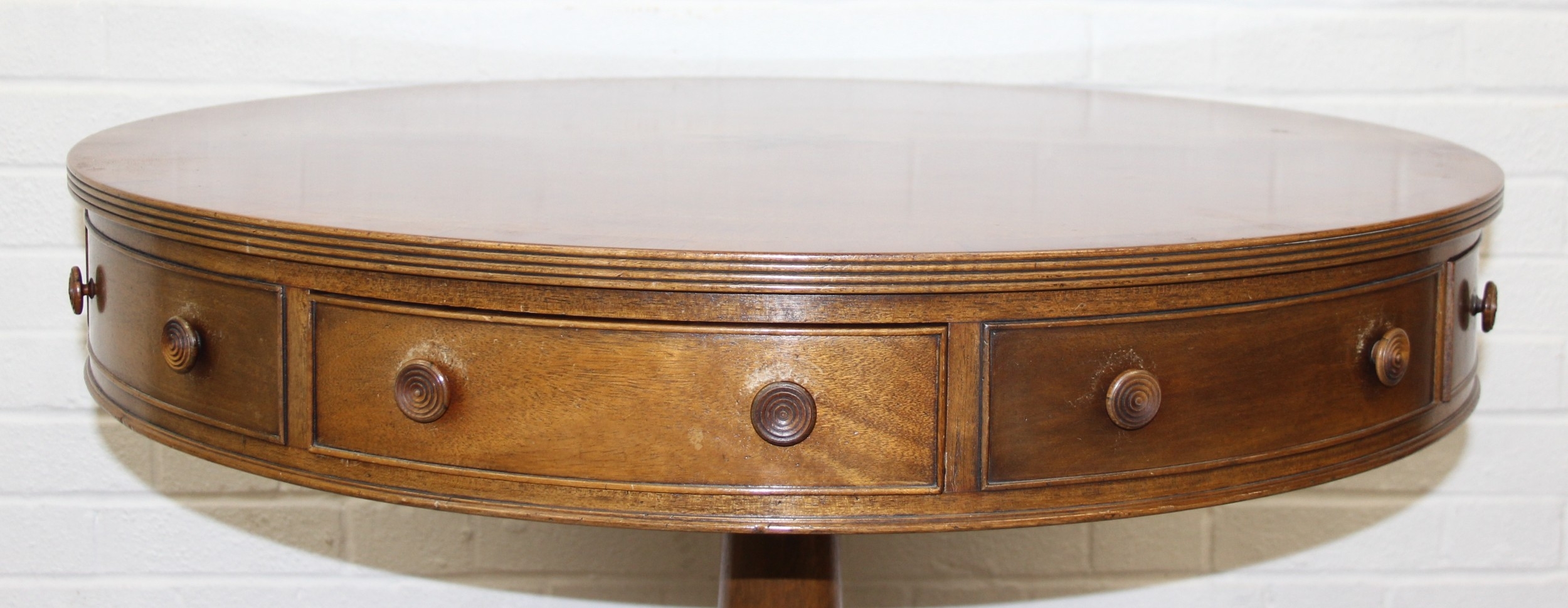 An antique style drum or library table with inlay, four real drawers and four faux drawers, 91cm in diameter x 77cm tall