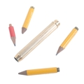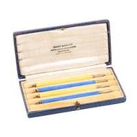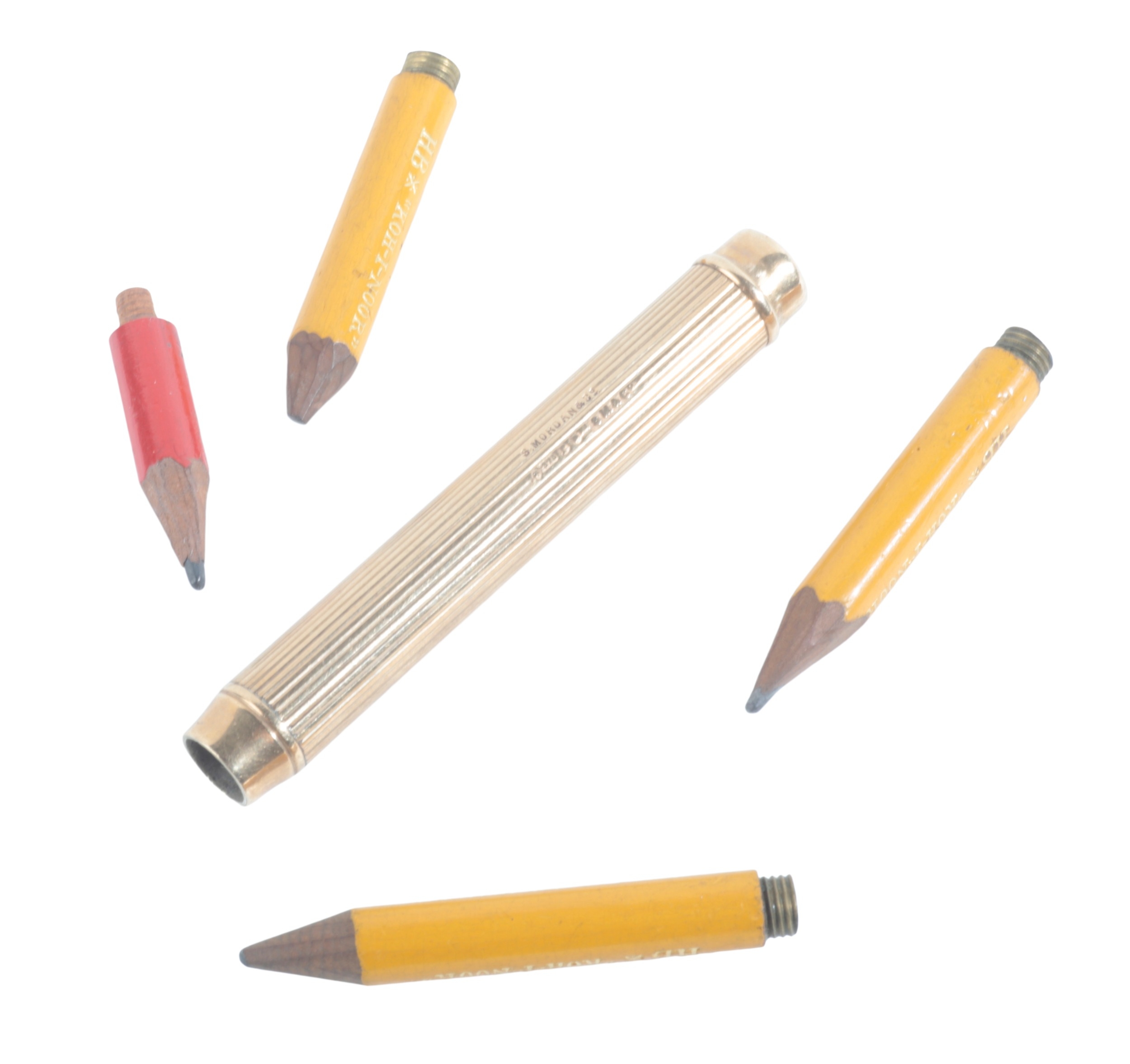 A 9CT GOLD PENCIL BY MORDAN & CO.the reeded barrel with cartouche dated 19th September 1913, 8cm long, c. 27 grams gross weight; together with three leads and one associated lead (5)