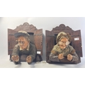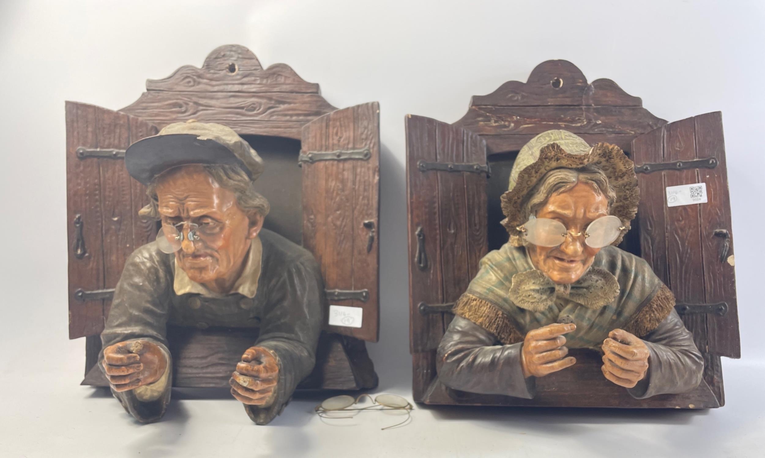 RARE ITEMS! Two highly unusual 19th century AUSTRIAN, possibly by Friedrich Goldscheider, polychromed Majolica wall sculptures of an elderly couple complete with antique spectacles! height approx 40cm -