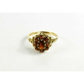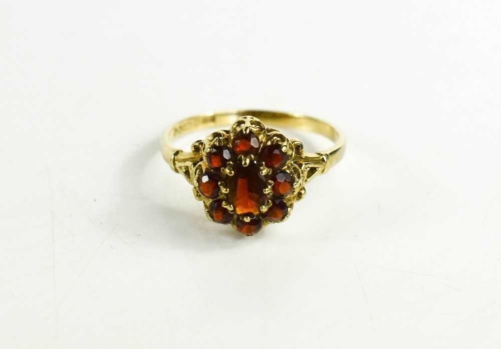A 9ct gold and flame red stone cluster ring, possibly garnets, size Q/R, 2.4g.