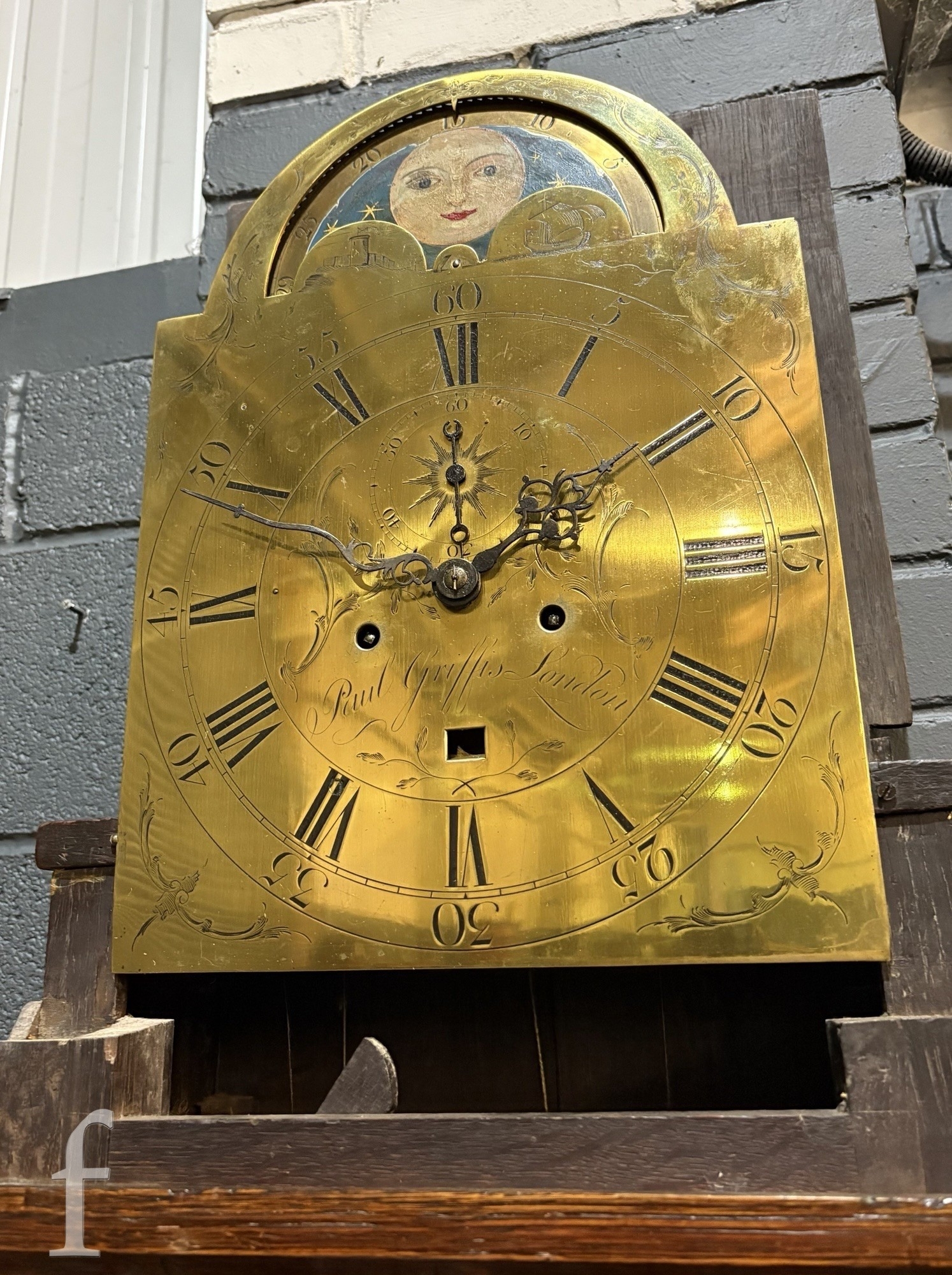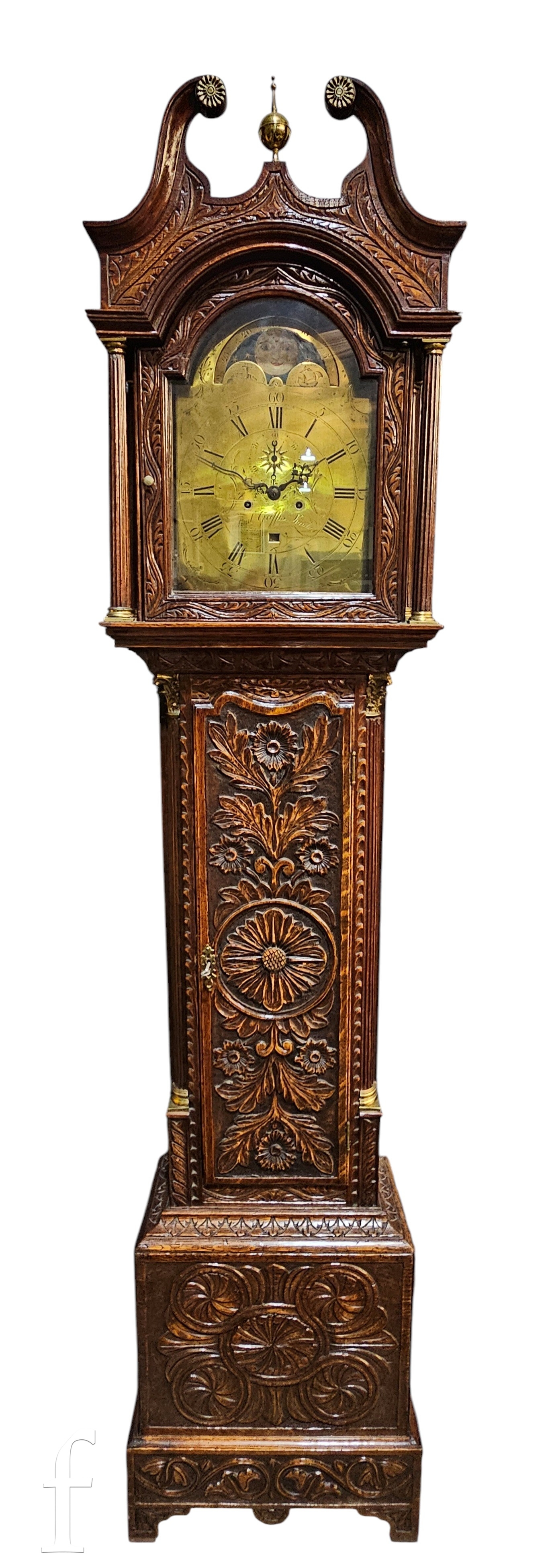 A George III and later longcase clock with eight day movement, the oak case later carved profusely with acanthus leaves and rosettes, with a 13 inch brass broken arch dial with rolling moonphase, subsidiary seconds dial and a date aperture (defective), signed Paul Griffis London, height 241cm, later repairs and alterations.