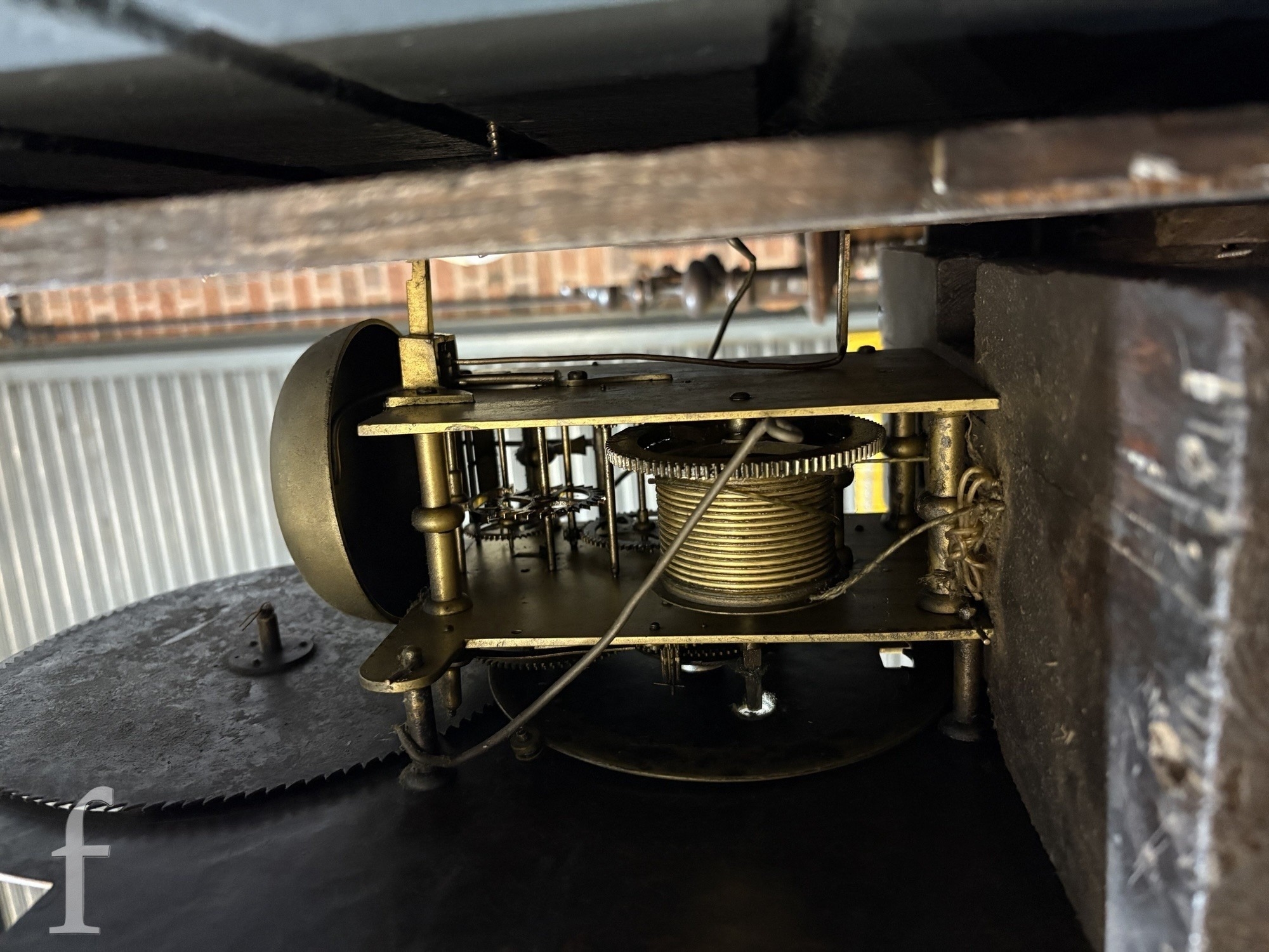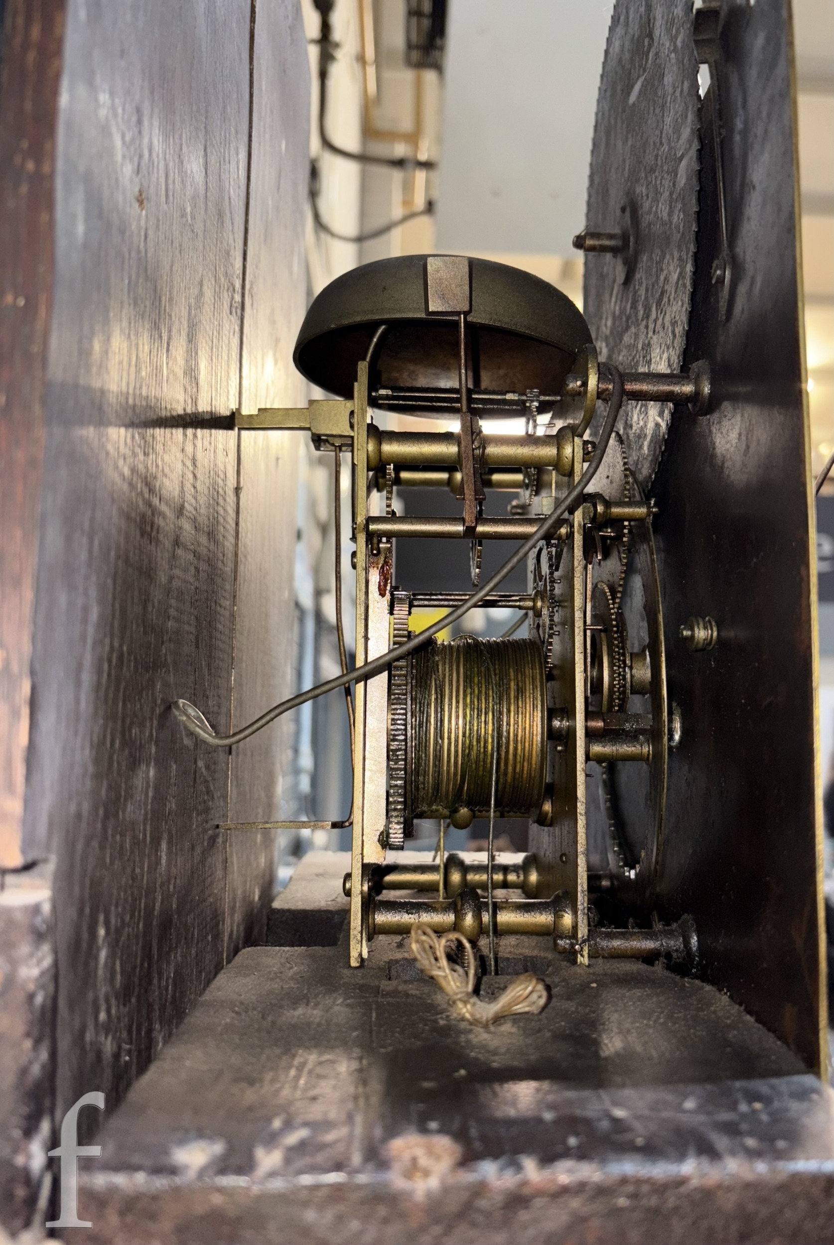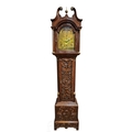 The case has been carved later, probably late 19th Century. The dial has been married to the movement and in turn to the case. The seatboard is a later replacement. The pendulum is present and a pair of replacement weights and a winder are present.