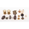 A mixed collection of dress studs and cufflink's, including three 9ct gold dress studs of varying size and design, UK hallmark, total gross weight, 2.1grams; and a selection of odd costume jewellery cufflink's, other odd cufflink's and odd dress studs, (Qty).