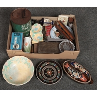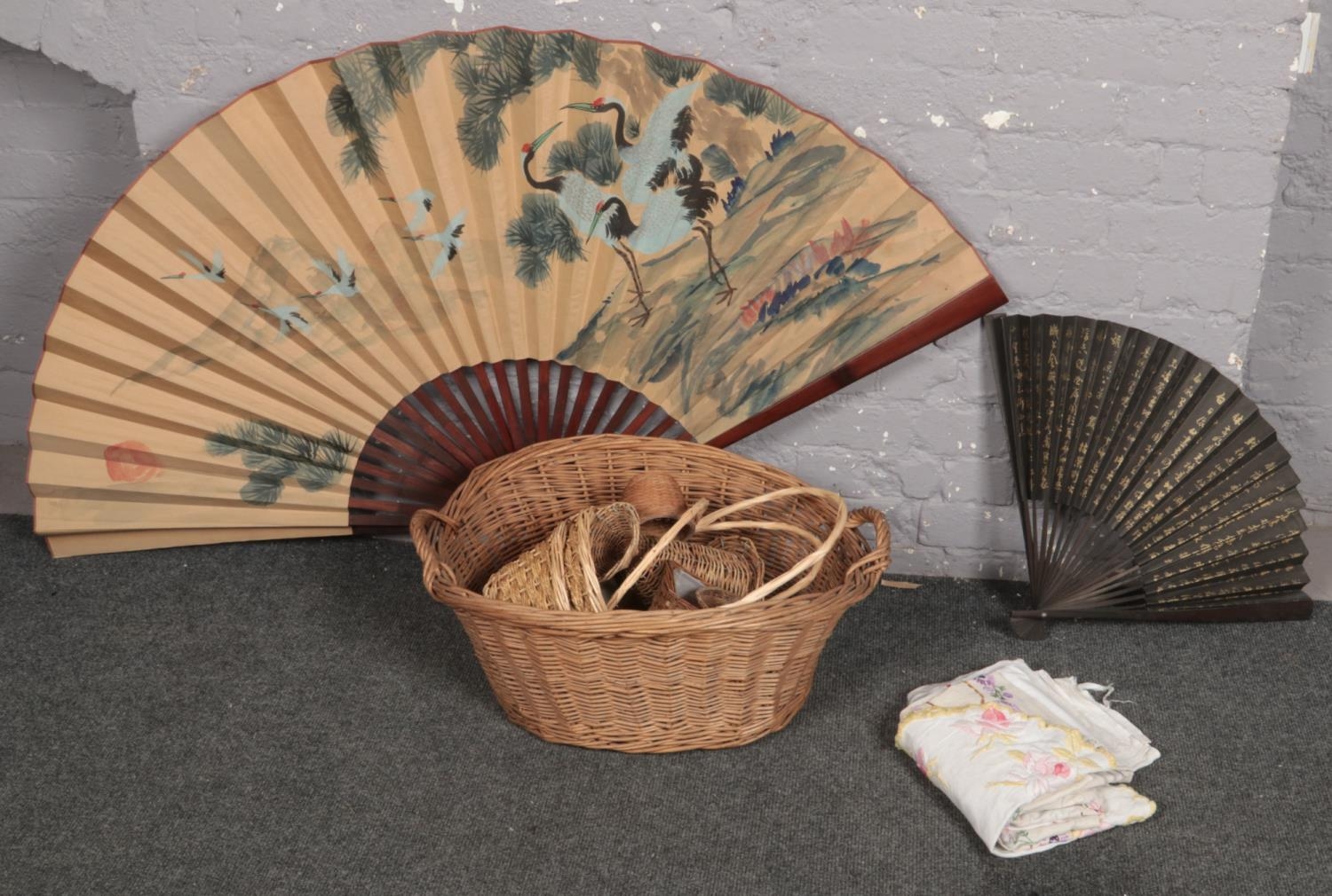 A collection of baskets, two large decorative Oriental fans including one painted in watercolour, along with a small quantity vintage of lace and linen.