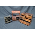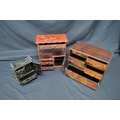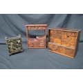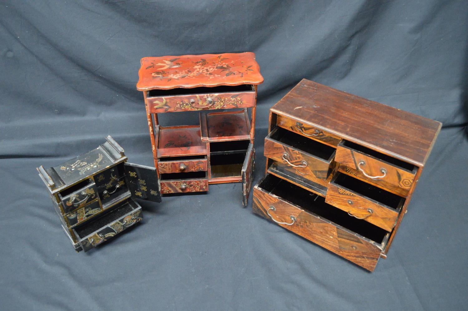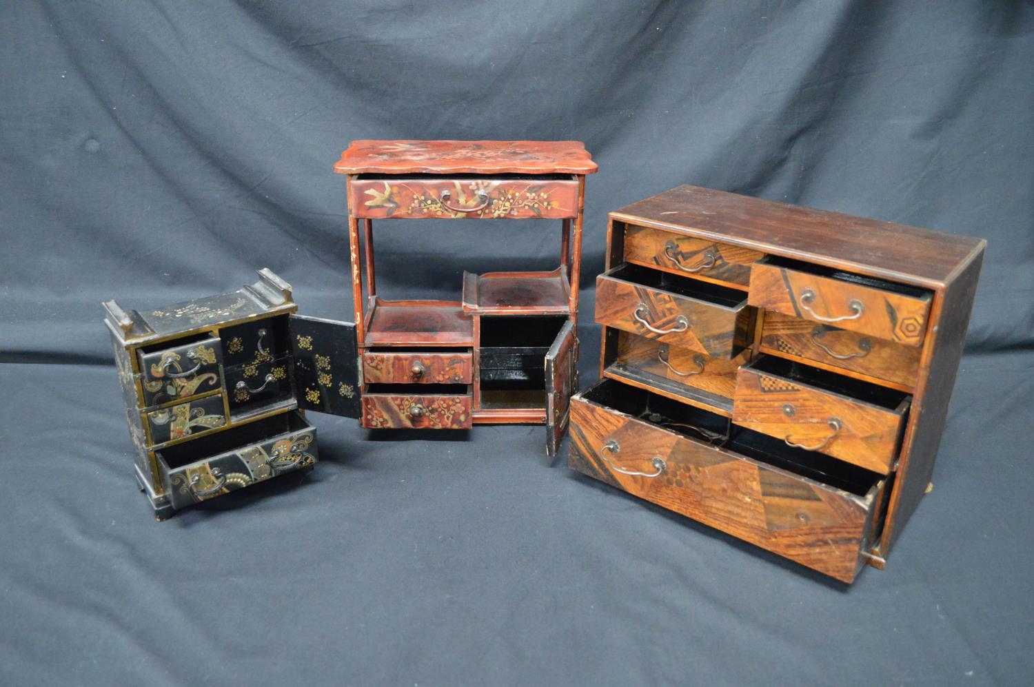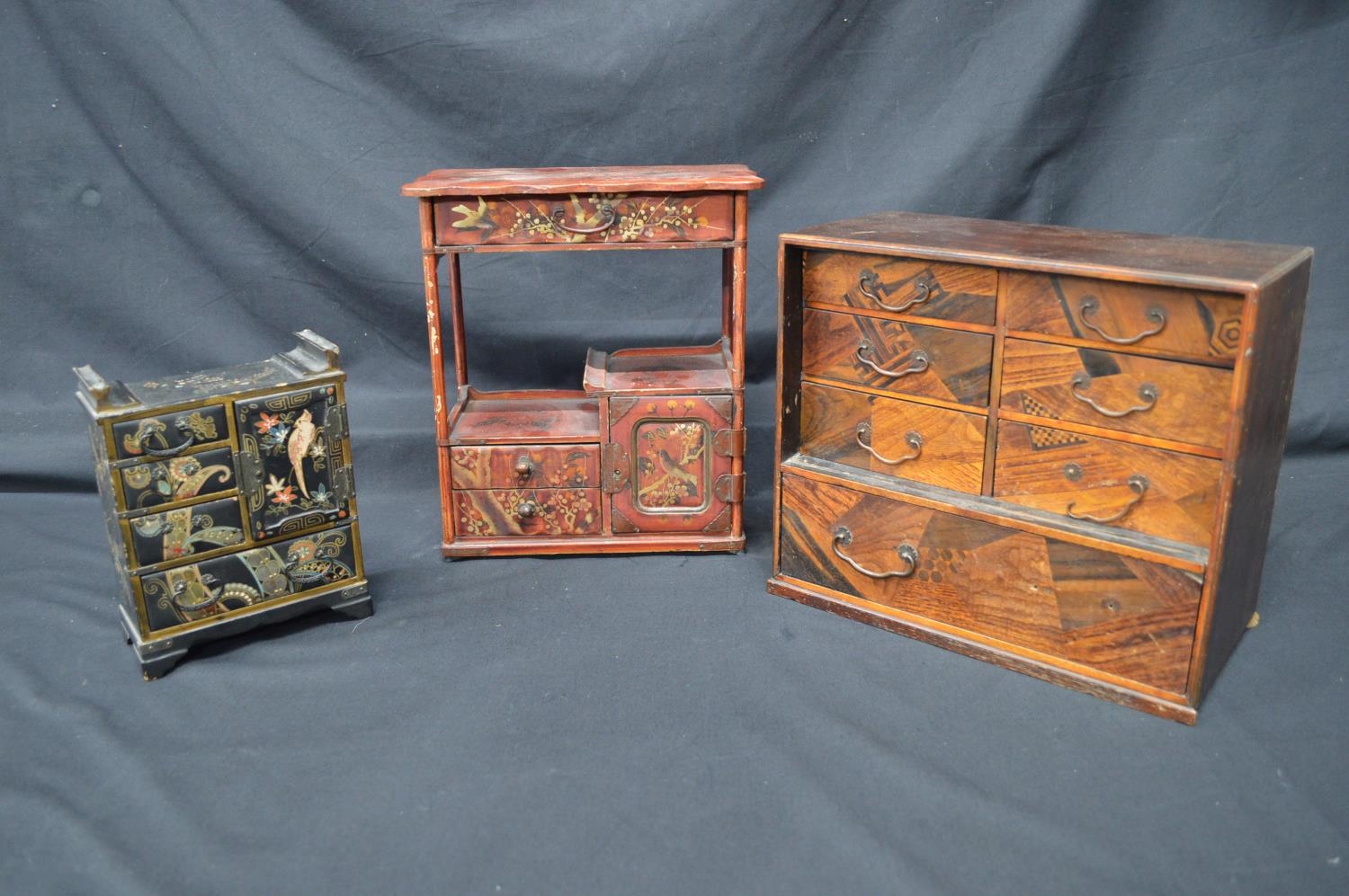 20th century Japanese black lacquered miniature table cabinet - 5.25" x 7.75" together with another red lacquered table cabinet - 10" x 11.5" and one other marquetry cabinet - 11.75" x 10.25" (front panel missing)