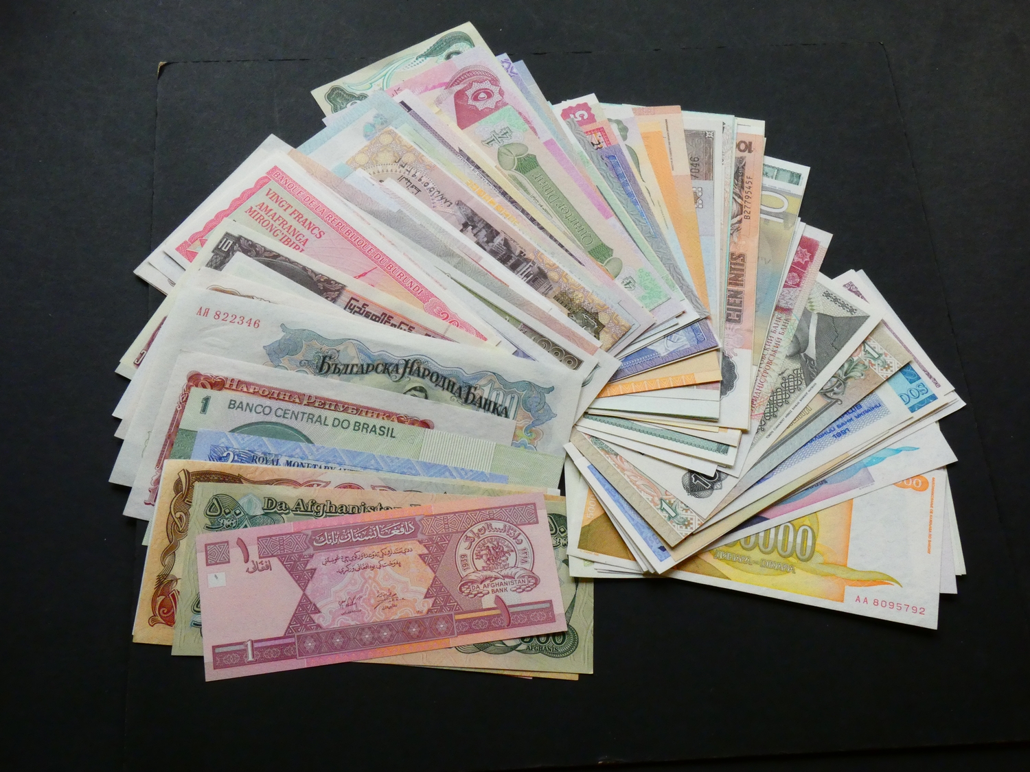BANKNOTES. World, collection, including Afghanistan x3, Bangladesh x1, Belarus x1, Bhutan x1, Brazil x1, Bulgaria x5, Burma/Myanmar x5, Burundi x2, Cambodia x10, People's Republic of China x10, Congo Democratic Republic x2, Croatia x2, Egypt x9, Ethiopia x1, Honduras x1, Hong Kong x1, India x1, Indonesia x5, Iraq x5, Malawi x1, Mongolia x4, Nepal x3, Nicaragua x3, Nigeria x2, Pakistan x3, Peru x4, Poland x4, Serbia x1, Sudan x1, Suriname x1, Thailand x1, Transnistria x3, Tukey x1, Ukraine x2, USSR x1, Venezuela x2, Yugoslavia x8, Zaïre x1, and Zimbabwe x3, EF to UNC, no duplication. (116)