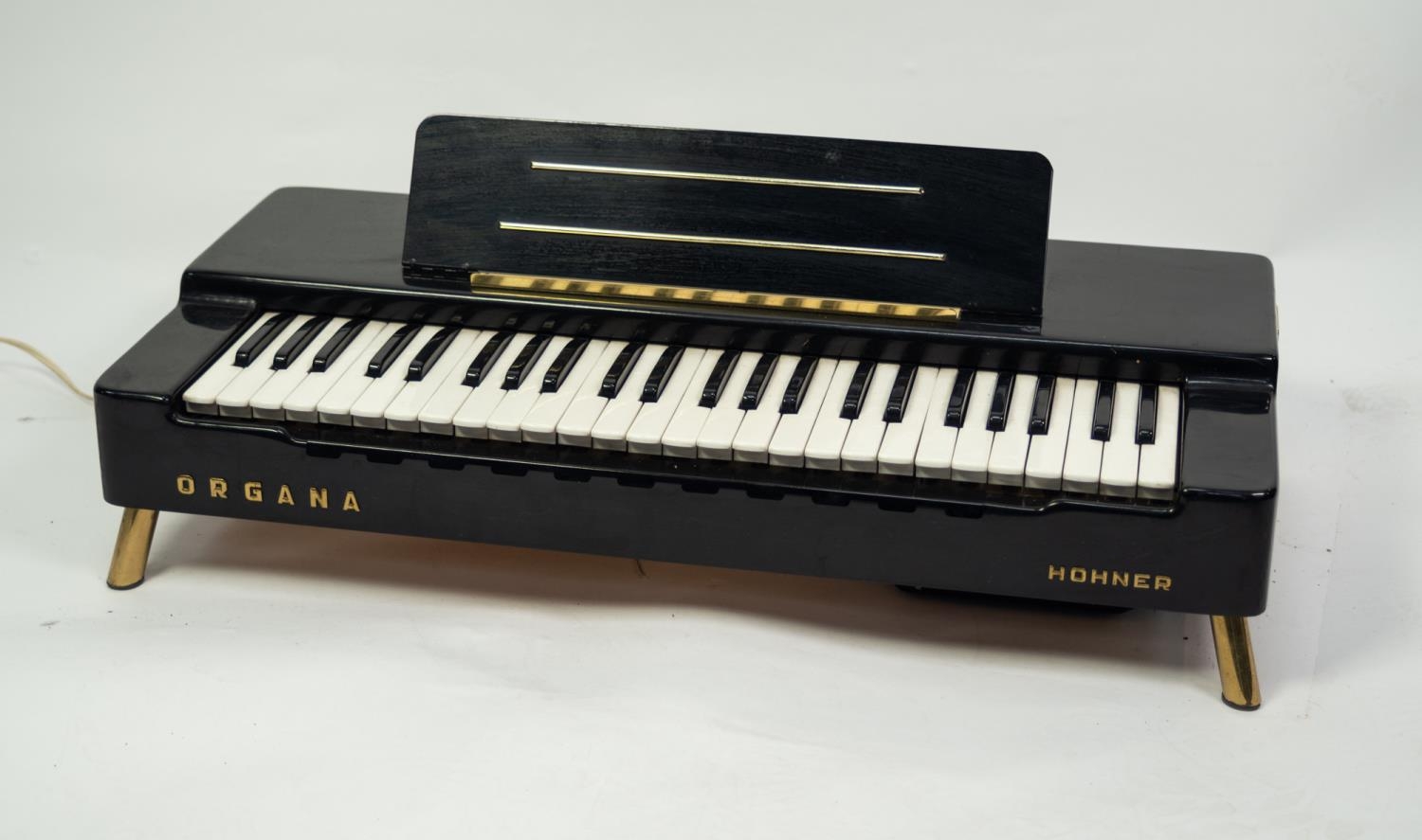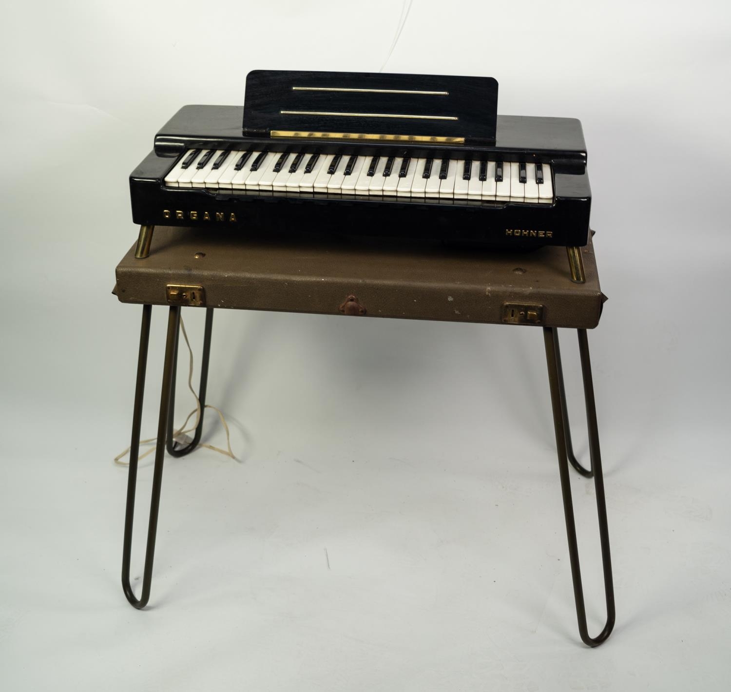 HOHNER (GERMANY), CIRCA 1960s 'ORGANA' TABLE TOP ELECTRONIC ORGAN, high gloss black plastic case, 26 3/4in (68cm) wide and the fabric clad and felt lined BOX WITH CARRYING HANDLE and the DETACHABLE TUBULAR METAL LEGS for free-standing use