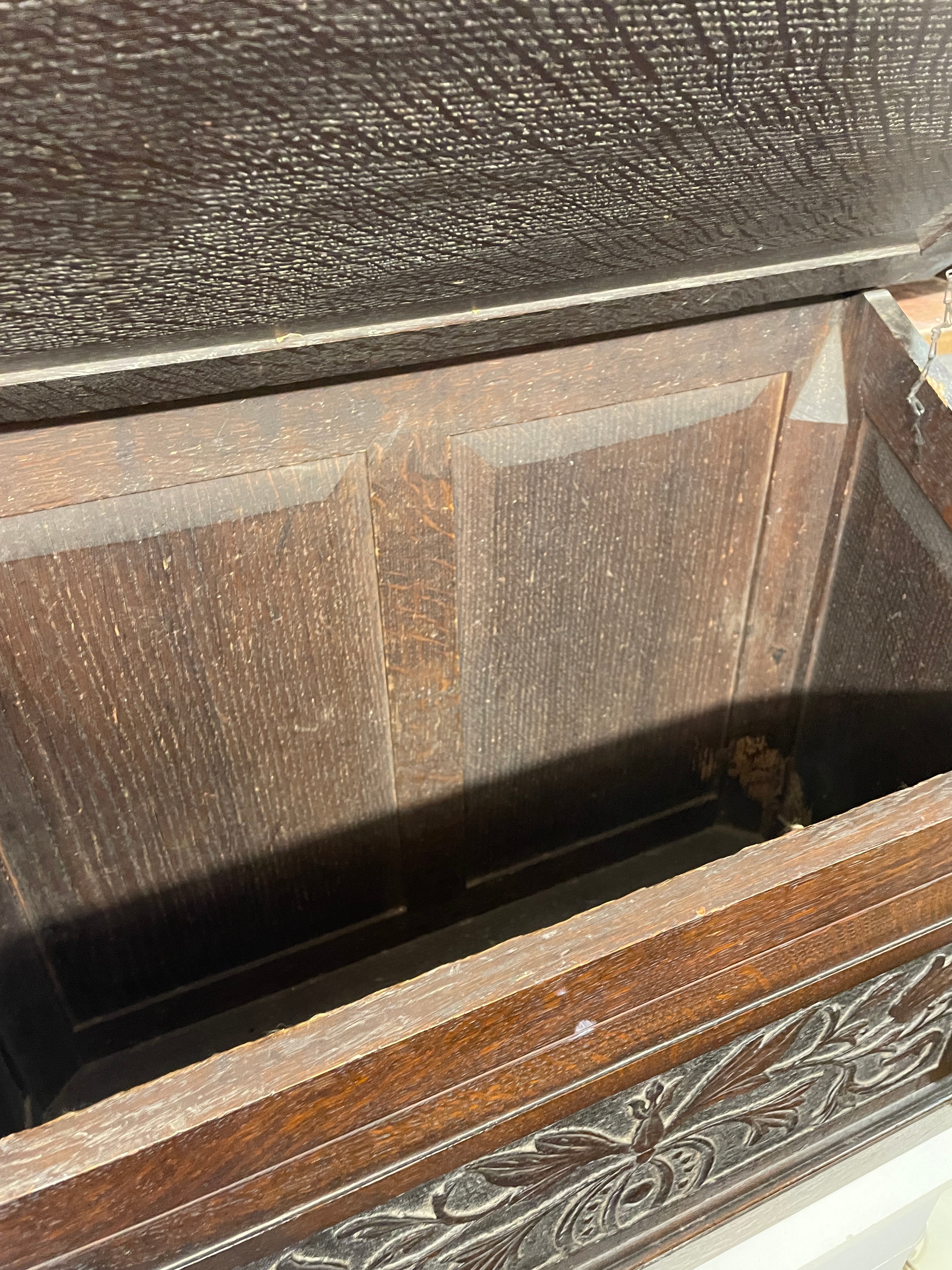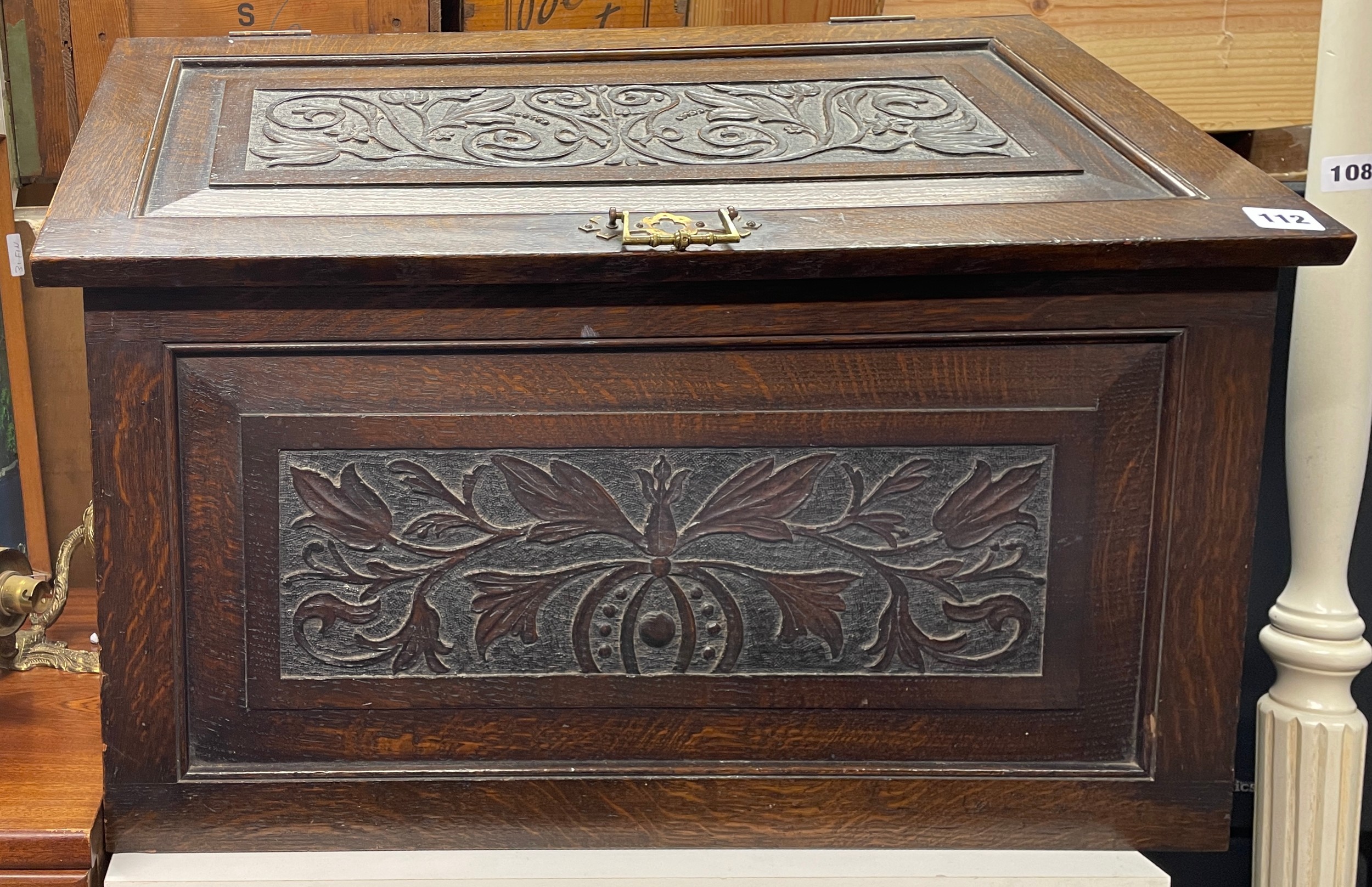 OAK CARVED PANEL SLANT FRONTED BOX