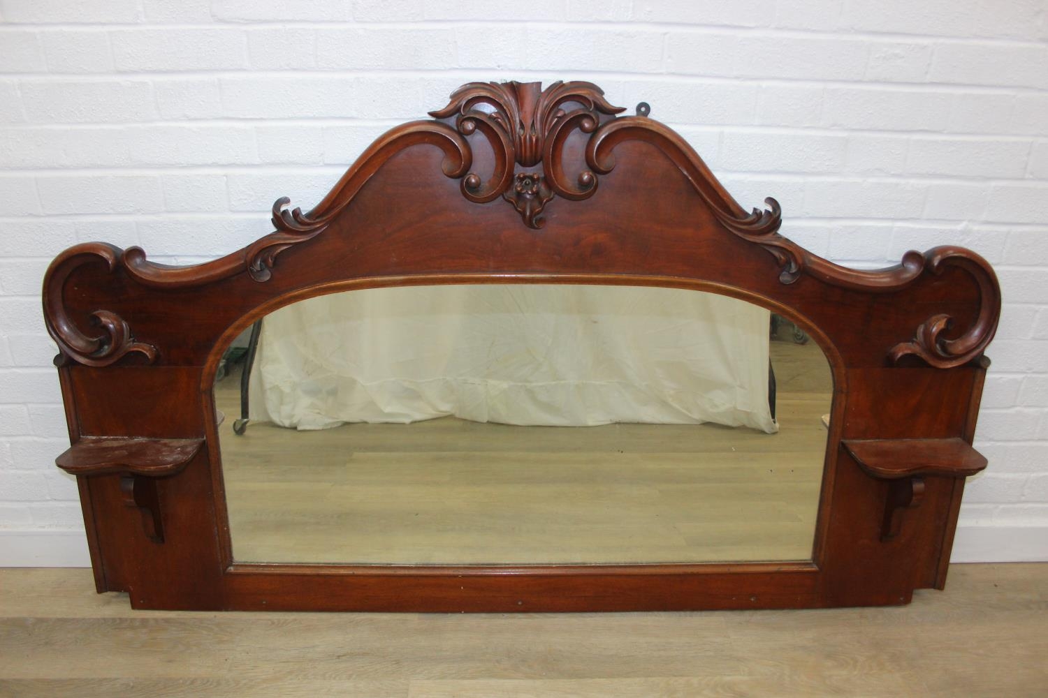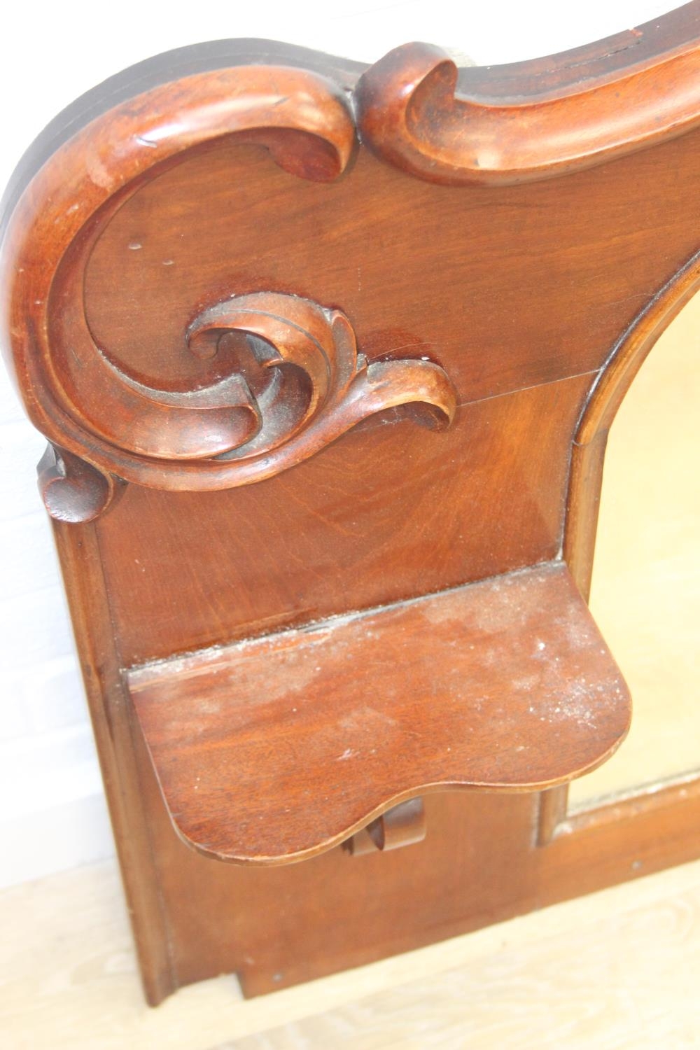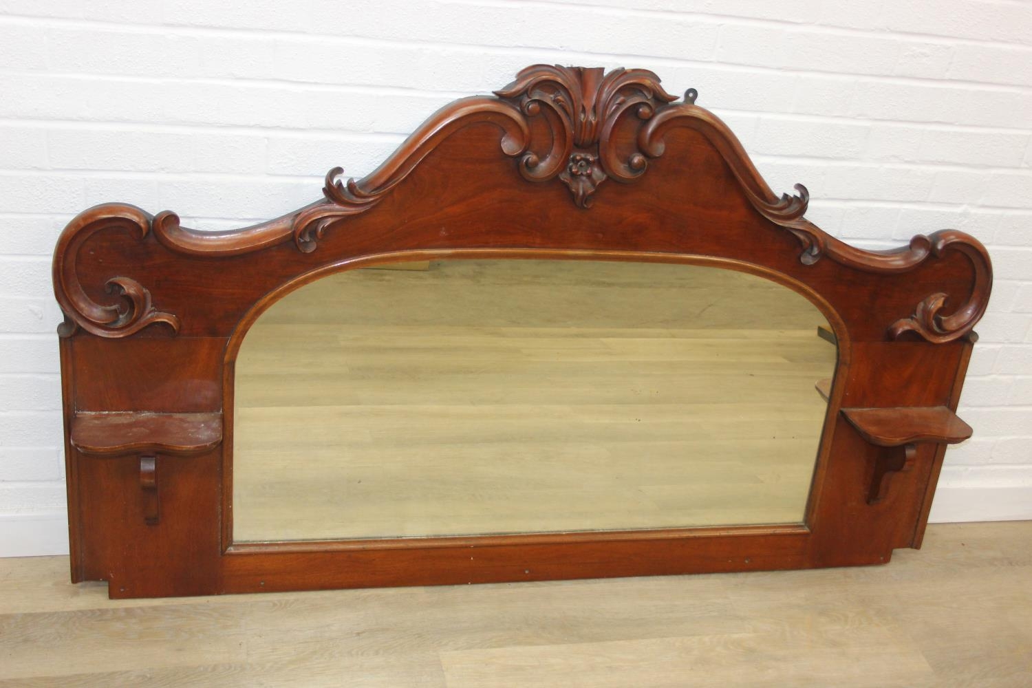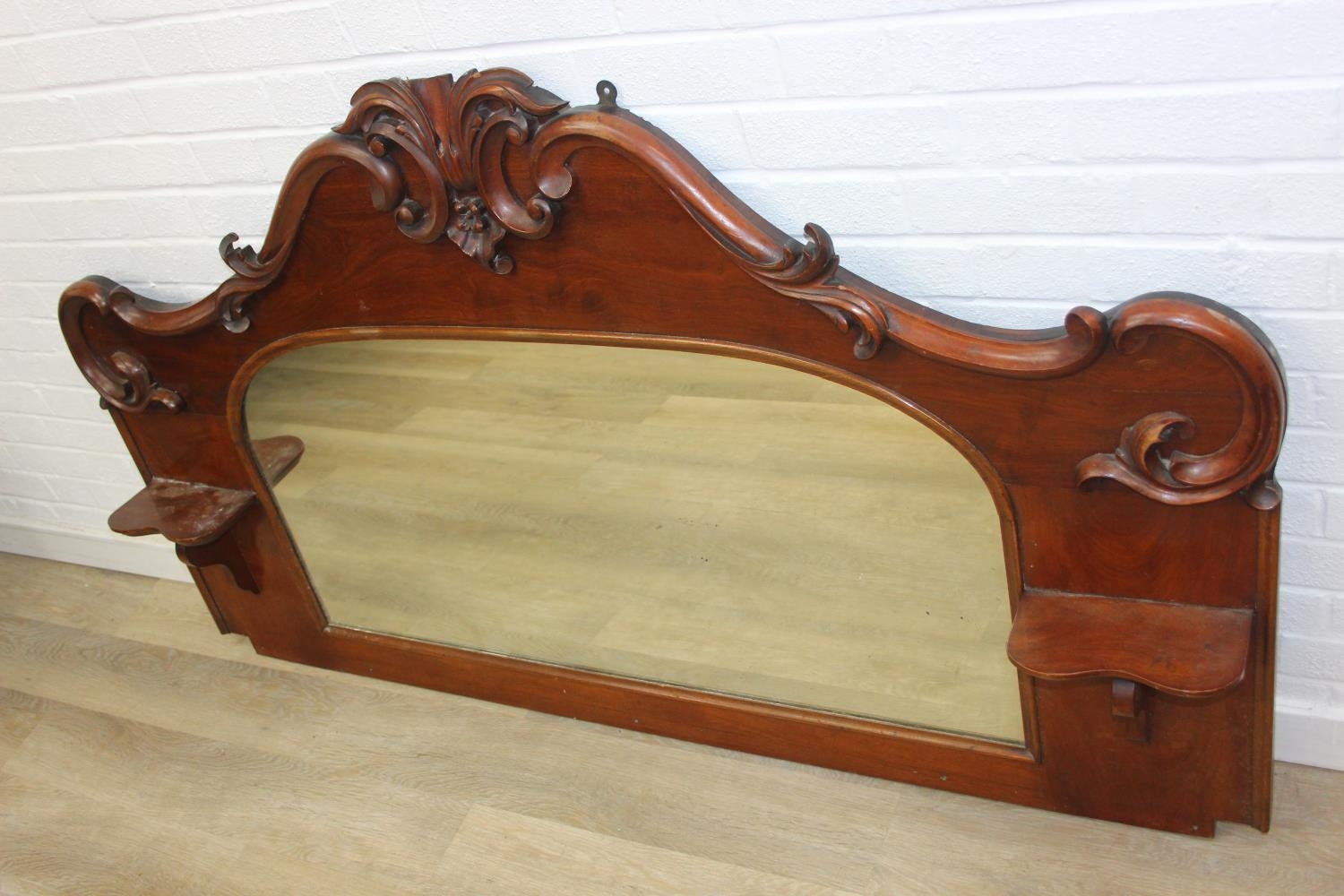 Antique over mantle mirror in mahogany frame with carved details and two display shelves, 165cm x 99cm