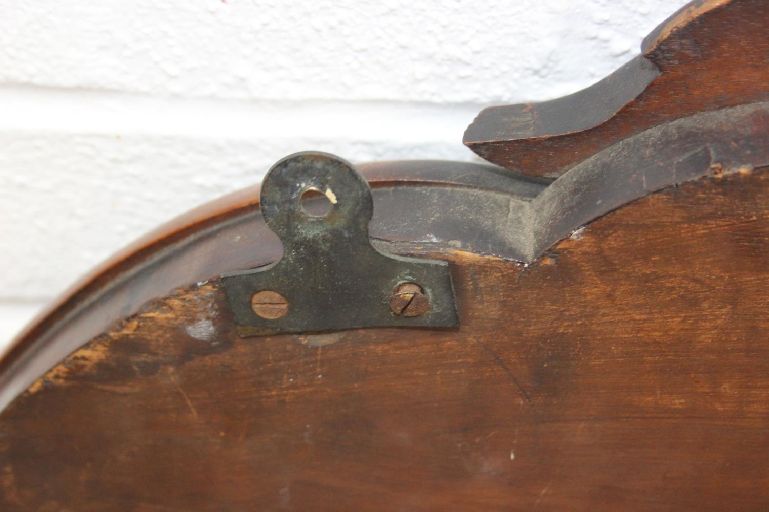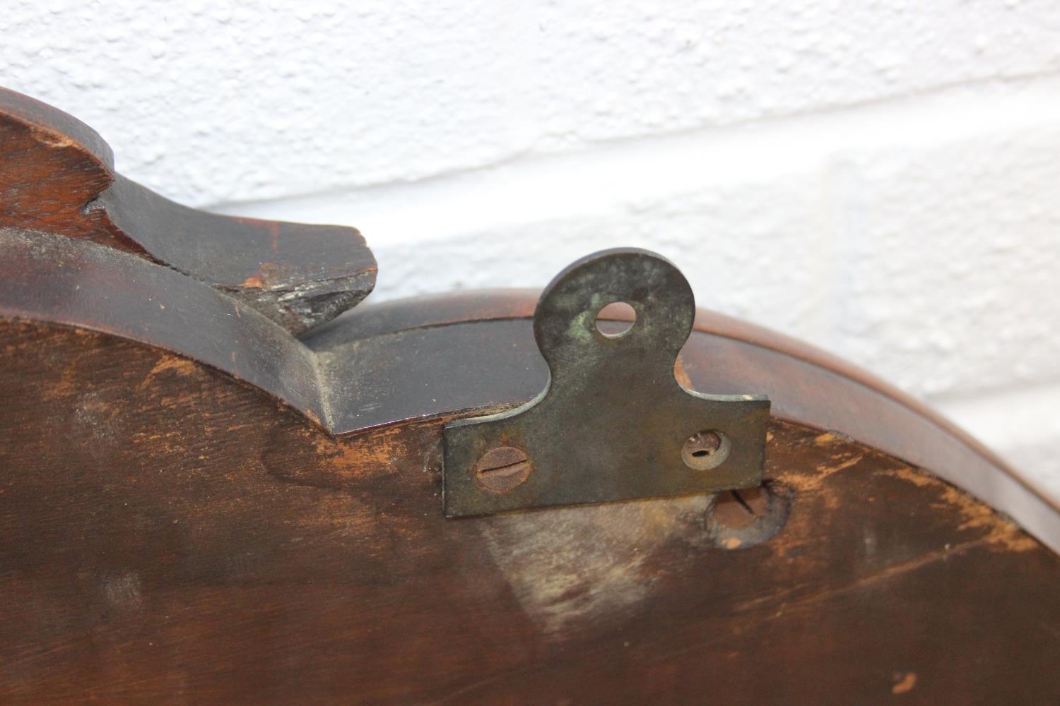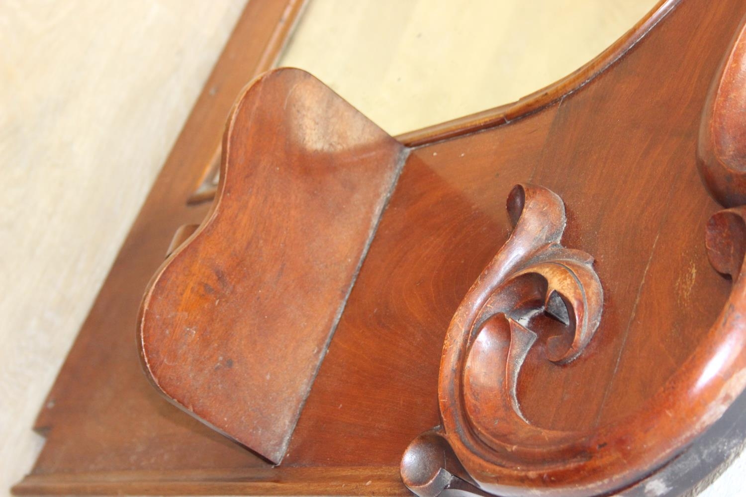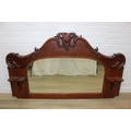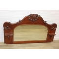 Antique over mantle mirror in mahogany frame with carved details and two display shelves, 165cm x 99cm