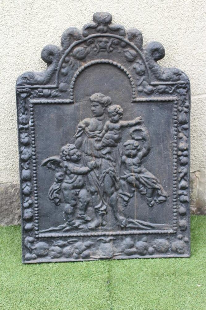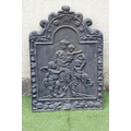A CAST IRON FIRE BACK, 19th century, in the early 18th century style, the arched panel with scrolled crest and featuring an allegorical female figure (Charity?) holding a child and flanked by cherubs, within beaded and floral borders, 24" x 35 1/2" (Est. plus 21% premium inc. VAT)