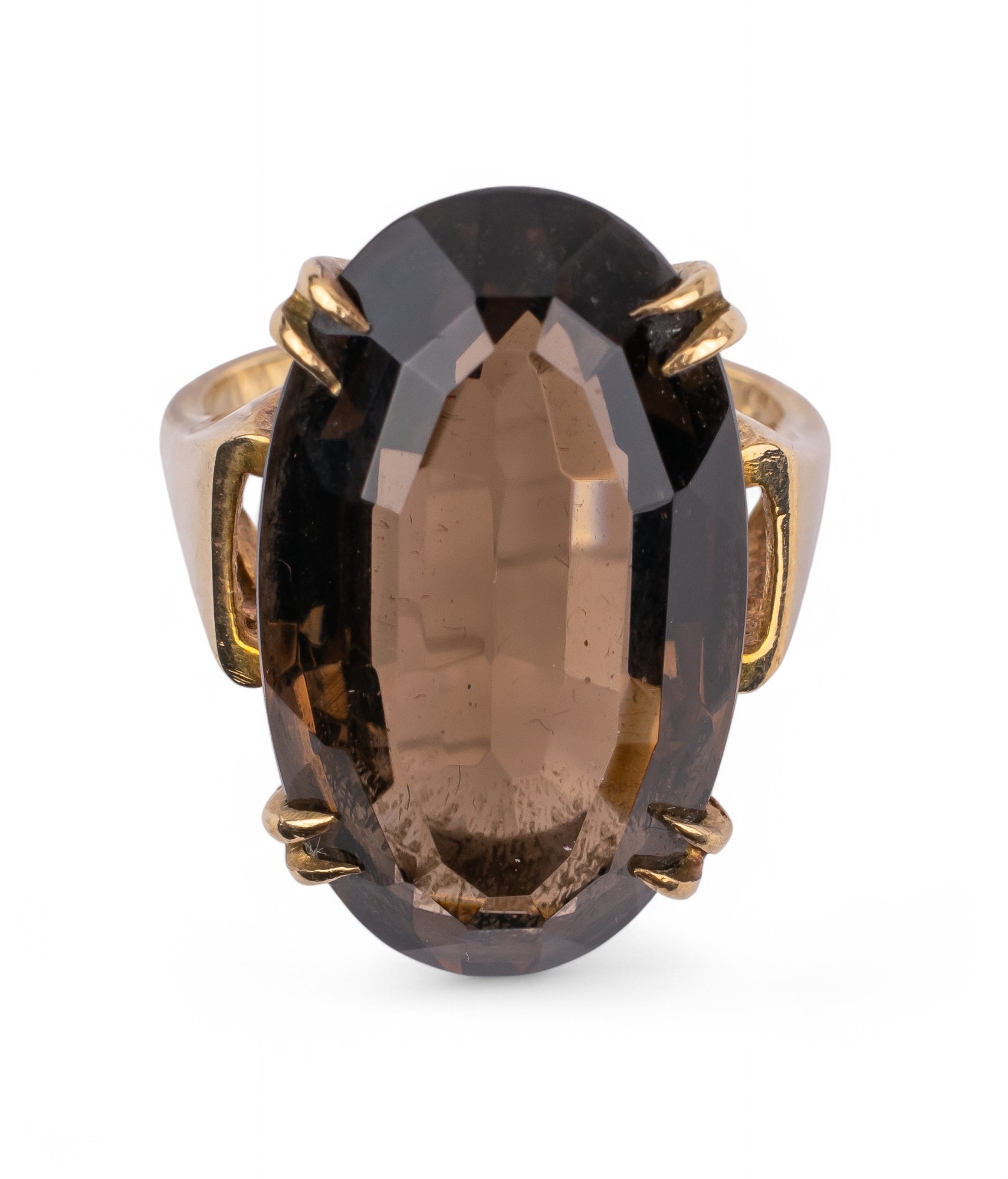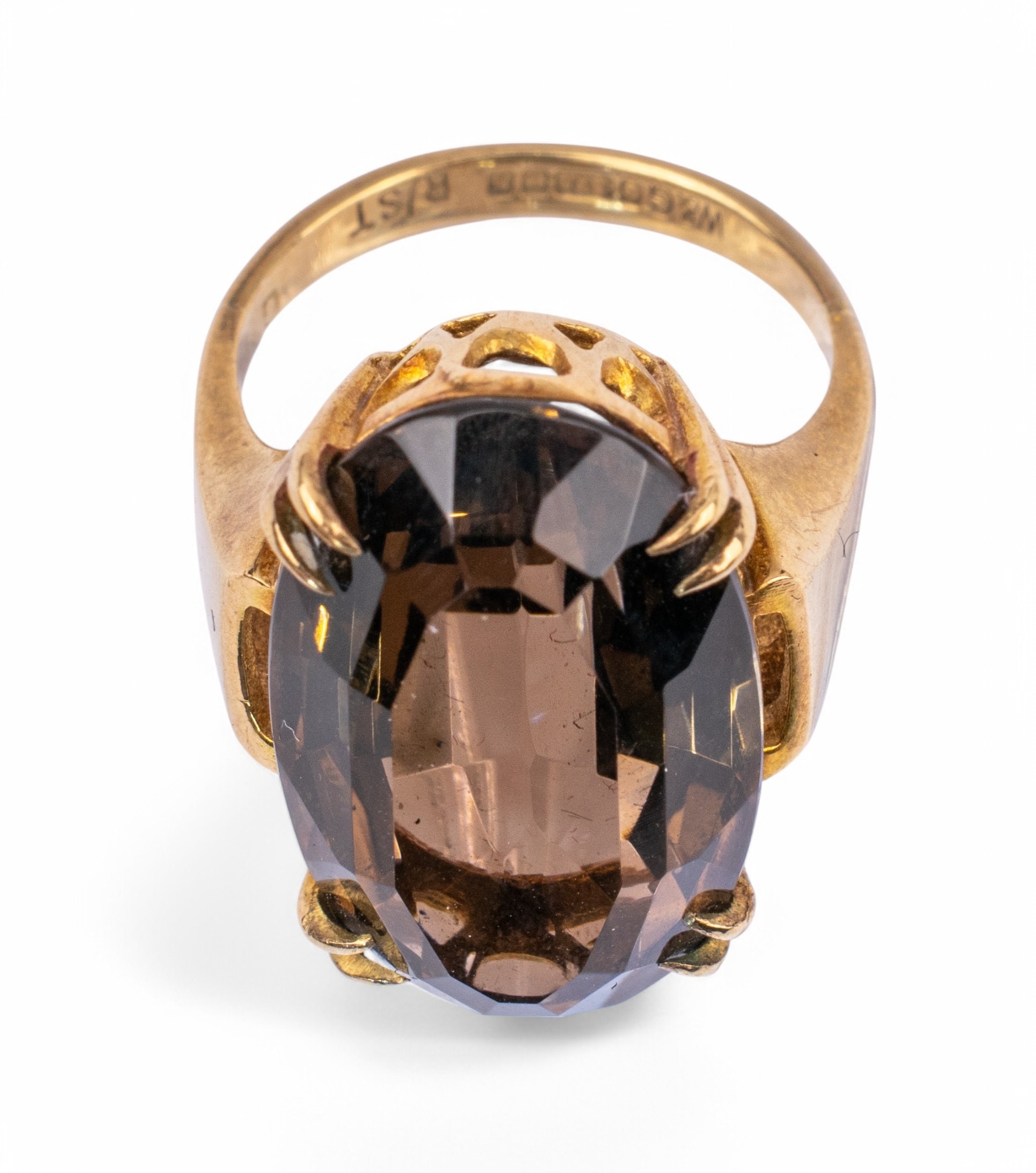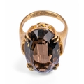 A 9 carat gold and oval mixed cut smoky quartz dress ring