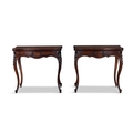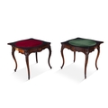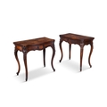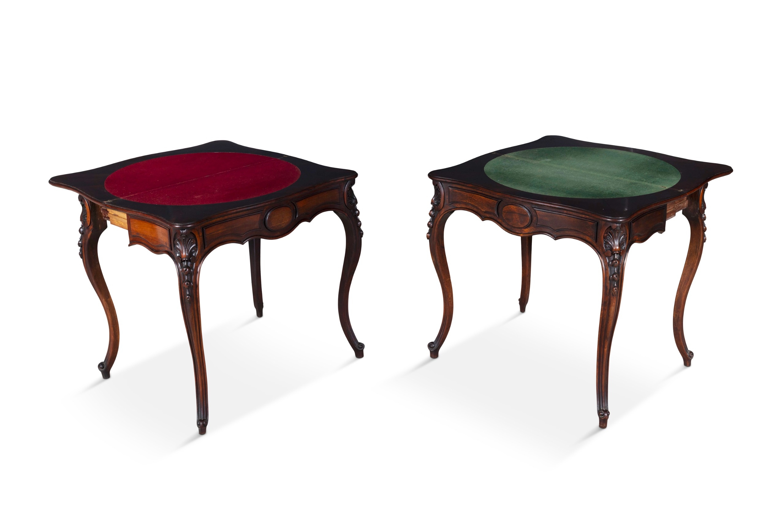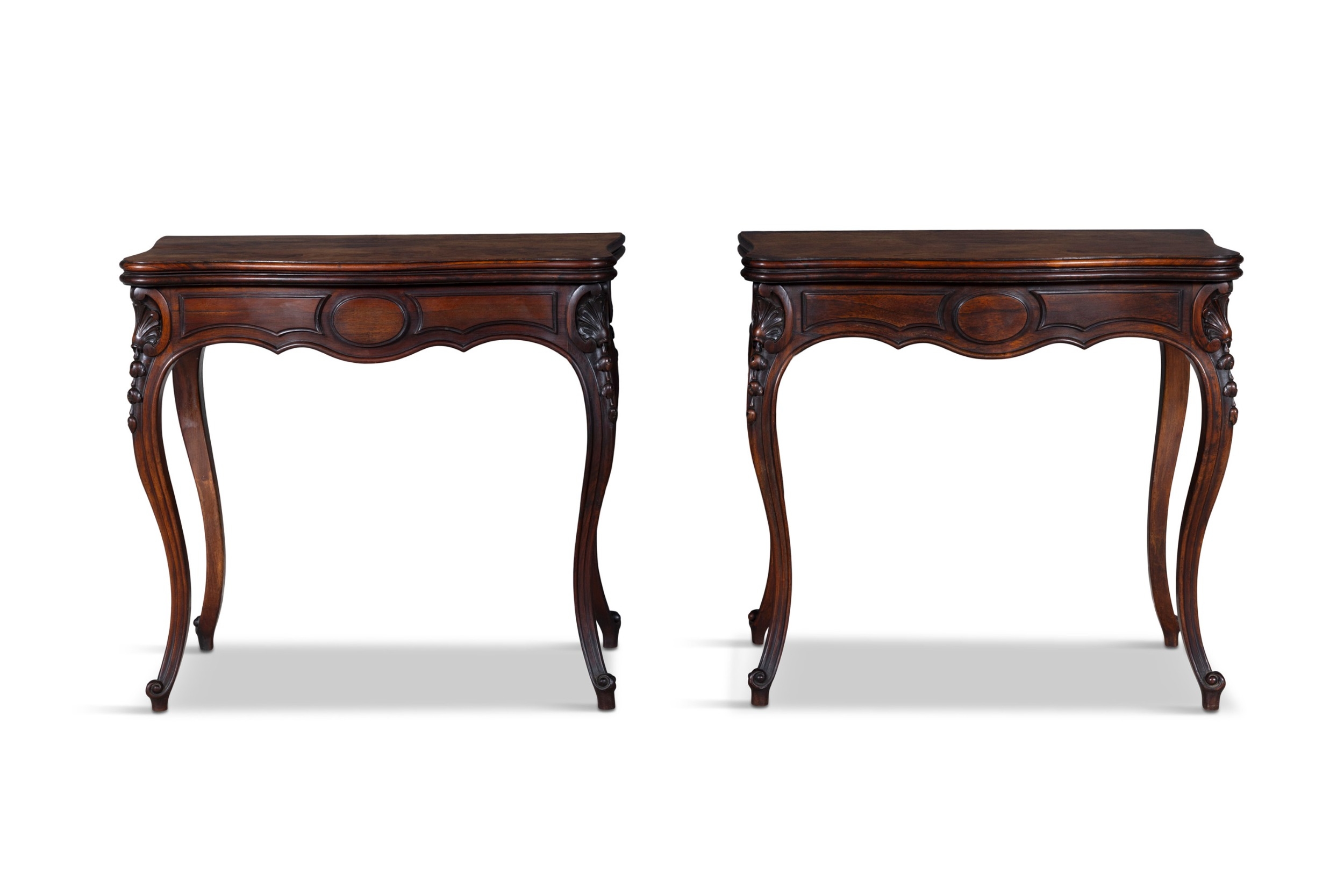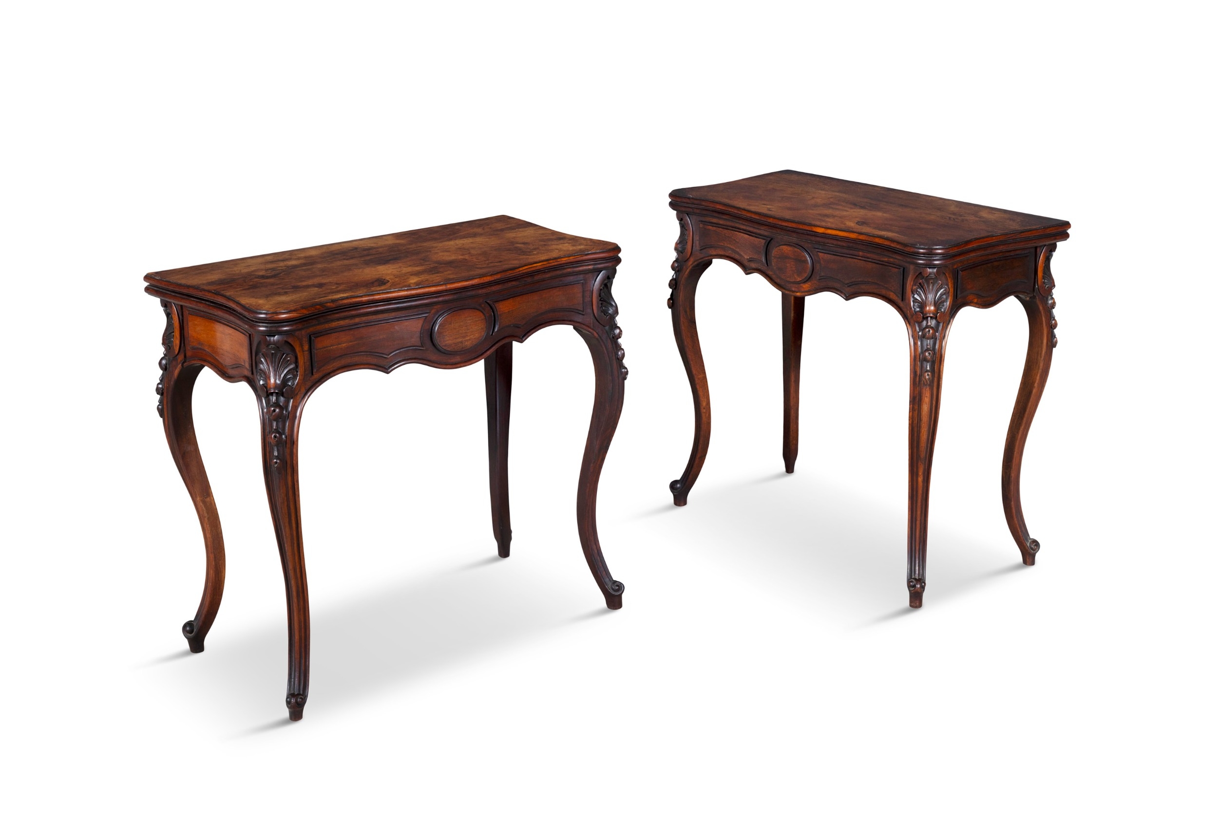 A PAIR OF ROSEWOOD FOLD TOP CARD TABLES, 19TH CENTURY of serpentine form, the moulded top opening to reveal a green baize lined interior above a concealed storage section, on shell capped cabriole legs and scroll feet. 76cm high, 82cm wide, 41cm deep (when closed)