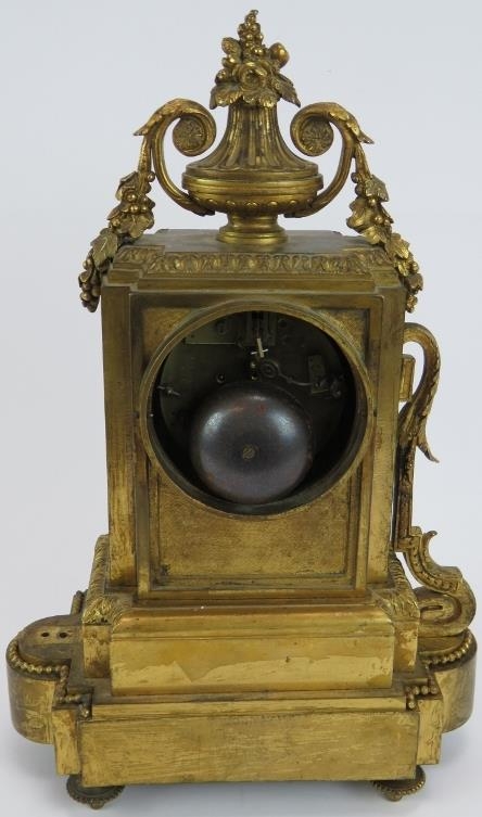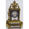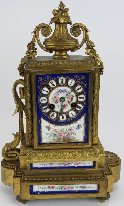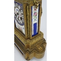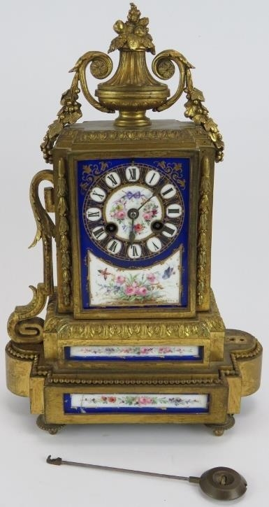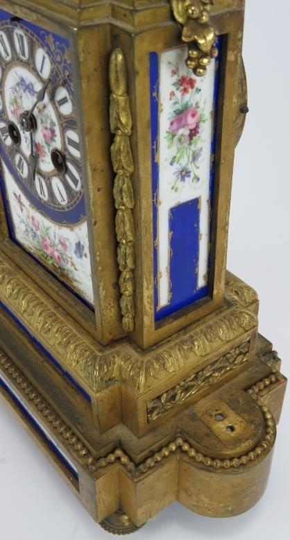 A 19th Century French bronze Ormulu striking mantel clock with hand decorated porcelain dial and panels. Movement stamped, Vincenti &Co. No 27925*2. Height: 34cm. Pendulum present.