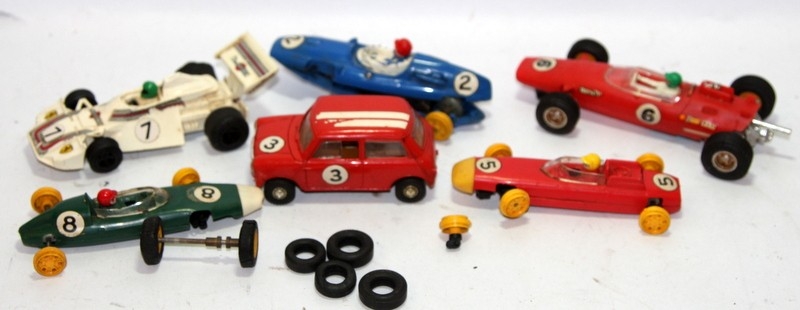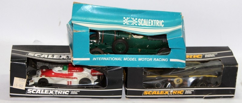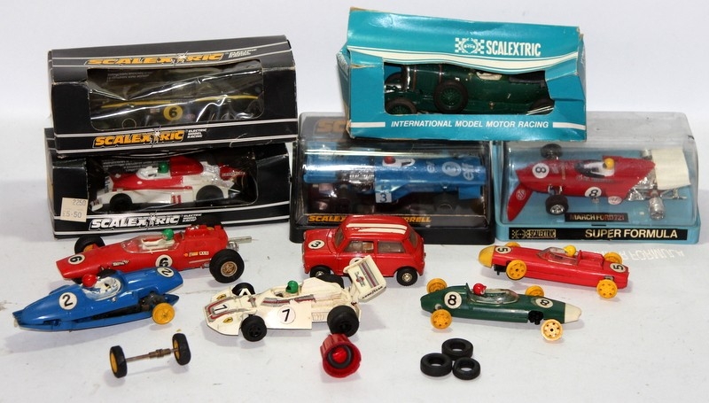A collection of vintage Scalextric slot car vehicles, some boxed, some for spares/repair (Bentley Blower wrong box)
