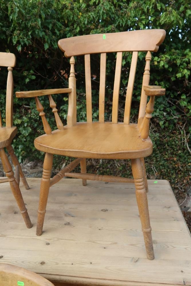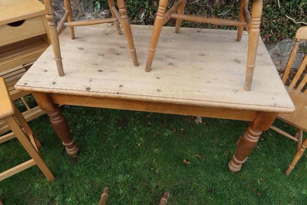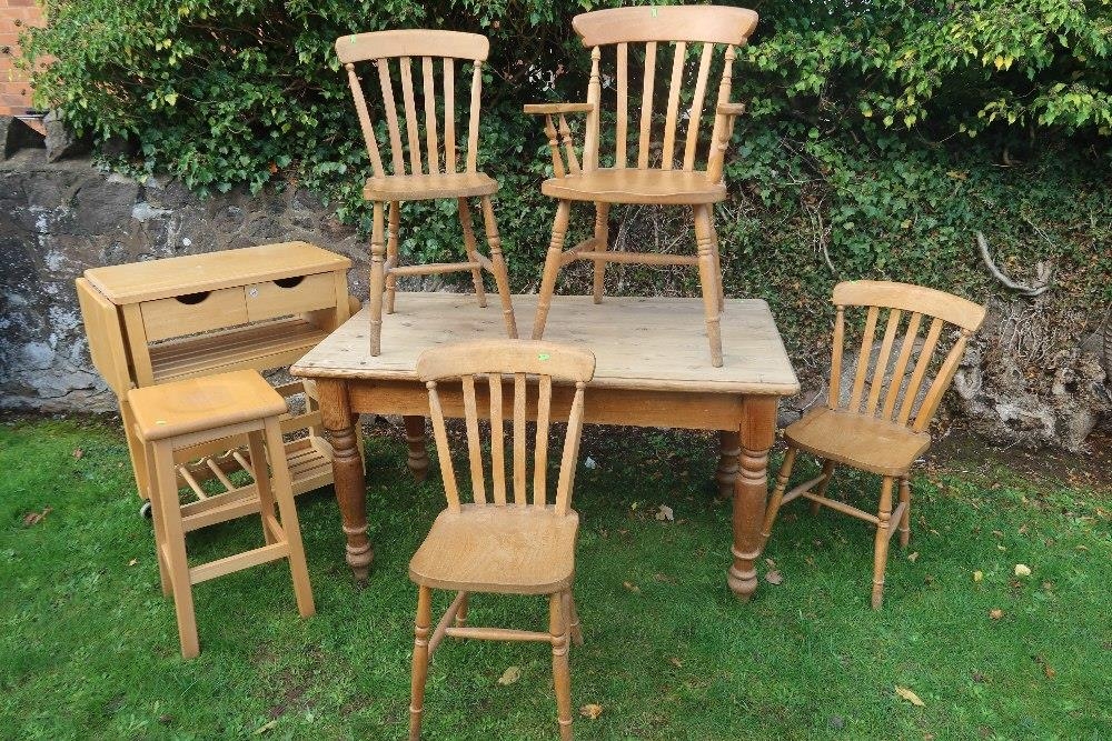 A pine kitchen table , 54ins x 29ins, height 30ins together with 4 kitchen chairs, a trolley and a stool