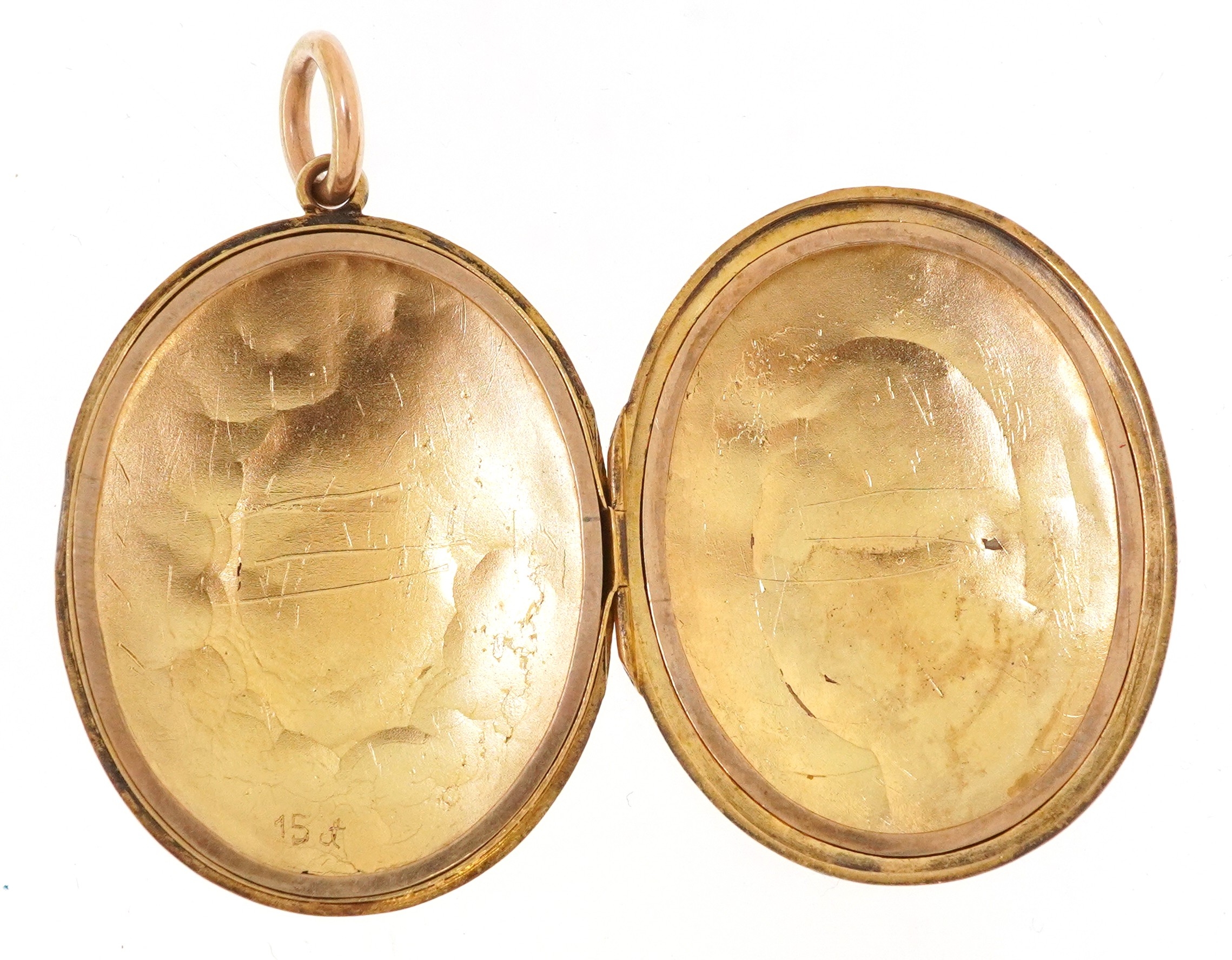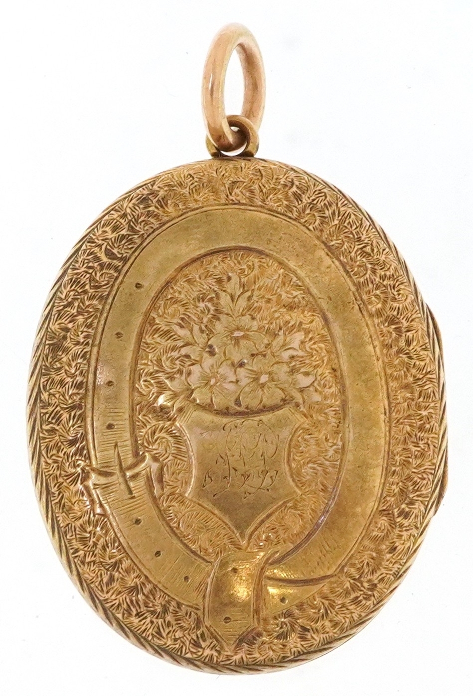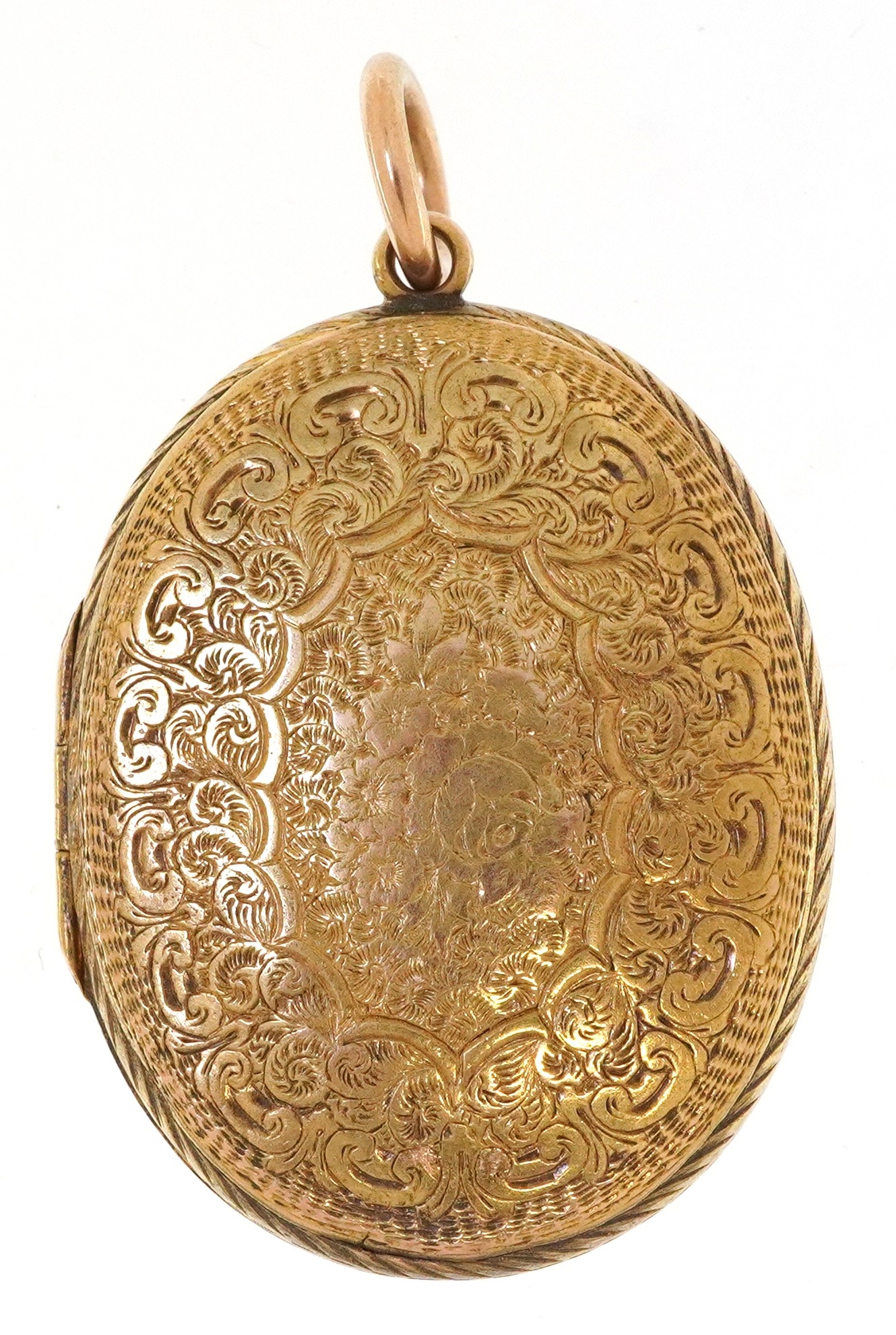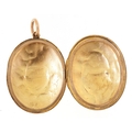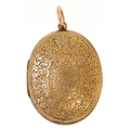 A Victorian 15ct gold locket finely engraved with foliage and an eternity belt, 3.7cm high, 9.9g.