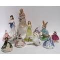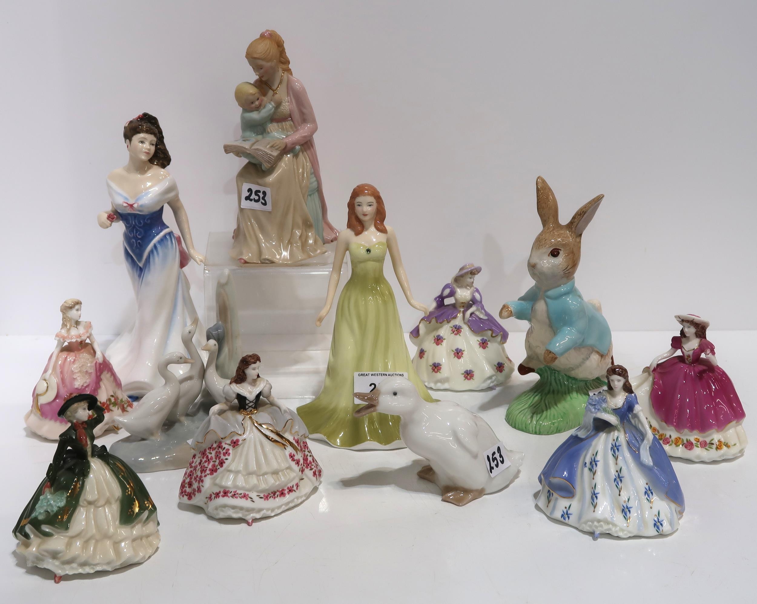 A collection of Coalport miniature ladies two Doulton ladies, a Beswick Beatrix Potter Peter Rabbit figure, Nao geese and a Franklin Mint figure
