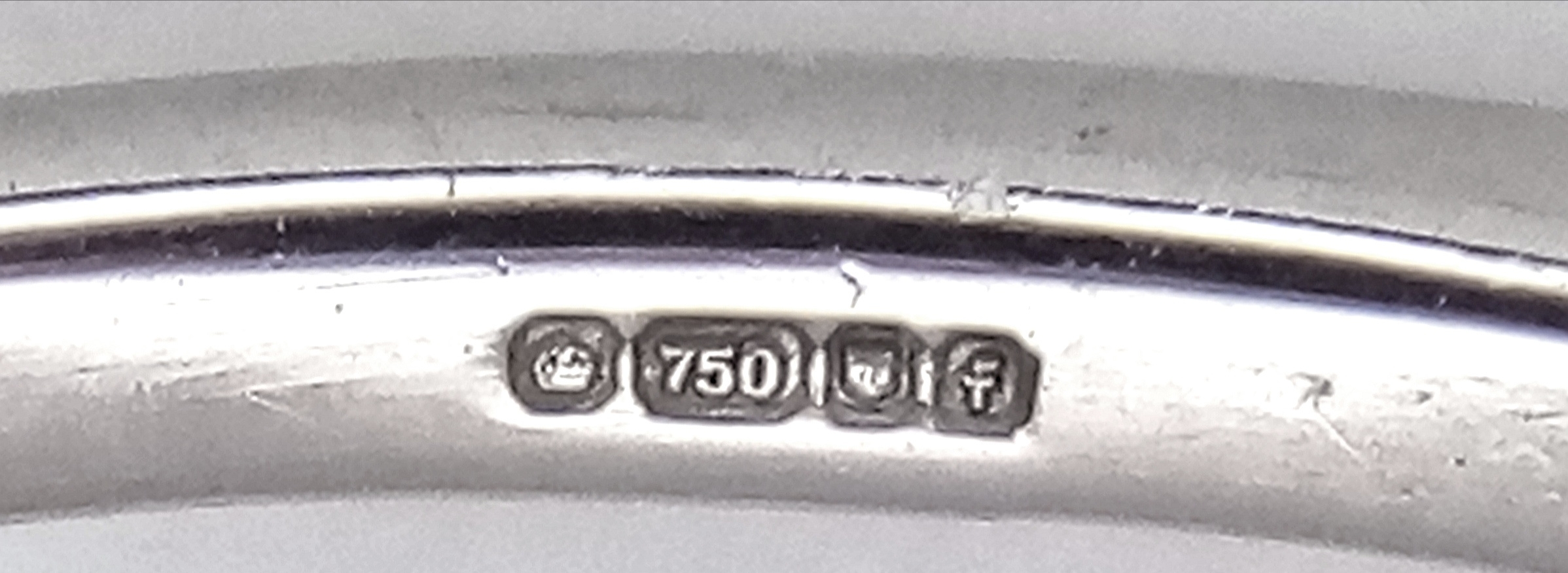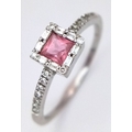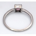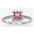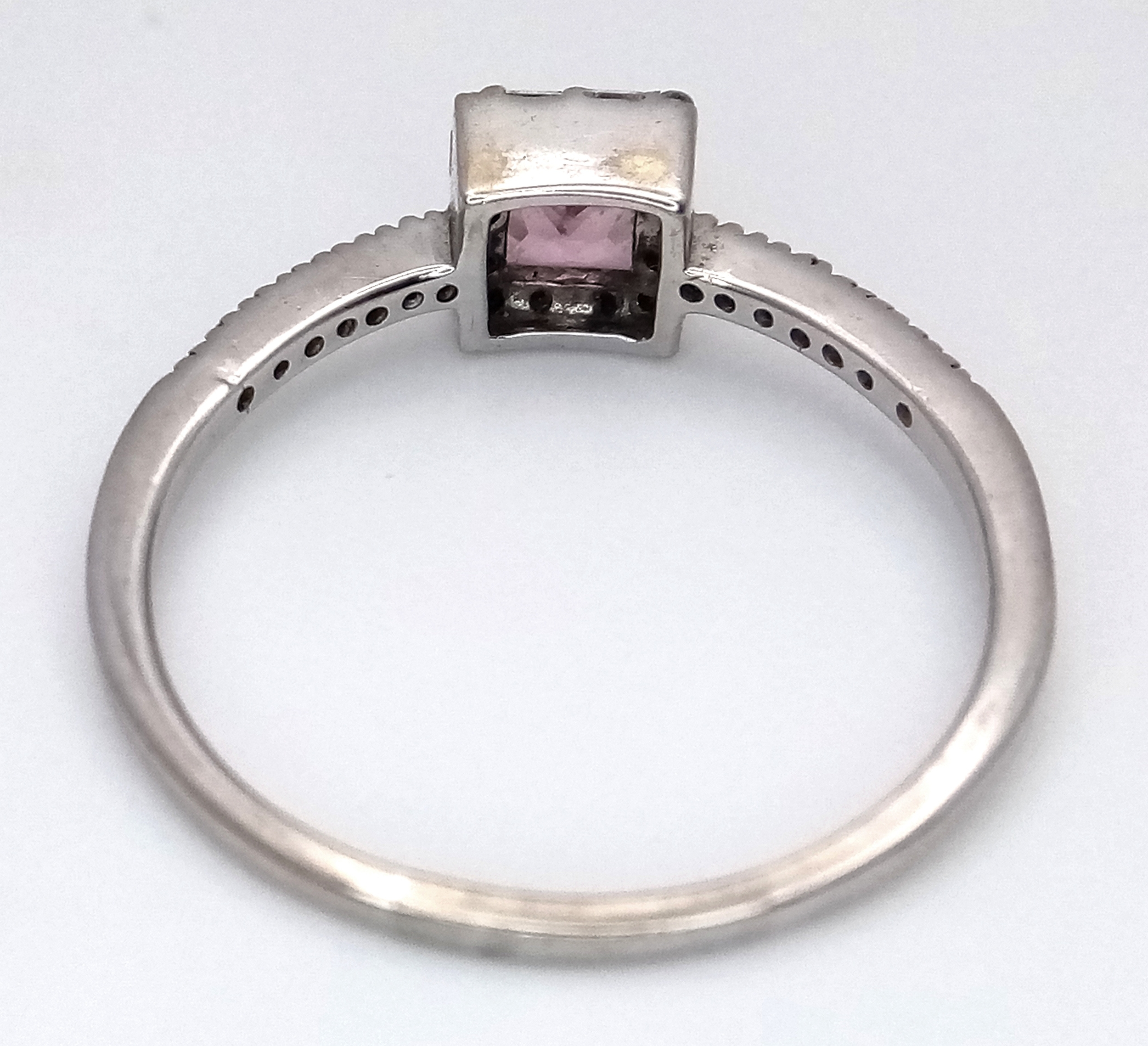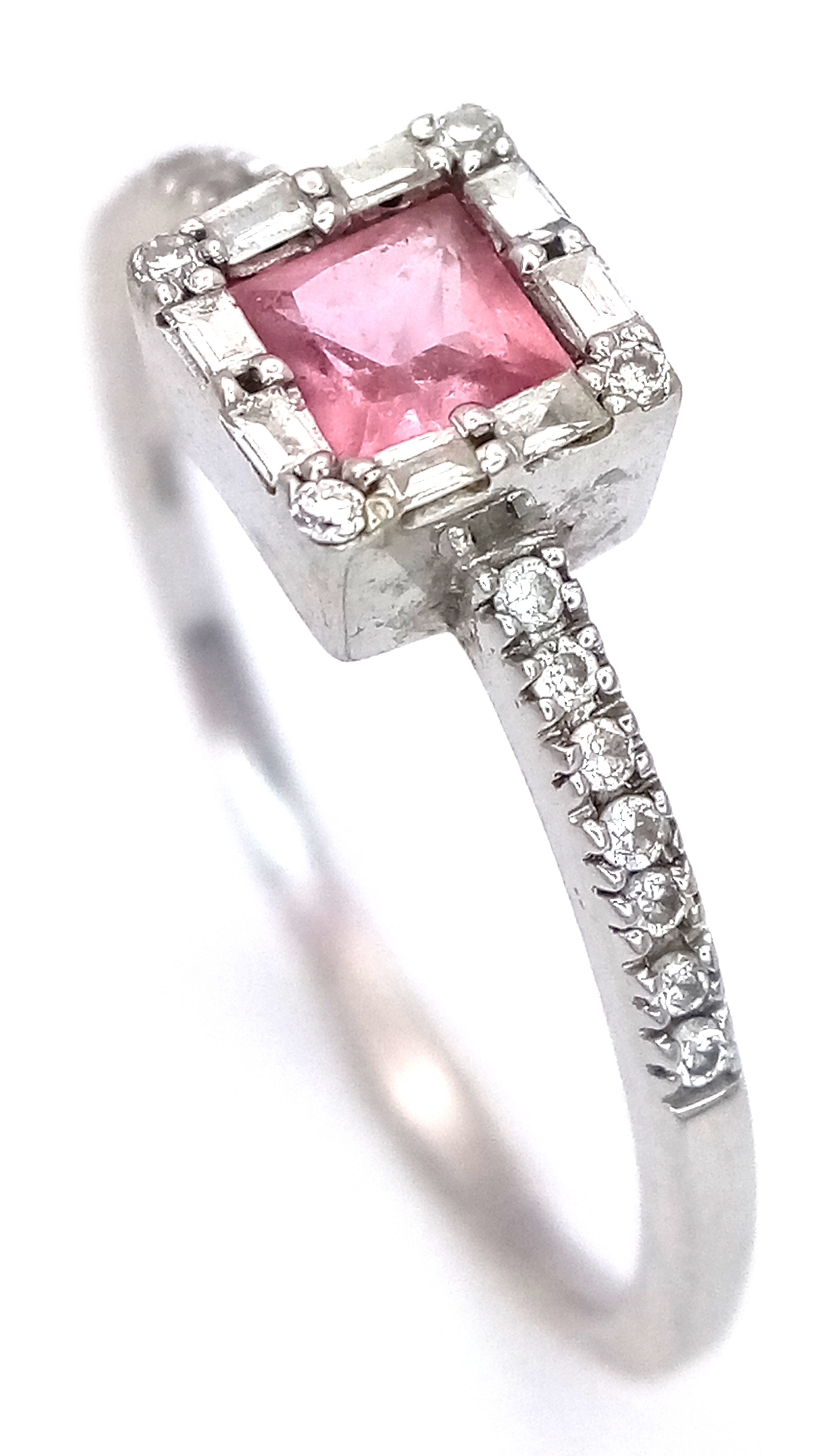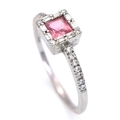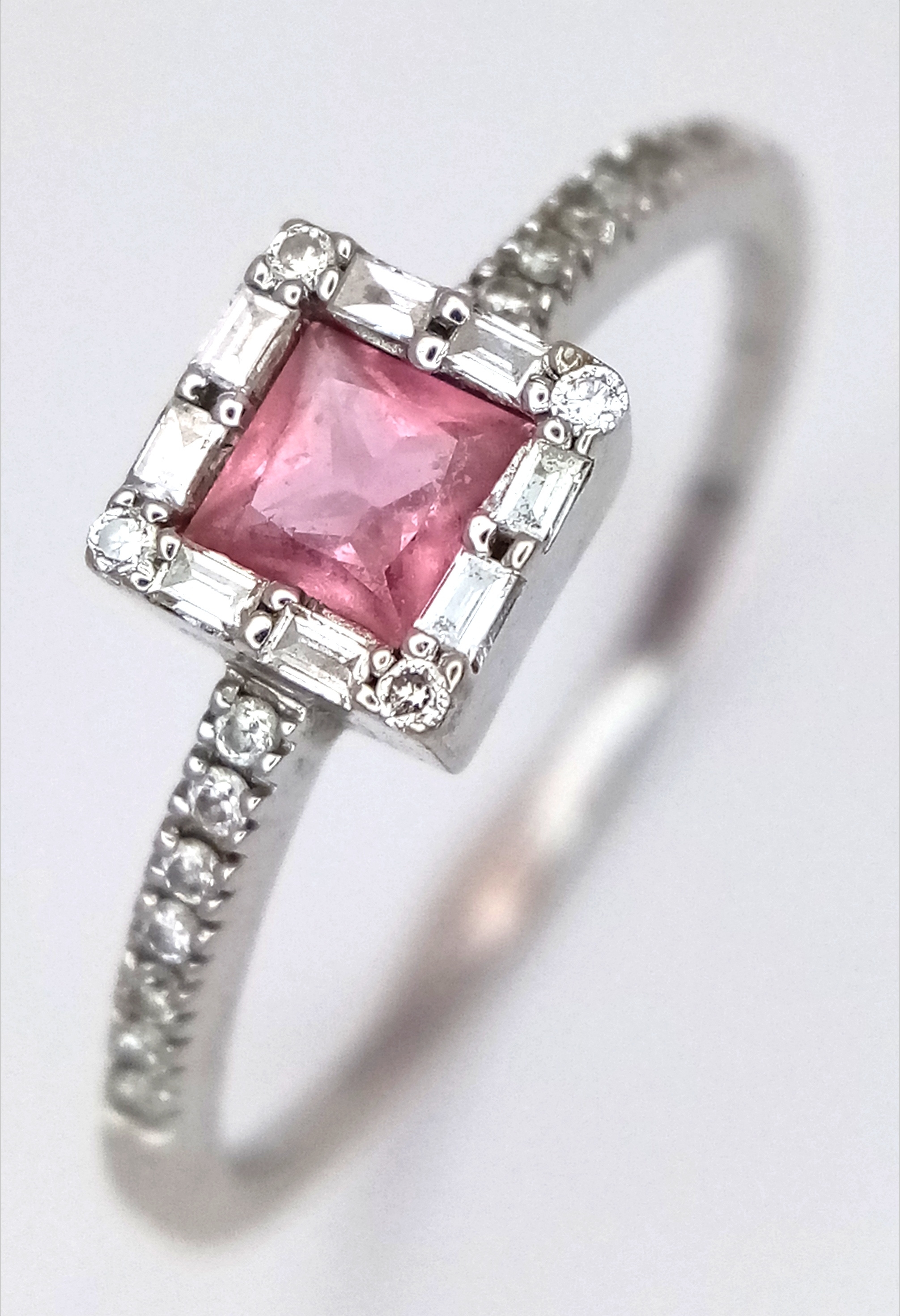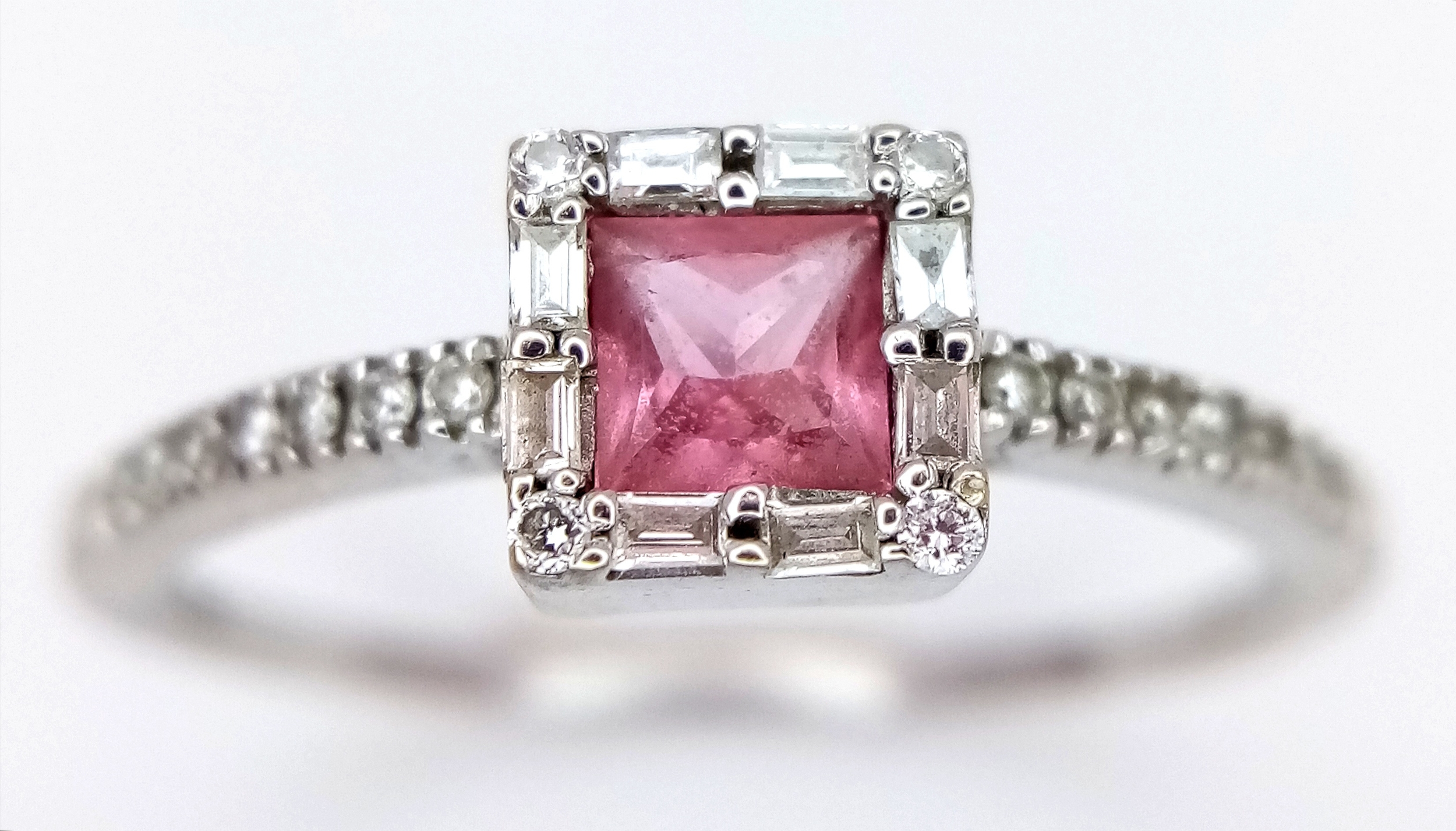 An 18K White Gold, Diamond and Pink Sapphire Ring. Princess cut sapphire with baguette diamond surround. Round brilliant cut accents. c. 0.40ctw diamonds. Size S. 2.75g.