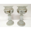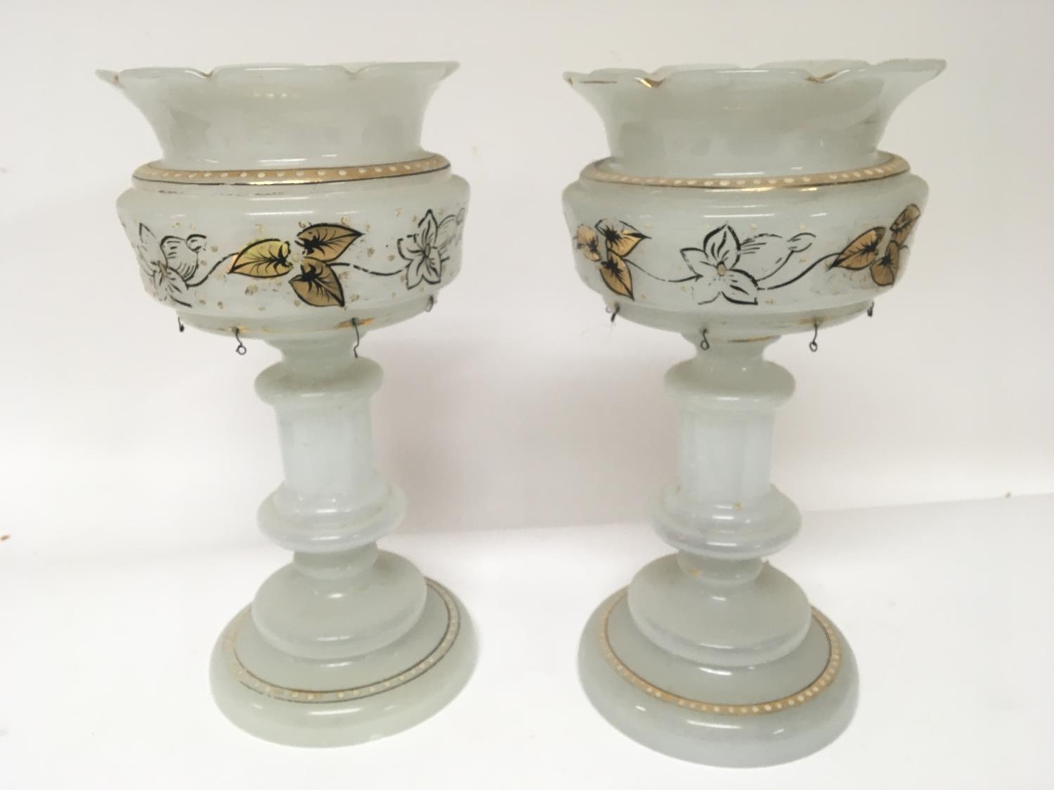 A pair of Victorian glass opaque lustres decorated with gilt Hight 30cm no obvious damage no glass drops.