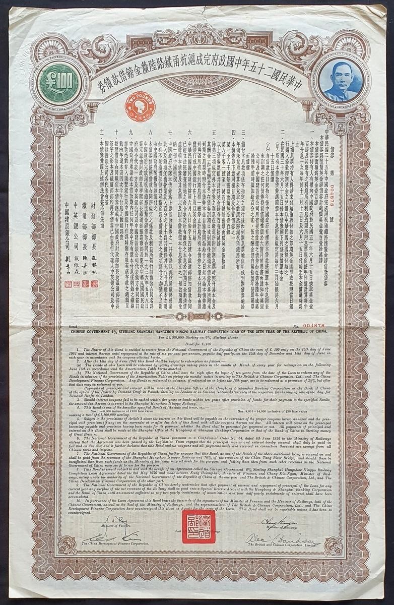 China: 1936 6% Shanghai Hangchow Ningpo Railway Completion Loan, £100, #004878, very large format, brown, blue and green, with coupons. Small tear at top edge, GVF.